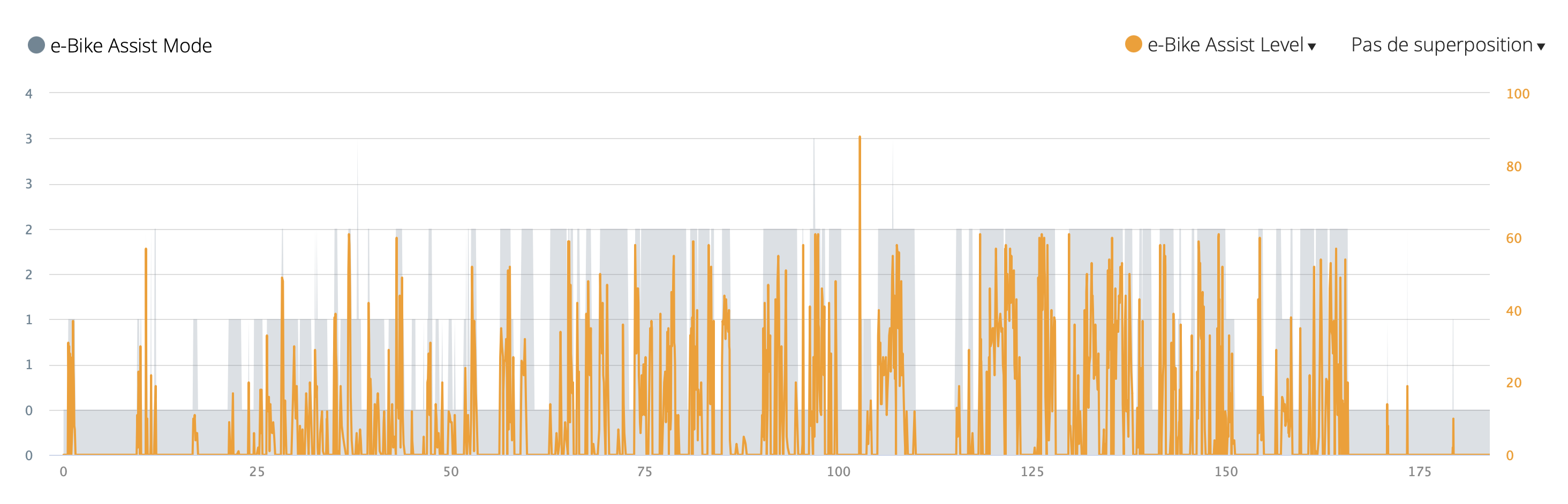 On « spoile » un peu la vidéo, mais c’est une précision importante que nous voulons apporter : nous avons très majoritairement roulé avec le moteur allumé. Mieux, même : le mode que nous avons le plus utilisé est le mode « trail », soit le mode d’assistance intermédiaire. Nous n’avons certes quasi jamais utilisé le « Boost » (le plus puissant) mais nous n’avons clairement pas passé tout notre temps en Eco ou en Off non plus. Au-delà des mots, les graphiques issus de notre montre Garmin équipée de l’application Orbea sont là pour le démontrer comme vous pouvez le voir ci-dessus.