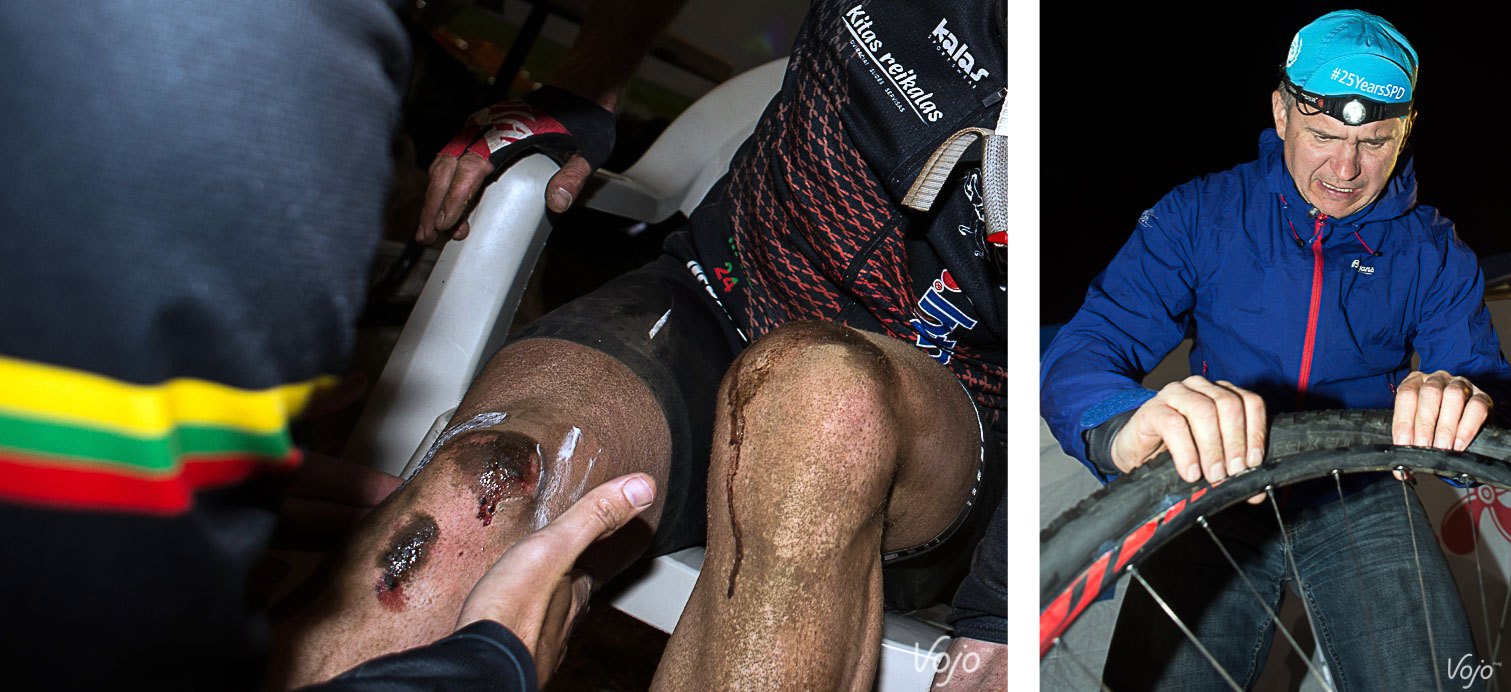 La nuit, c’est aussi le moment le plus difficile pour Amélie, d’abord parce que la température moyenne est drastiquement descendue (proche des 0° !) mais aussi parce que c’est très dur pour elle de me voir de plus en plus fatigué m’enfoncer seul avec mon vélo dans cette nuit, sur un circuit de plus en plus piégeux et où les risques de chute ou de défaillance s’accroissent tour après tour…
