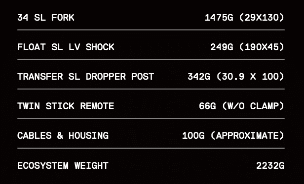 La commande pèse 66 grammes seule, et 76 grammes avec le collier. Sur la balance, le système dans sa totalité (fourche SL, tige de selle et commande) entend jouer des coudes pour une place parmi les références les plus légères du marché… avec 130 mm de débattement.