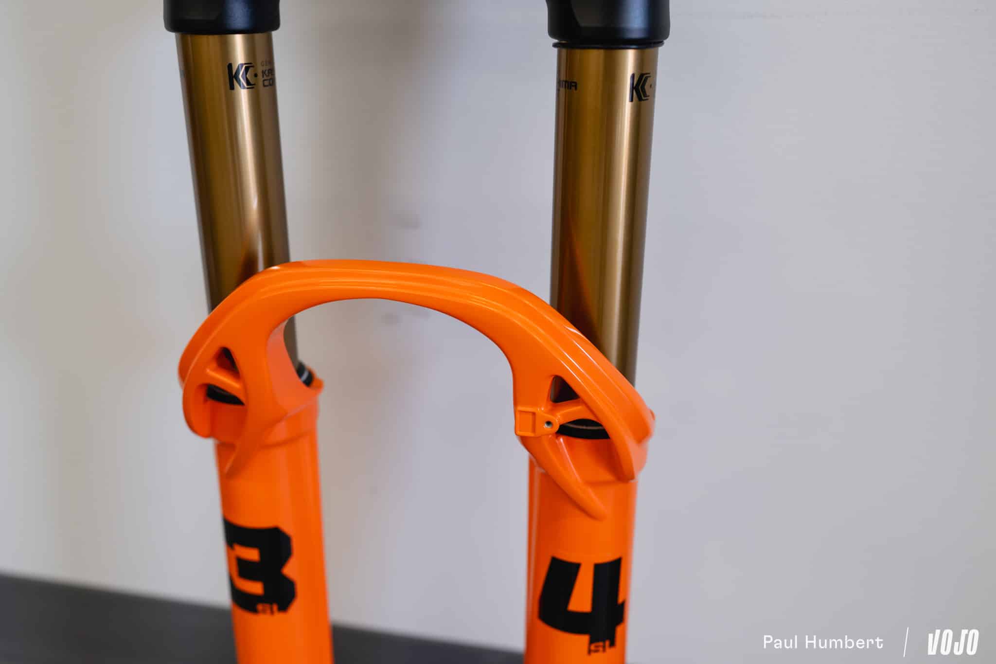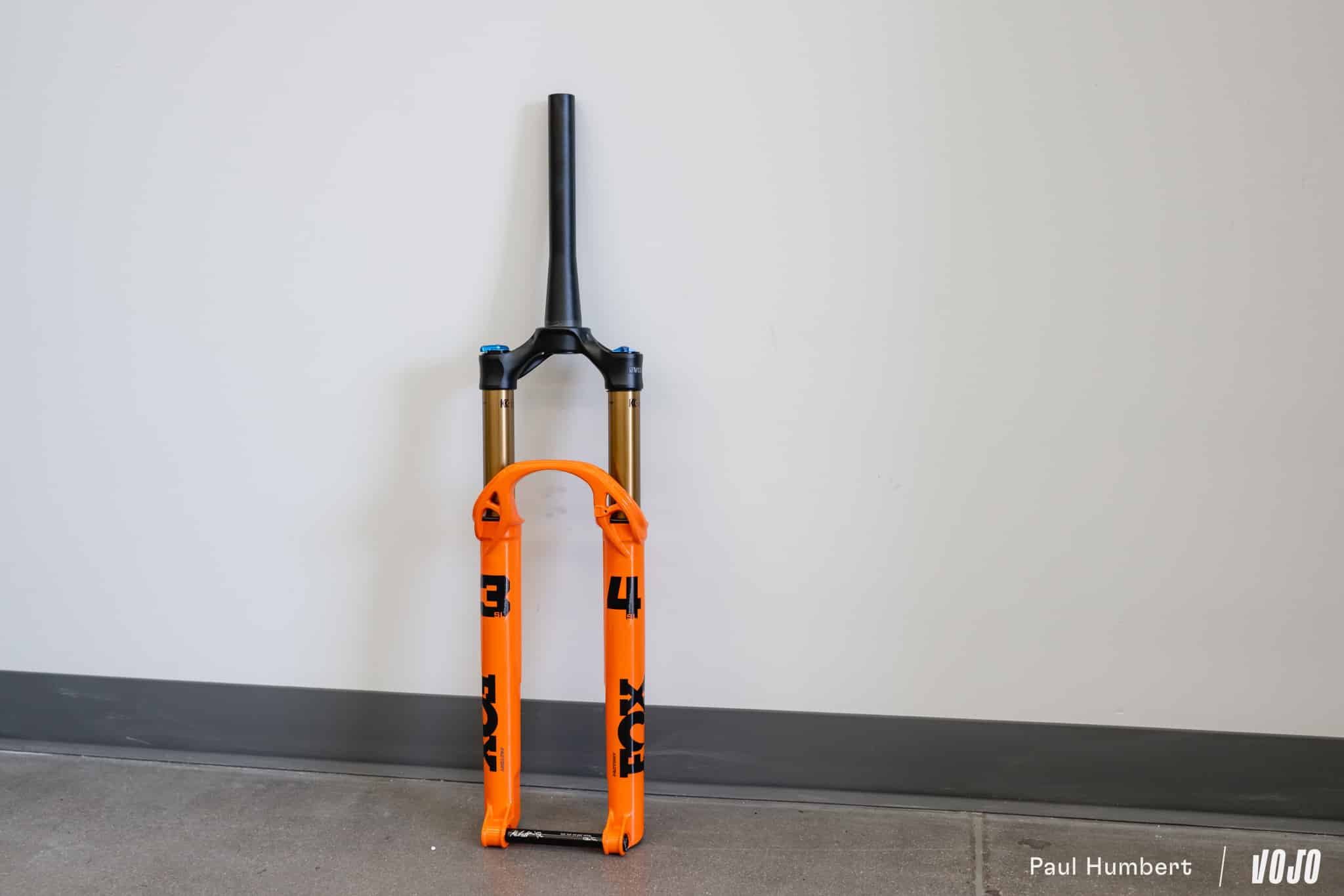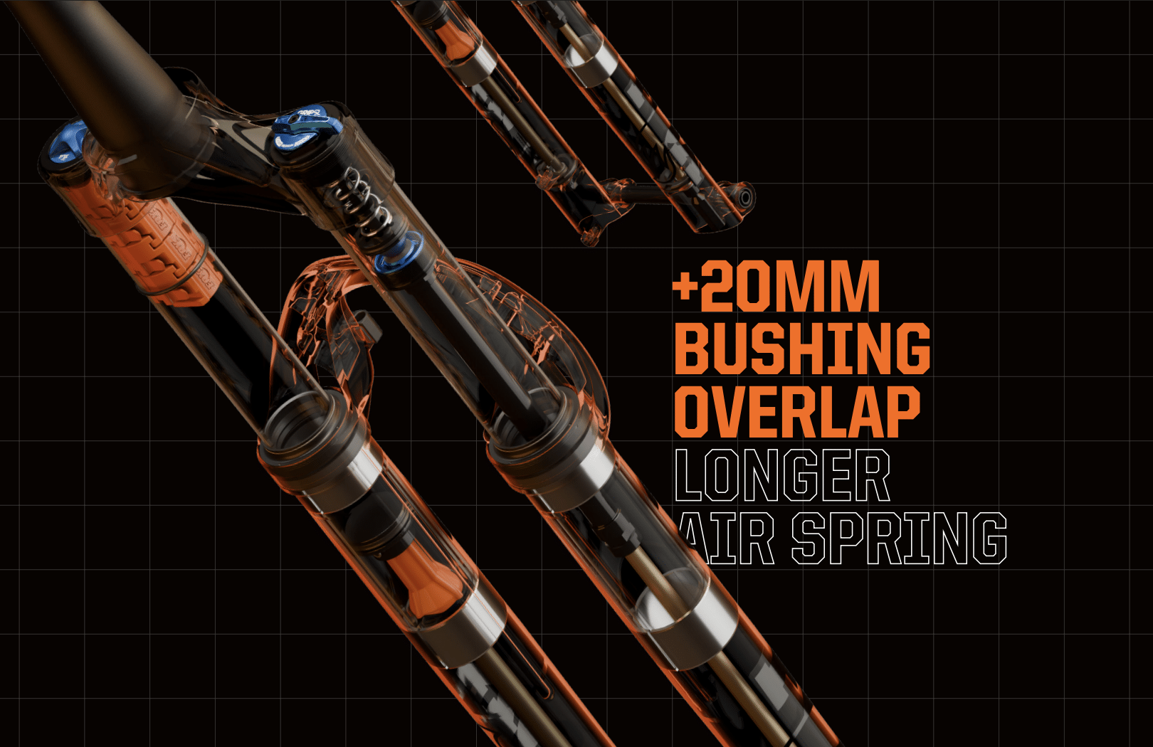 Avec sa construction allégée baptisée « step-cast » et reconnaissable à son fourreau gauche « creusé », Fox n’arrivait pas à proposer un volume d’air suffisant pour offrir 130 mm de débattement. La construction du châssis est donc complètement revue pour offrir 110, 120 ou 130 mm de débattement, sans considérablement augmenter le poids de la fourche.