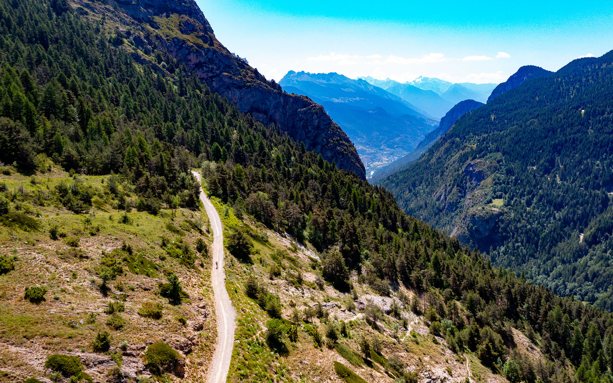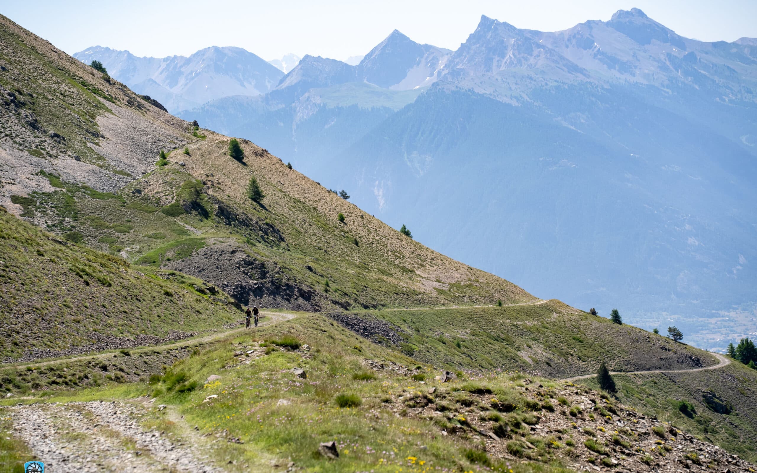 Le deuxième jour est une étape de transition qui nous amène à Saint-Chaffrey. Après une rapide montée roulante, nous empruntons une magnifique descente sur Vallouise. C’est un single naturel en bord de ruisseau, avec du grip, de la bonne terre, des racines, un pur régal. Nous arrivons une fois de plus à quatre au pied de la deuxième difficulté. Il semblerait que nous n’allons pas nous lâcher de toute la semaine. La deuxième montée est très exigeante et ses pentes raides nous imposent de descendre du vélo régulièrement.