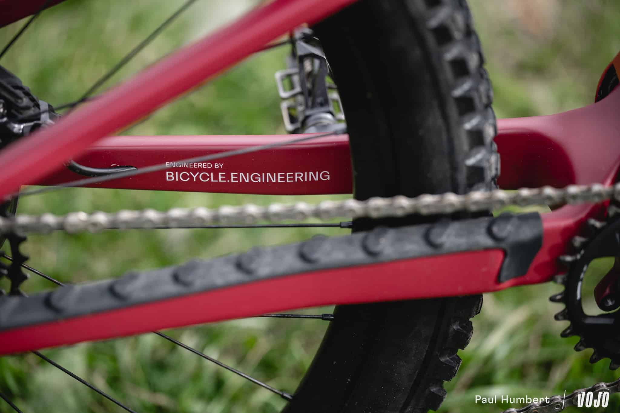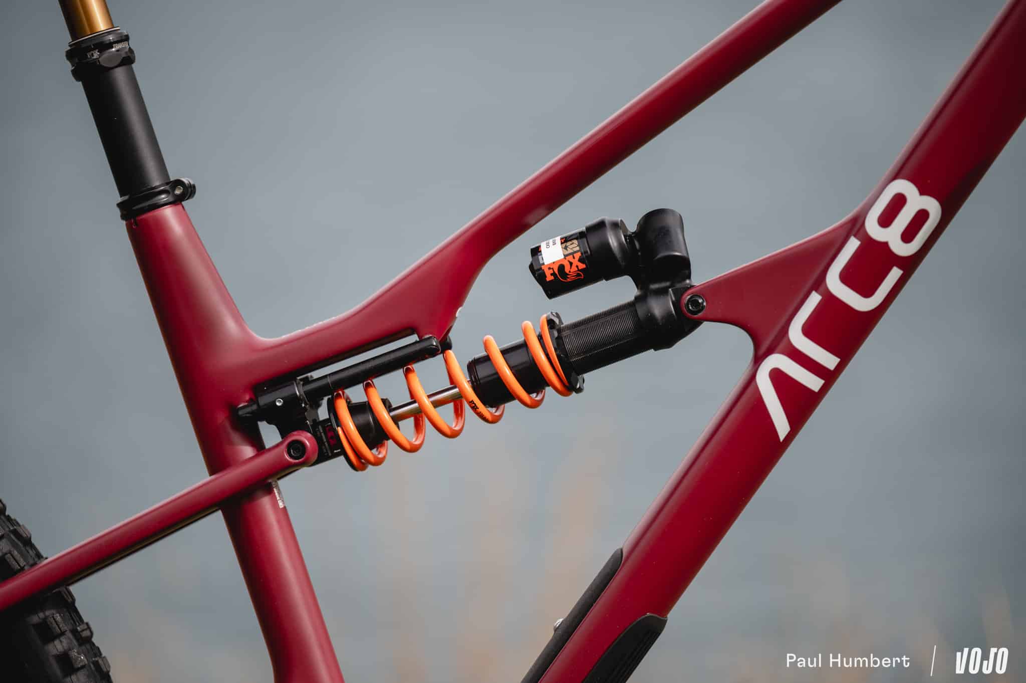 Pour Arc8, c’est une manière de travailler « en ligne » avec les forces qui poussent « droit » dans la suspension et sans le bras de levier d’une biellette. Côté rigidité, les points de pivots supplémentaires ayant été supprimés, c’est tout le triangle arrière qui l’assure. Pour Arc8, des tubes plus gros auraient apporté trop de rigidité, et cette construction « fine » mais monobloc offre juste ce qu’il faut.