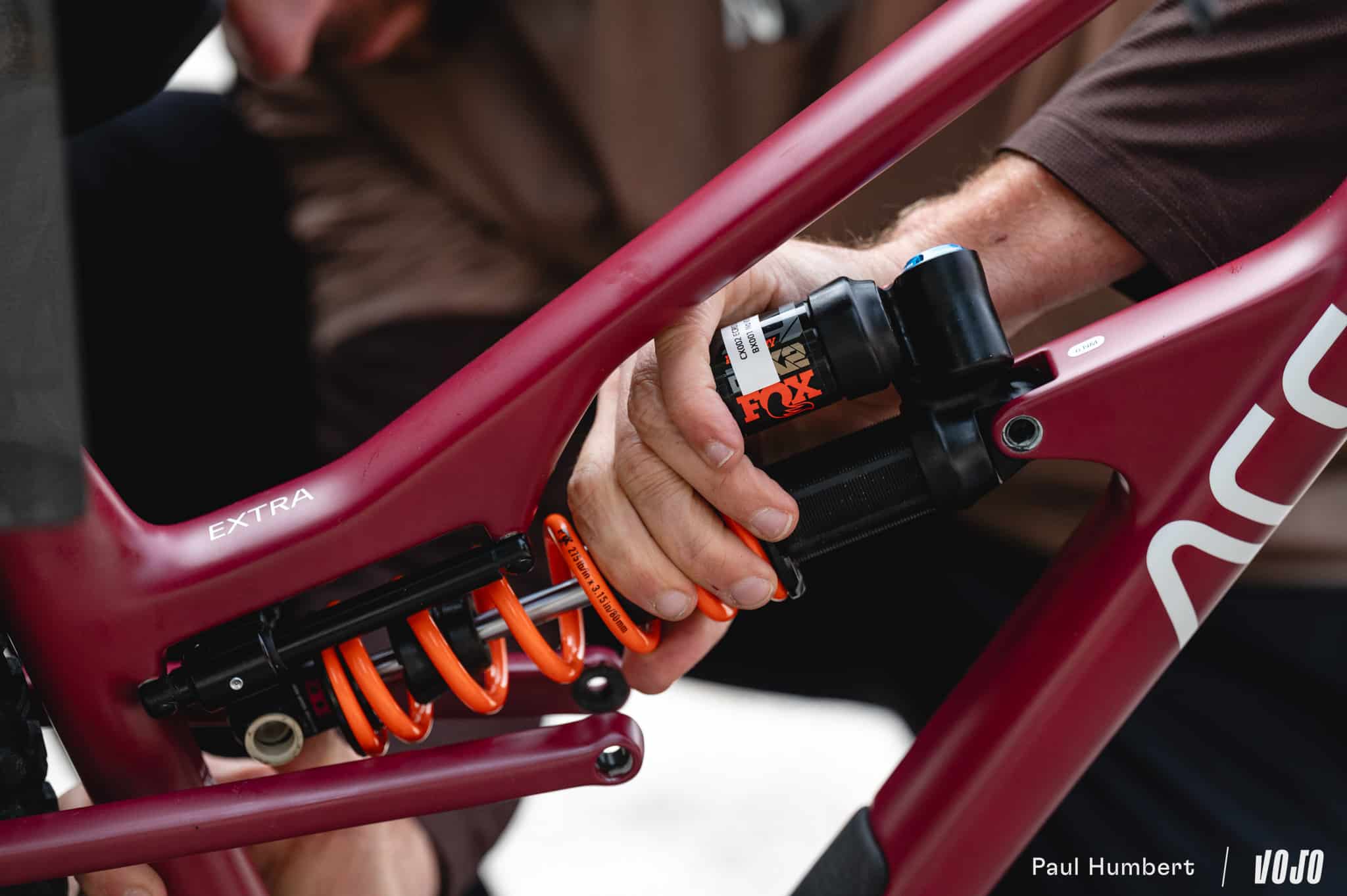 Sur le vélo, pour 75kg environ, on installe un ressort très léger de 275 lbs/in. Le ratio de suspension de cet Extra est très bas, ce qui pousse à l’utilisation de ressorts plutôt « lights » ou de pressions faibles. Cela implique également qu’il faut que l’amortisseur puisse offrir un rebond assez rapide. Avec un ratio qui commence à 2.4, on sort de la norme, et il faut que les amortisseurs soient adaptés à ce vélo. Attention donc en cas d’achat « aftermarket ».