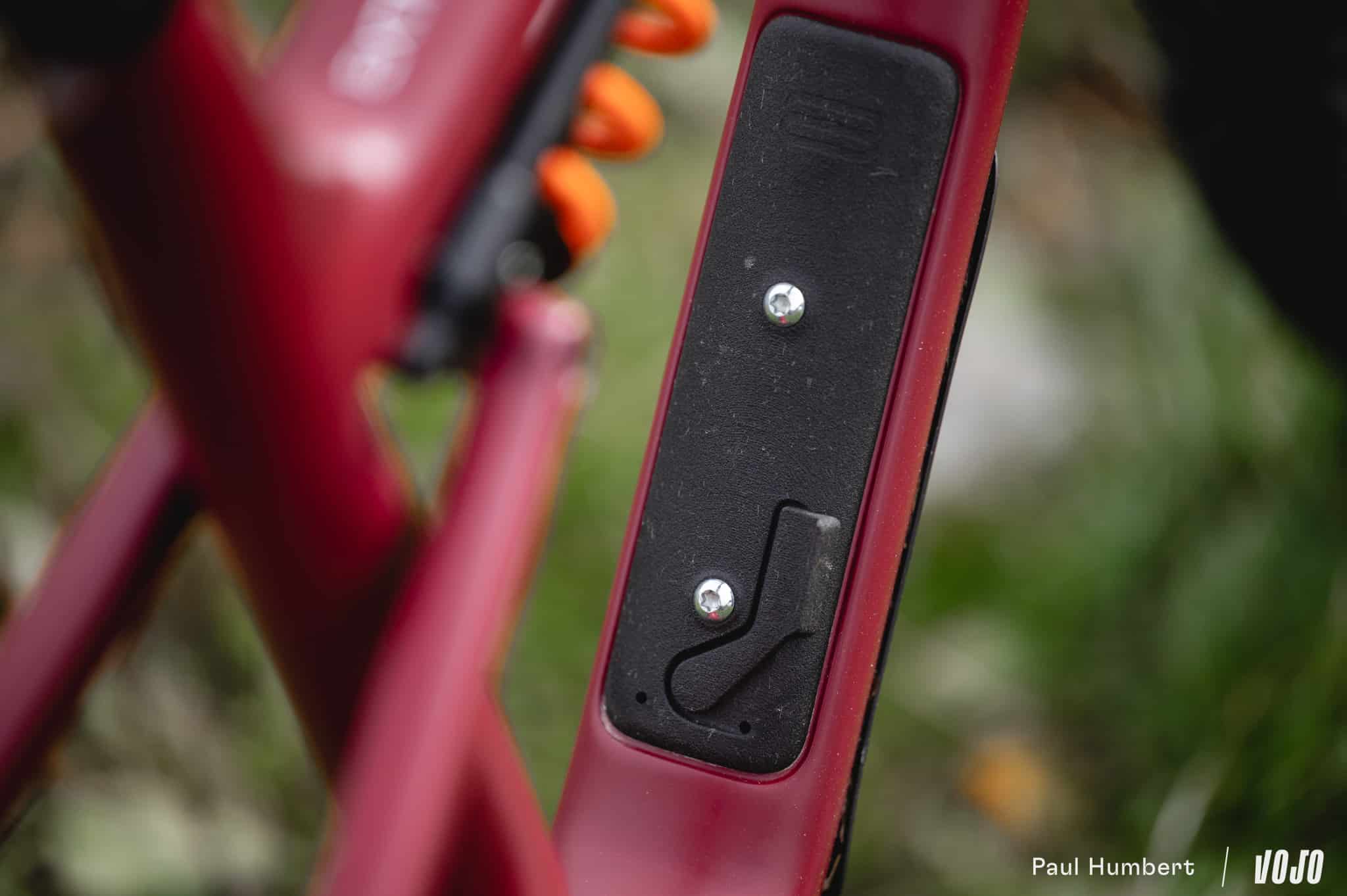 C’est un concept qui a le vent en poupe de nos jours : la marque suisse a intégré une boîte à gants au sein du tube diagonal. « C’est un point qui a été aussi challengeant que le développement du cadre complet. Après plusieurs itérations, nous sommes parvenus à une trappe résistante aux intempéries et à l’usure » détaille la marque. Au moment de la découverte du vélo, et de cette photo, la trappe était « factice » et matérialisée par cette impression 3D.