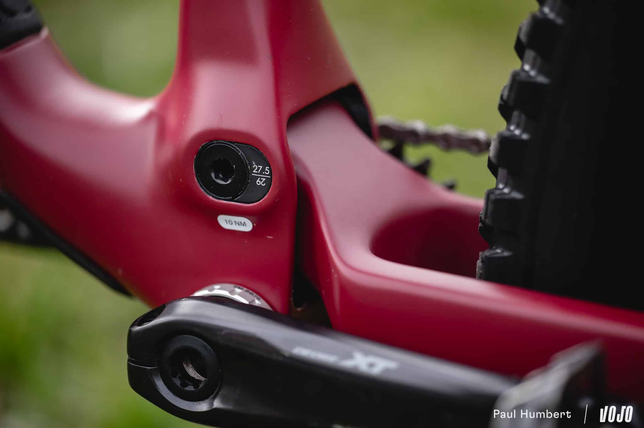 L’Arc8 Extra 2024 est équipé d’un flipchip permettant de passer d’un montage en roues de 29″ à un montage « Mulet » (à savoir une roue de 29″ à l’avant, et une roue de 27,5″ à l’arrière), et ce sans compromettre la géométrie ou la hauteur du pédalier. Le seul changement se trouve du côté de la longueur des bases qui se raccourcissent de 12 mm. « En position haute (27,5″), le vélo prend un caractère légèrement plus ludique, tandis qu’en position basse (29″), il devient une machine (de course) absolument efficace » explique la marque.