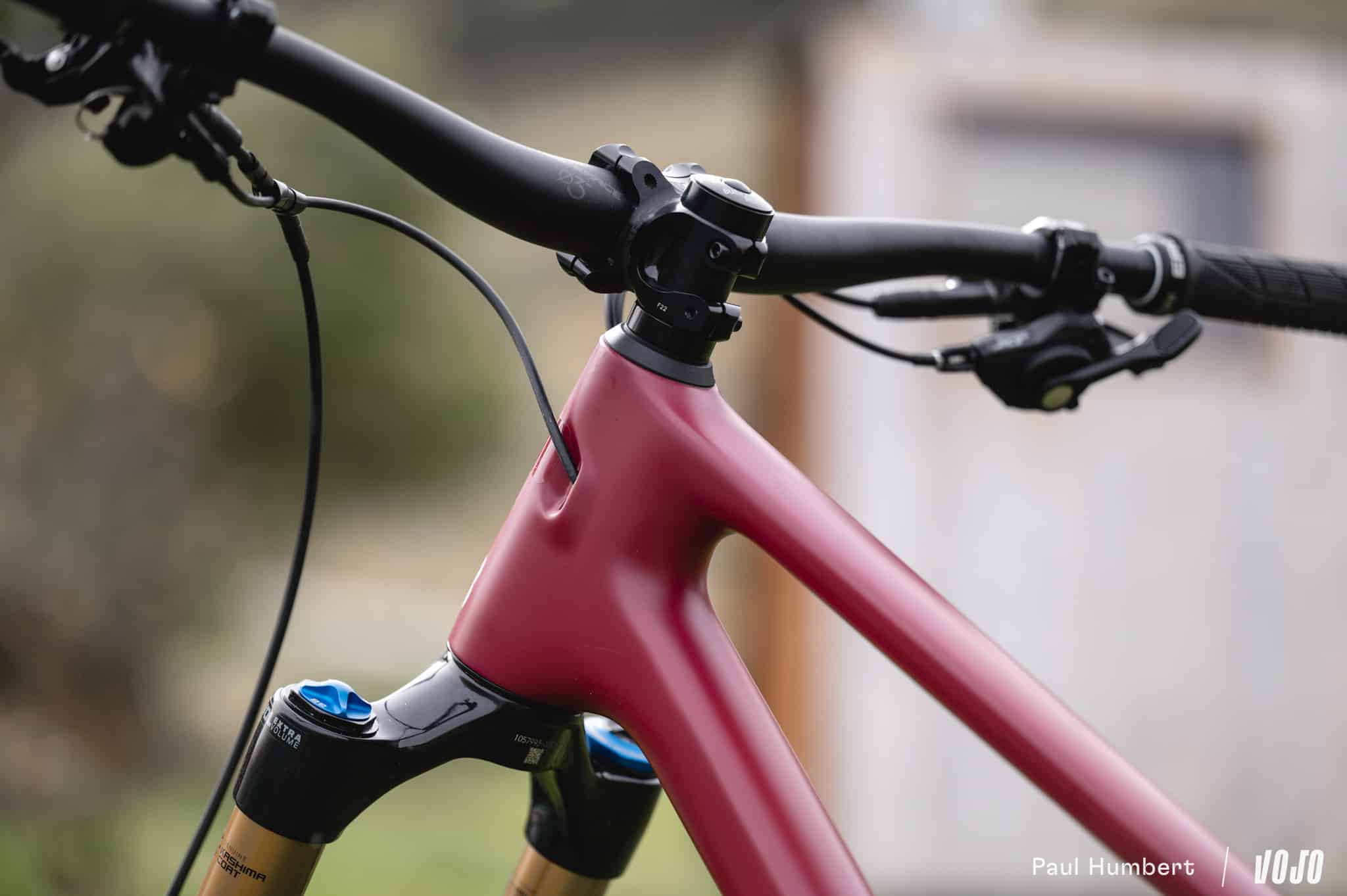 Le poste de pilotage est un RaceFace Turbine R, avec un cintre de 800mm et une potence de 40mm. Pourquoi un cintre aussi large ? La réponse est ici : Coupez votre cintre, vous nous remercierez ! Pour le reste, la tige de selle est une Fox Transfer Factory, la selle une Ergon SMC10 et les poignées des Ergon GD10.