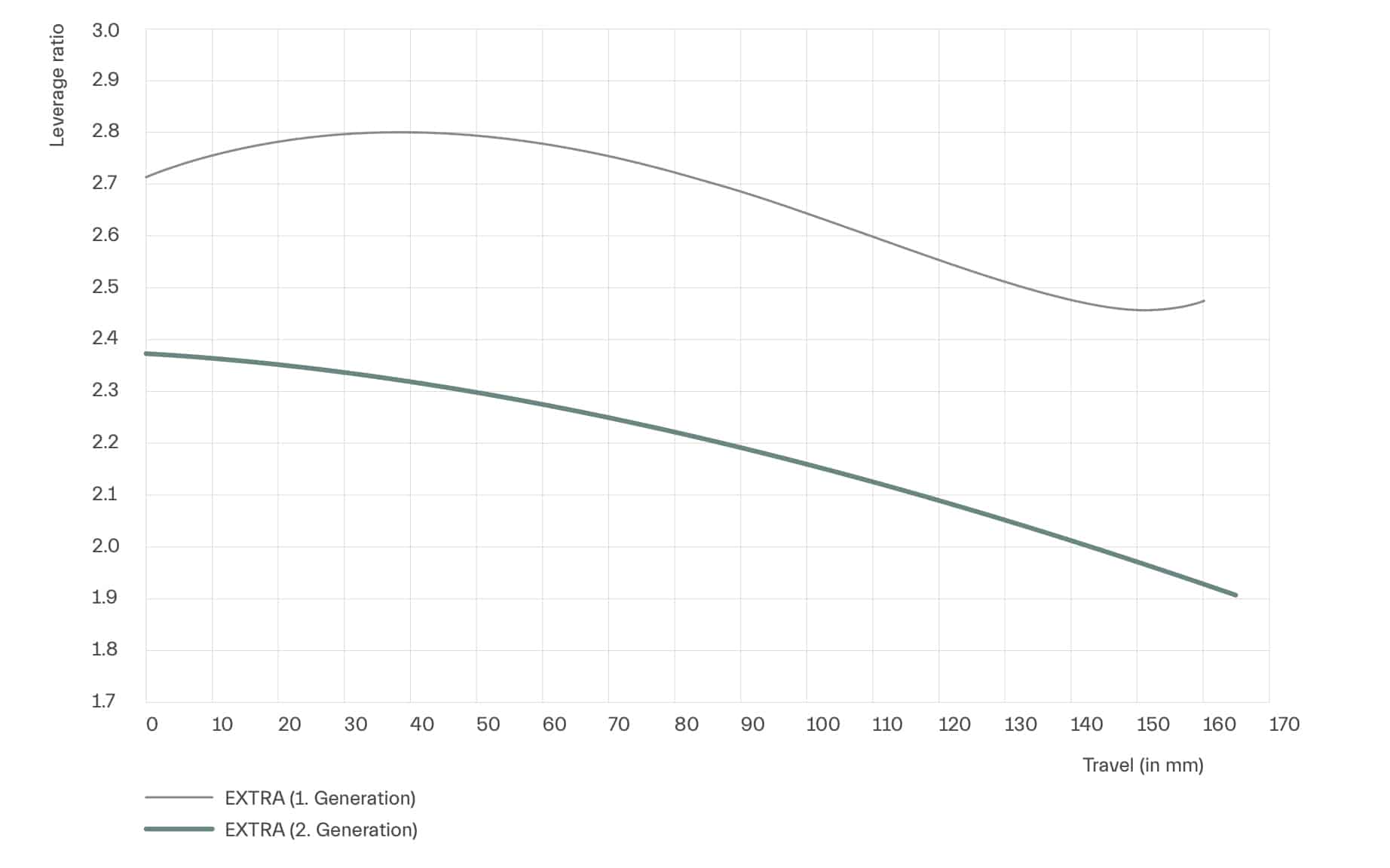 Sur le vélo, pour 75kg environ, on installe un ressort très léger de 275 lbs/in. Le ratio de suspension de cet Extra est très bas, ce qui pousse à l’utilisation de ressorts plutôt « lights » ou de pressions faibles. Cela implique également qu’il faut que l’amortisseur puisse offrir un rebond assez rapide. Avec un ratio qui commence à 2.4, on sort de la norme, et il faut que les amortisseurs soient adaptés à ce vélo. Attention donc en cas d’achat « aftermarket ».