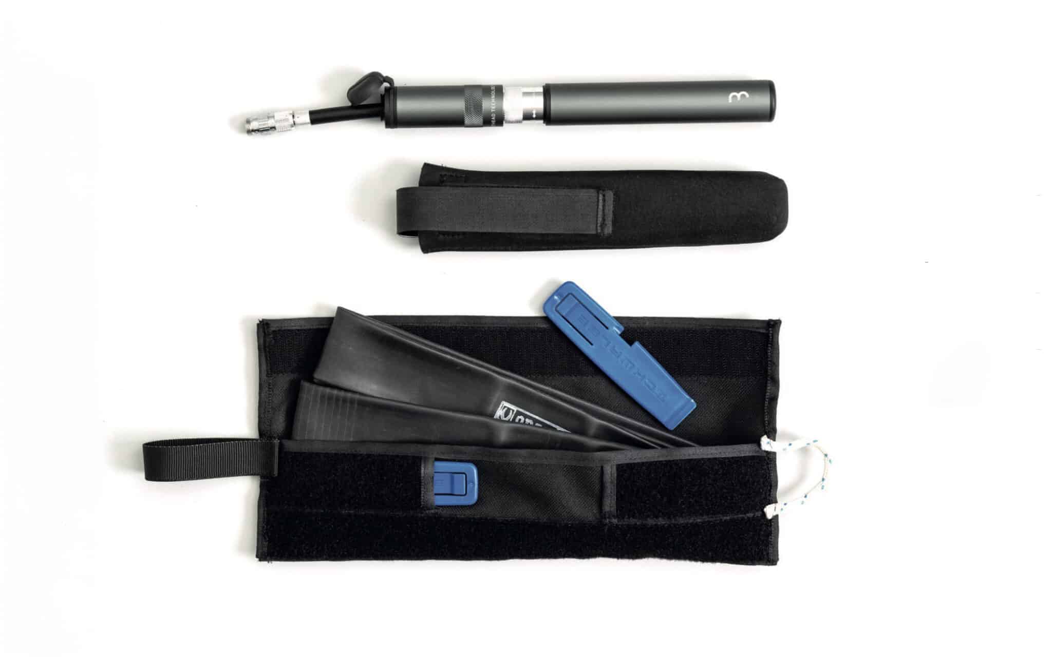 À l’intérieur, on retrouve de deux poches en Néoprène qui se glissent directement dans le tube diagonal et qui contiennent les outils les plus essentiels : chambre à air de rechange, démonte-pneus et petite pompe. Un multi-outils peut également être directement fixé sur le dos de la trappe en plastique afin d’être facilement accessible.
