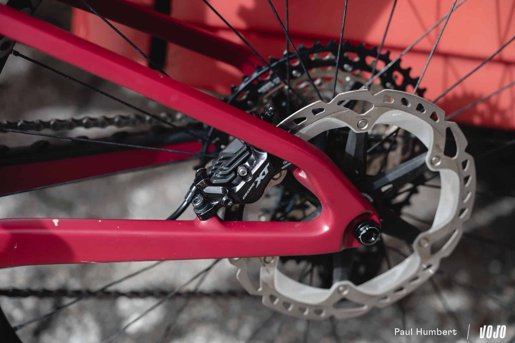 Du côté de la transmission, c’est un groupe Shimano XT que l’on retrouve avec une cassette 10-51 et des manivelles en 165 mm de longueur. Le freinage est du même acabit avec une paire de Shimano XT à quatre pistons, associée à des disques avant/arrière de 220/203 mm.