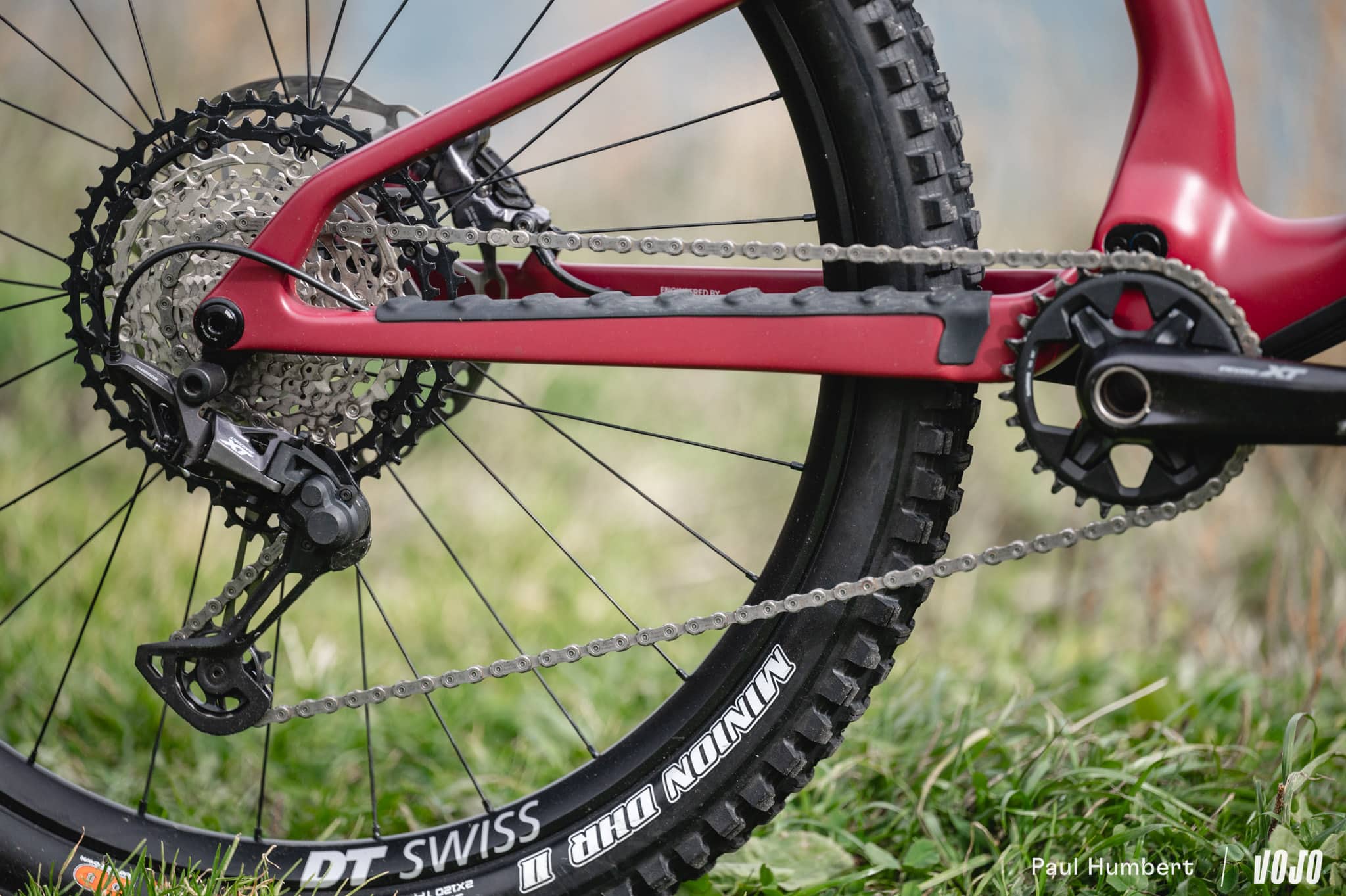 Le train roulant est composé de DT Swiss EX 1700 Spline, chaussées de pneumatiques Maxxis Assegai (gomme MaxxGrip et carcasse Exo+) en 2.5 à l’avant et Maxxis DHR II (gomme MaxxTerra et carcasse DoubleDown) en 2.4 à l’arrière. Pour rappel, les nuances entre les différents profils, gommes et carcasses de chez Maxxis sont expliquées juste ici : Maxxis : le guide complet de la gamme de pneus trail / enduro