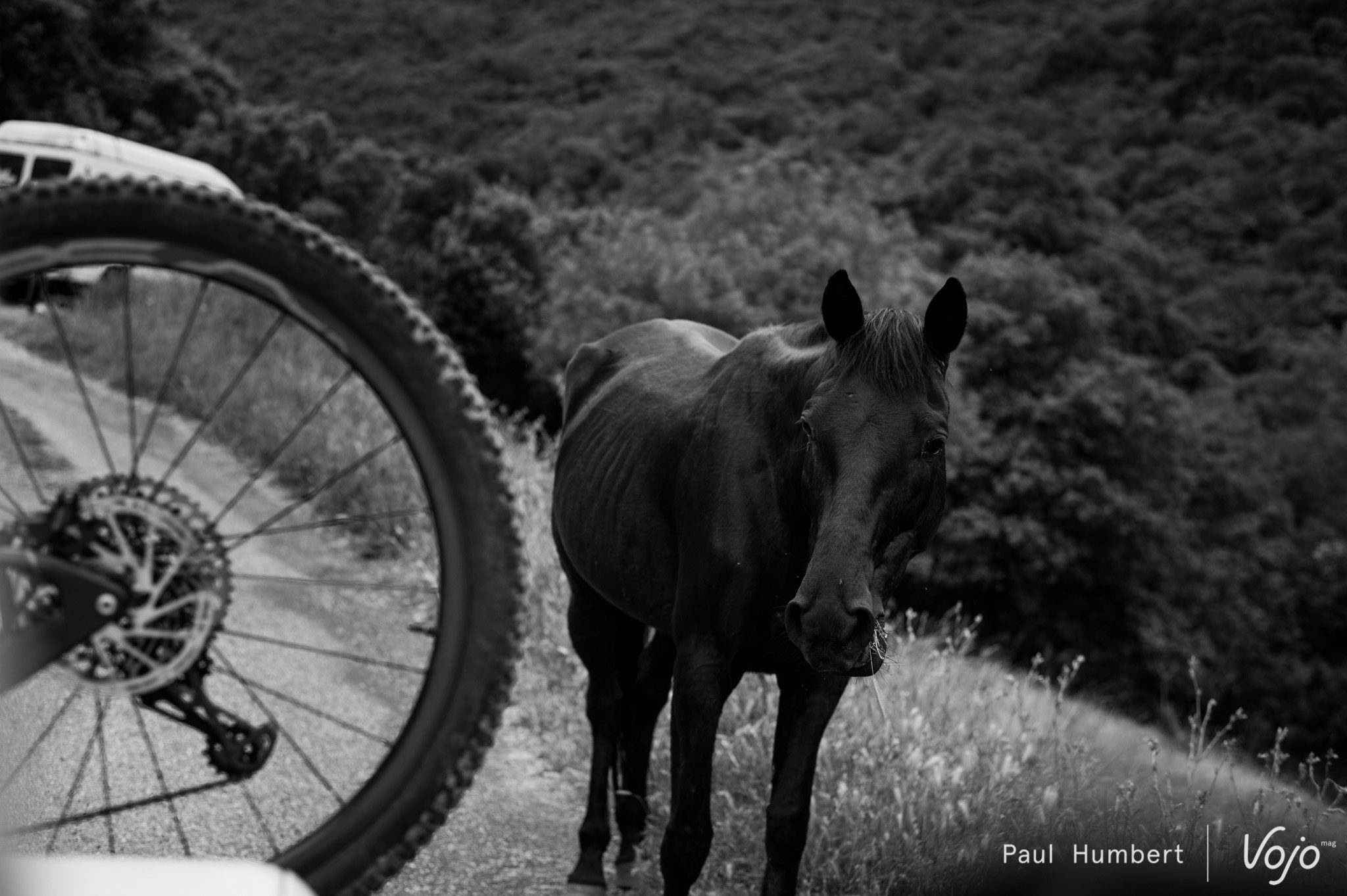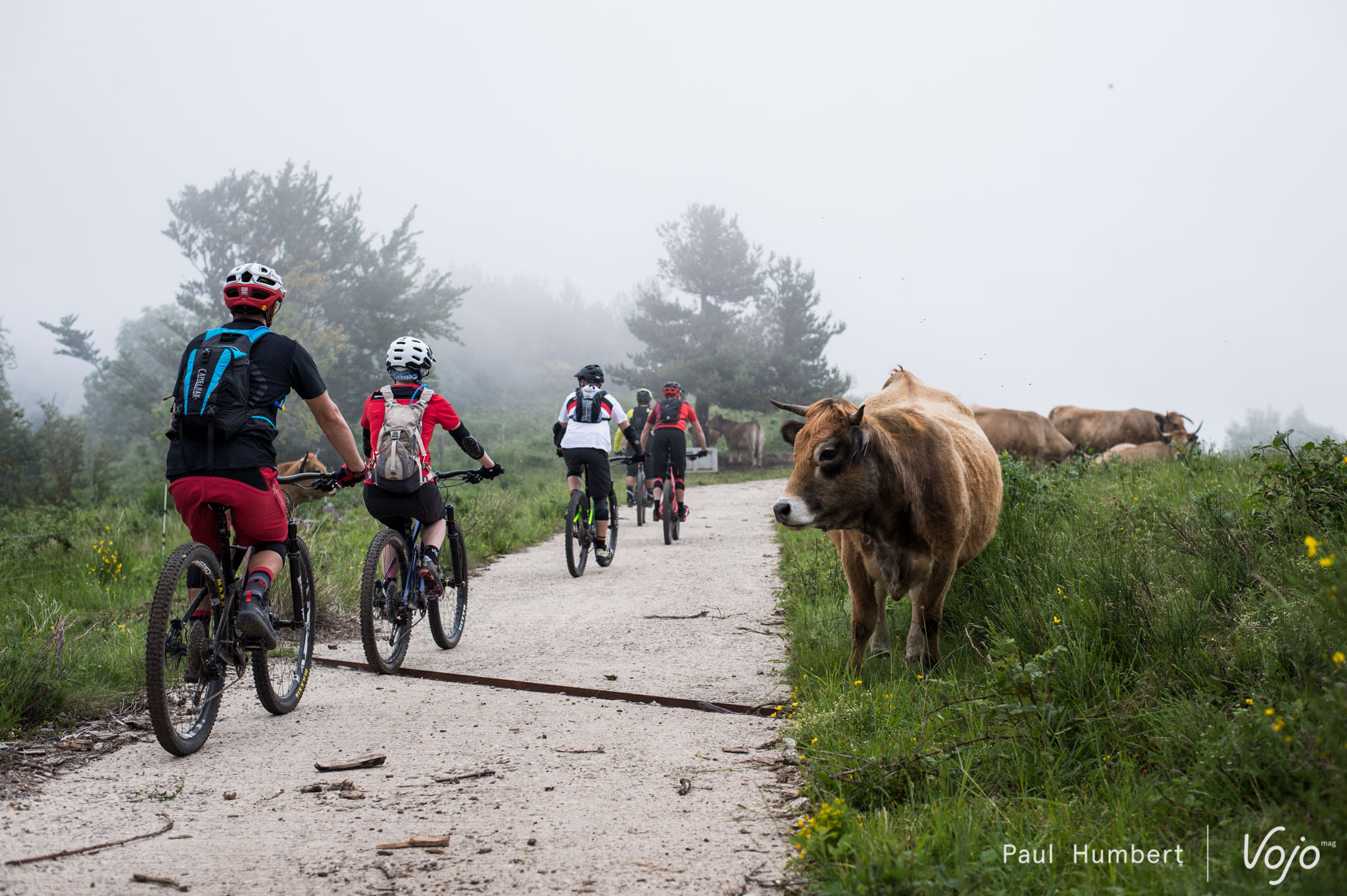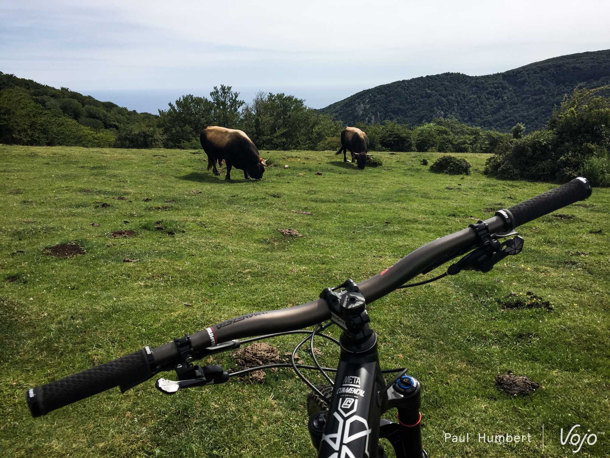 C’est Simon qui nous « briefe » avant chaque descente sur les difficultés et les obstacles que nous allons rencontrer (tout en prenant la peine de rassurer ceux qui doivent l’être sur leurs capacités). Avant de plonger dans ce qui ressemblera à un paysage digne du Canada, on traverse un troupeau de vaches… et de taureaux, que votre serviteur ne découvrira qu’après s’être mis en position de vulnérabilité : appareil photo à la main, loin de son vélo. Altino nous rassure, ils ont l’air plutôt sympa, mais on file sans demander notre reste !