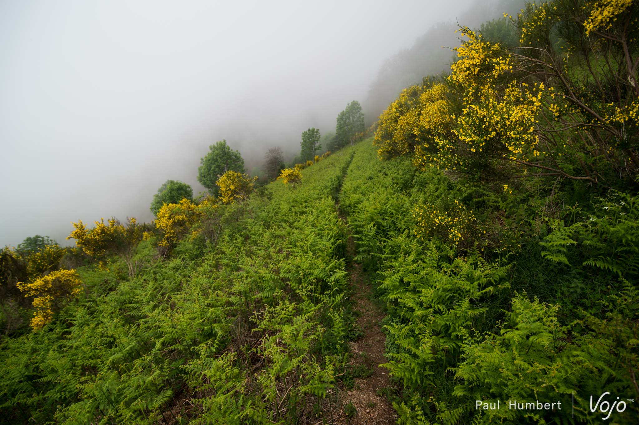 La glacière de Stephane regorge « d’énergie » et on profite de l’ambiance radicalement différente de celle du bord de mer. Le terrain est on ne peut plus humide, un ruine nous observe du coin de l’oeil et on entame notre descente.