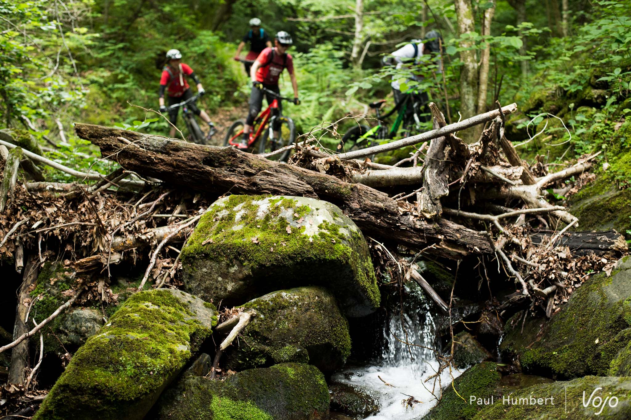 On traverse ensuite une portion qui comptera parmi les plus belles de tout notre petit périple. Au-dessus d’une rivière, on slalome entre les cailloux, on saute au-dessus des troncs de bois mort et la végétation. On prend la roue d’Anne-Caroline qui se fait plaisir, ça se voit au premier coup d’oeil. Ses roues décollent dès qu’une possibilité s’ouvre à elle. Elle cherche les meilleures trajectoires et on prend par la même occasion une leçon de pilotage avant d’enchaîner avec un atelier « réparation de crevaison ».