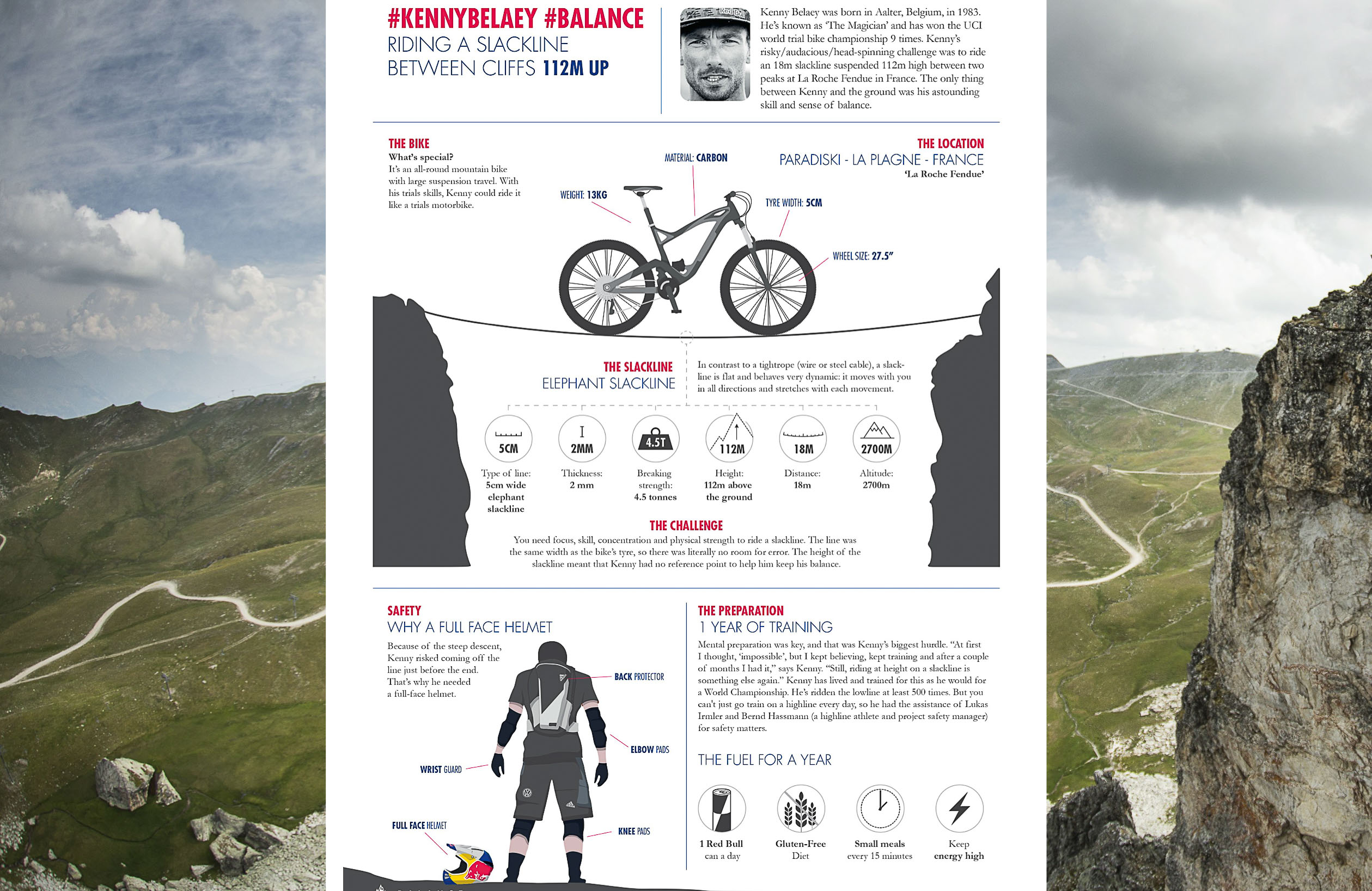 Quand le Belge Kenny Belaey, 9 fois champion du Monde de trial, se lance un défi, c’est toujours un événement. Le dernier en date, sorte de projet « ultime » pour l’athlète de 32 ans : rouler entre deux pitons rocheux sur une slackline, une simple sangle tendue d’à peine 5cm de large pour 18m de long, suspendue dans le vide à 118m de hauteur. Le résultat, c’est une vidéo à couper le souffle, que nous vous avons montrée il y a quelques jours et que vous pouvez revoir simplement en cliquant sur la première image ci-dessous. Aujourd’hui, Kenny Belaey et son équipe nous dévoilent les coulisses de l’aventure. Interview.