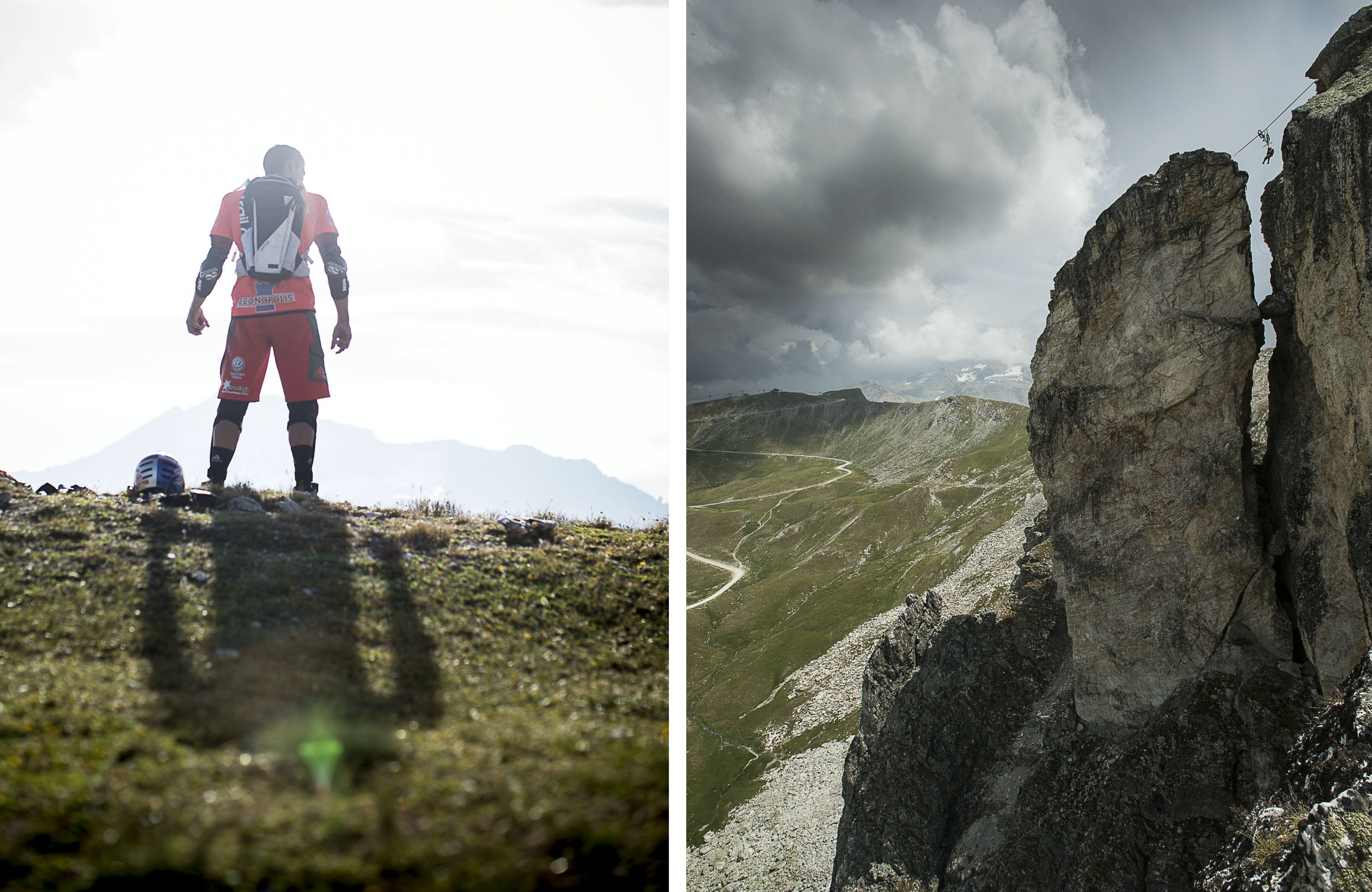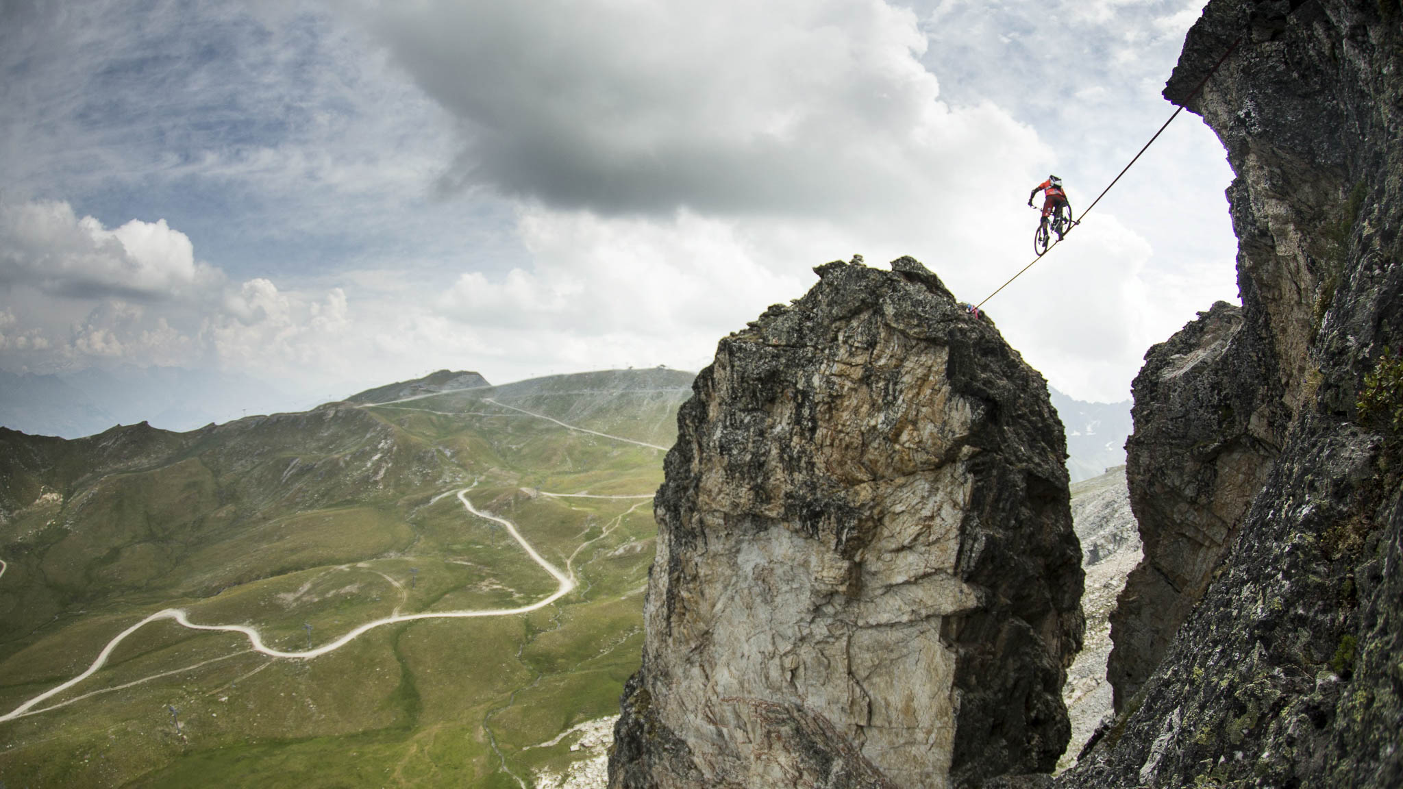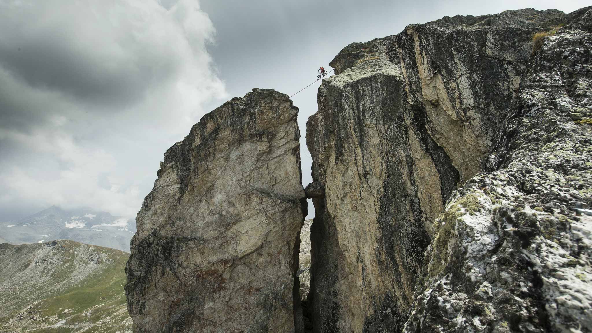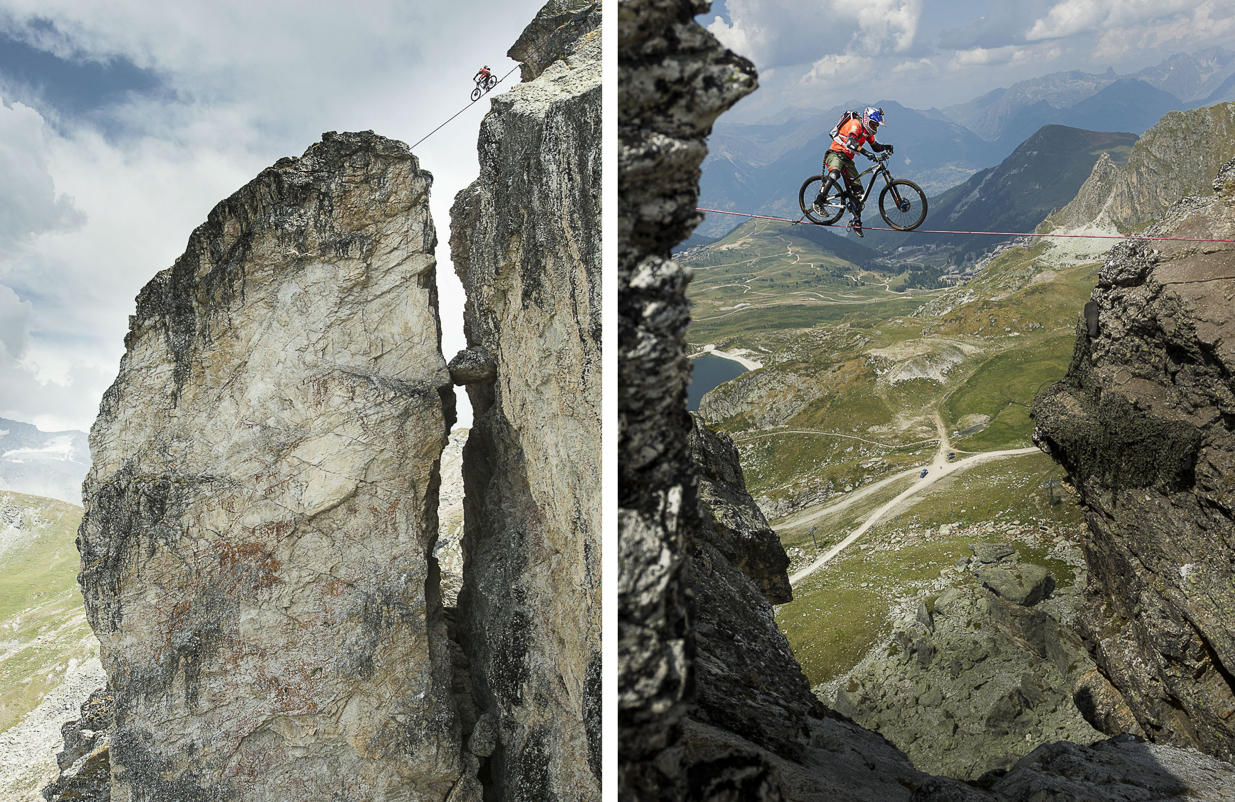 En 2012, j’ai enregistré une vidéo vtt et bike trial à ParadiSki sur un téléférique. A ce moment, ils m’ont demandé ce que j’aimerais faire d’autre d’encore plus fou. Et j’ai répondu : rouler sur une slackline tendue entre deux rochers. Rétrospectivement, je me dis que j’ai eu une grande gueule en disant cela… (rires)