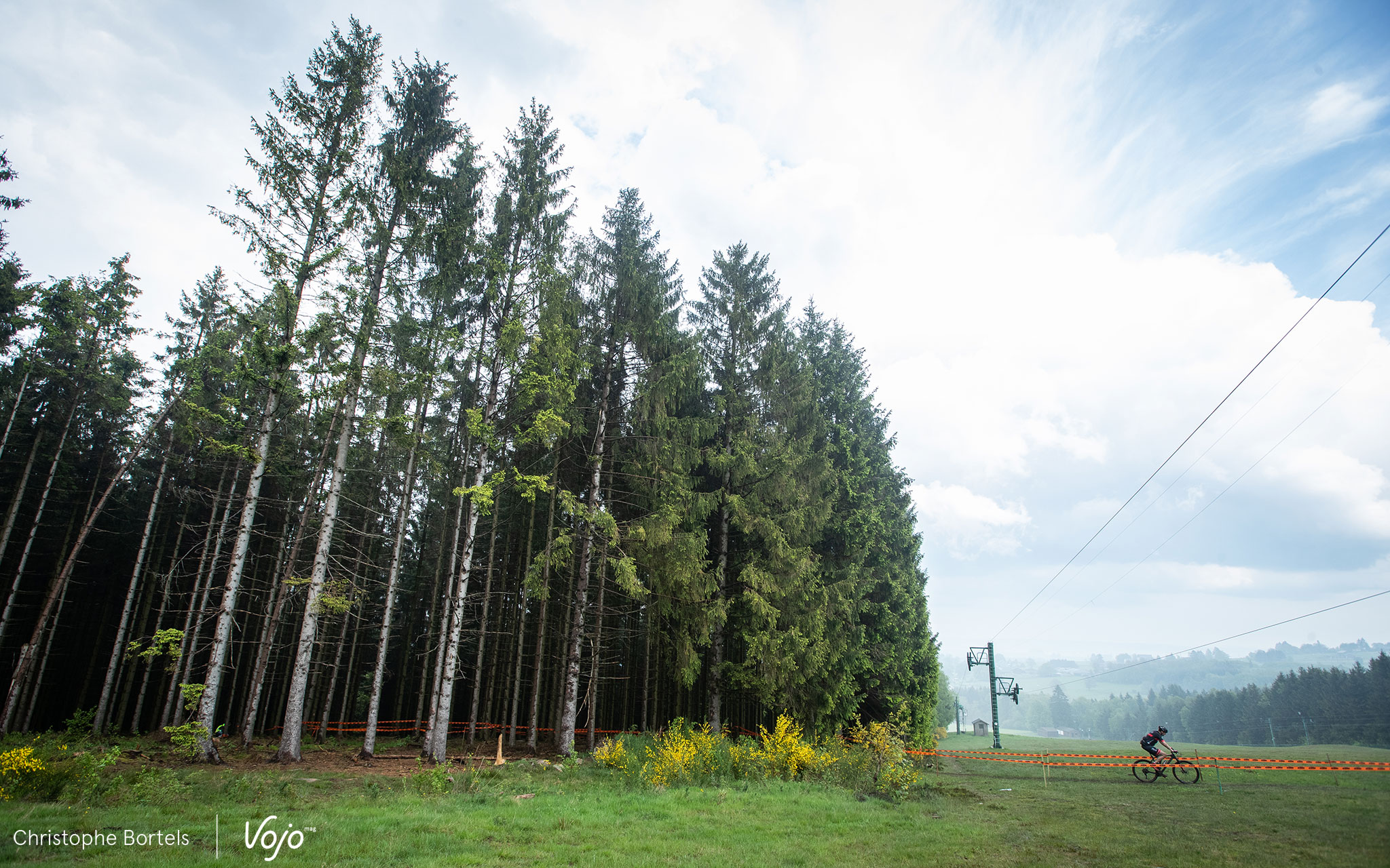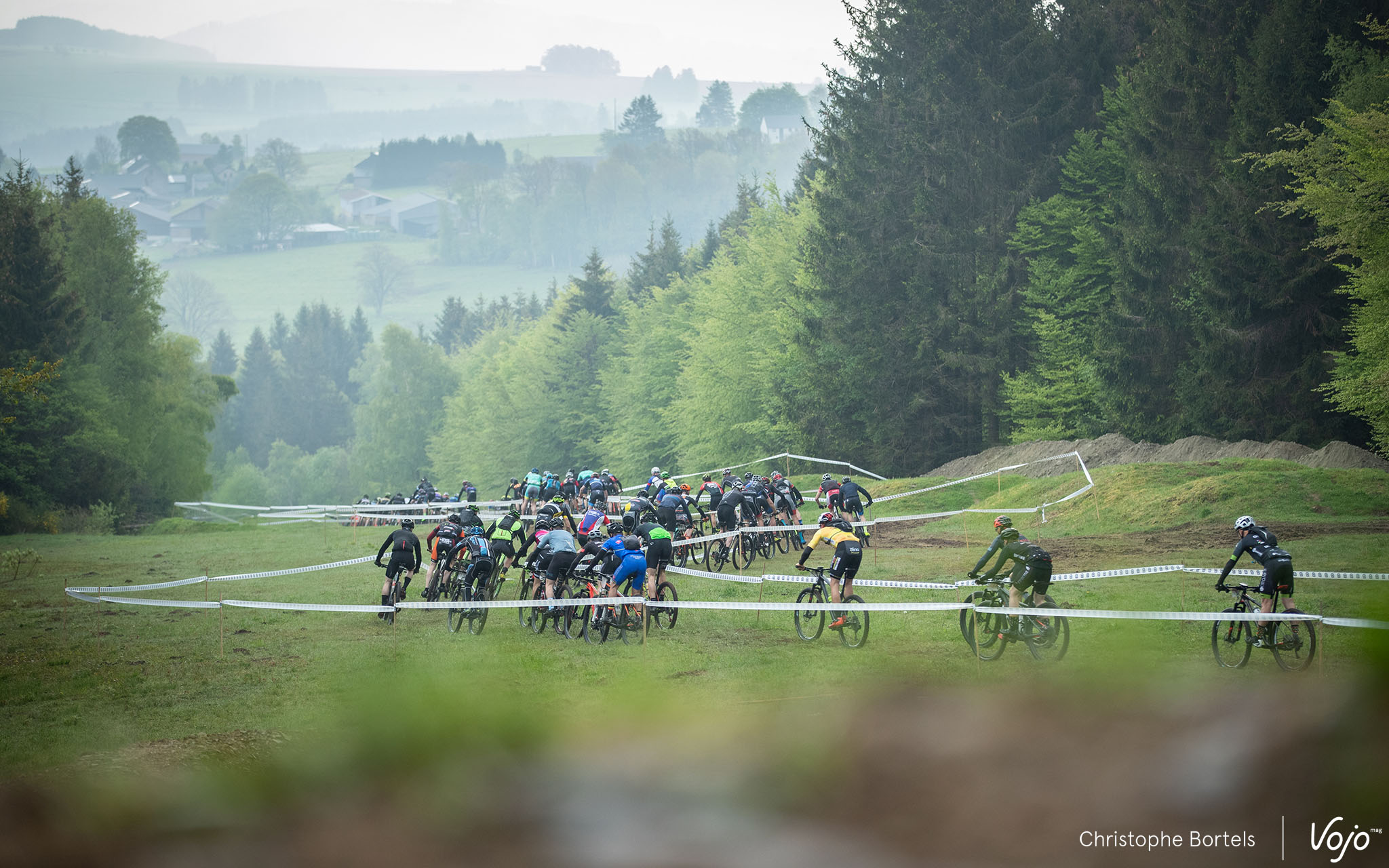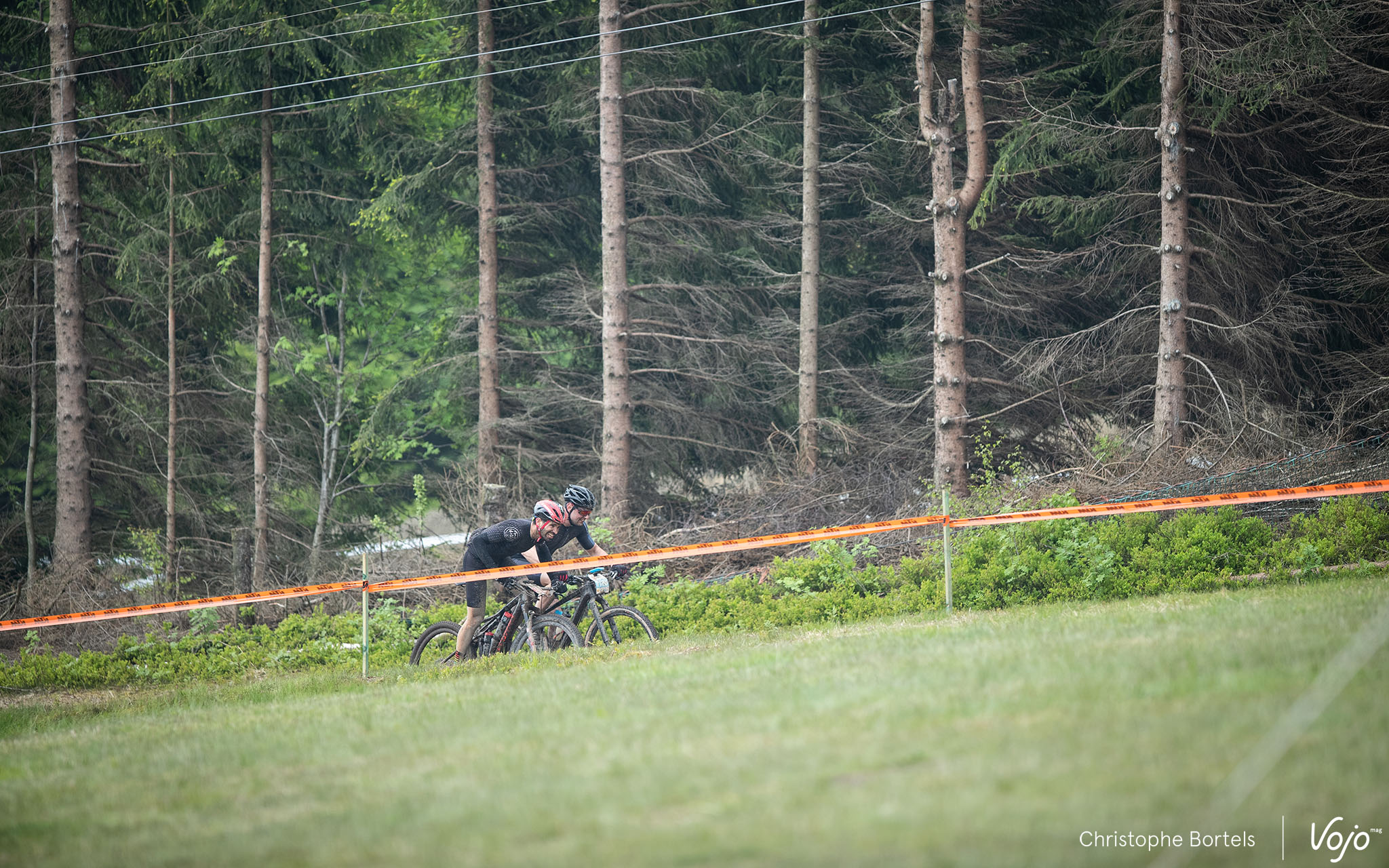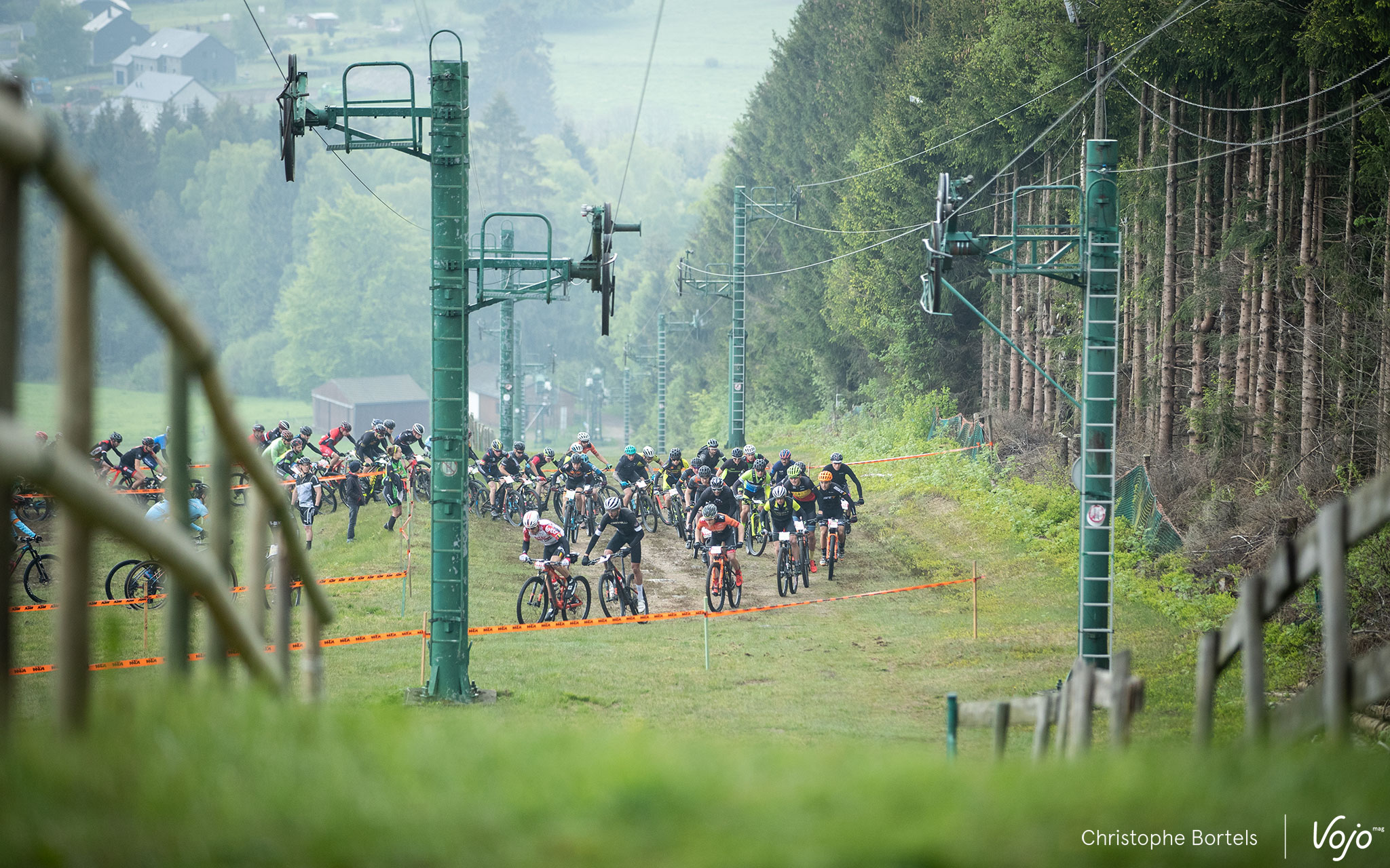 Les concurrents attaquent rapidement la première descente sur l’une des pistes de ski de la Baraque de Fraiture. C’est un parcours certes globalement peu technique mais physique et nerveux qui les attend.