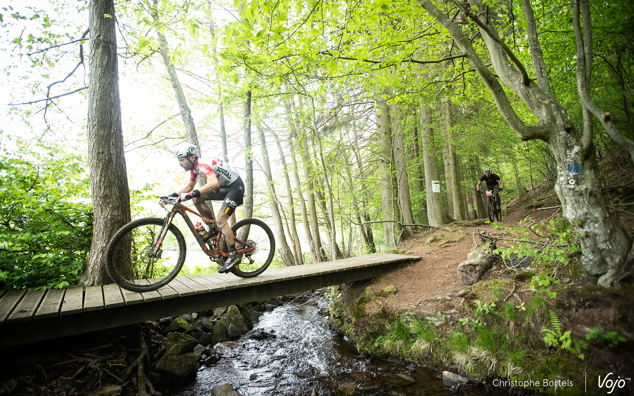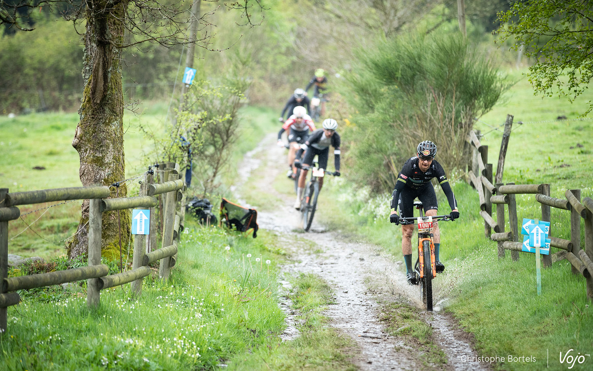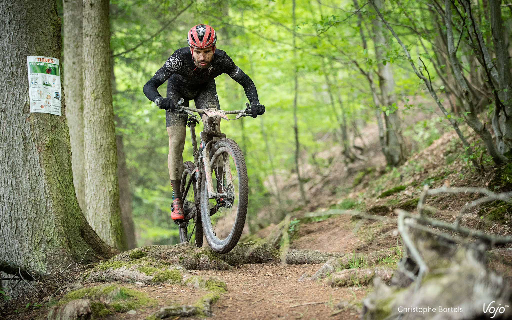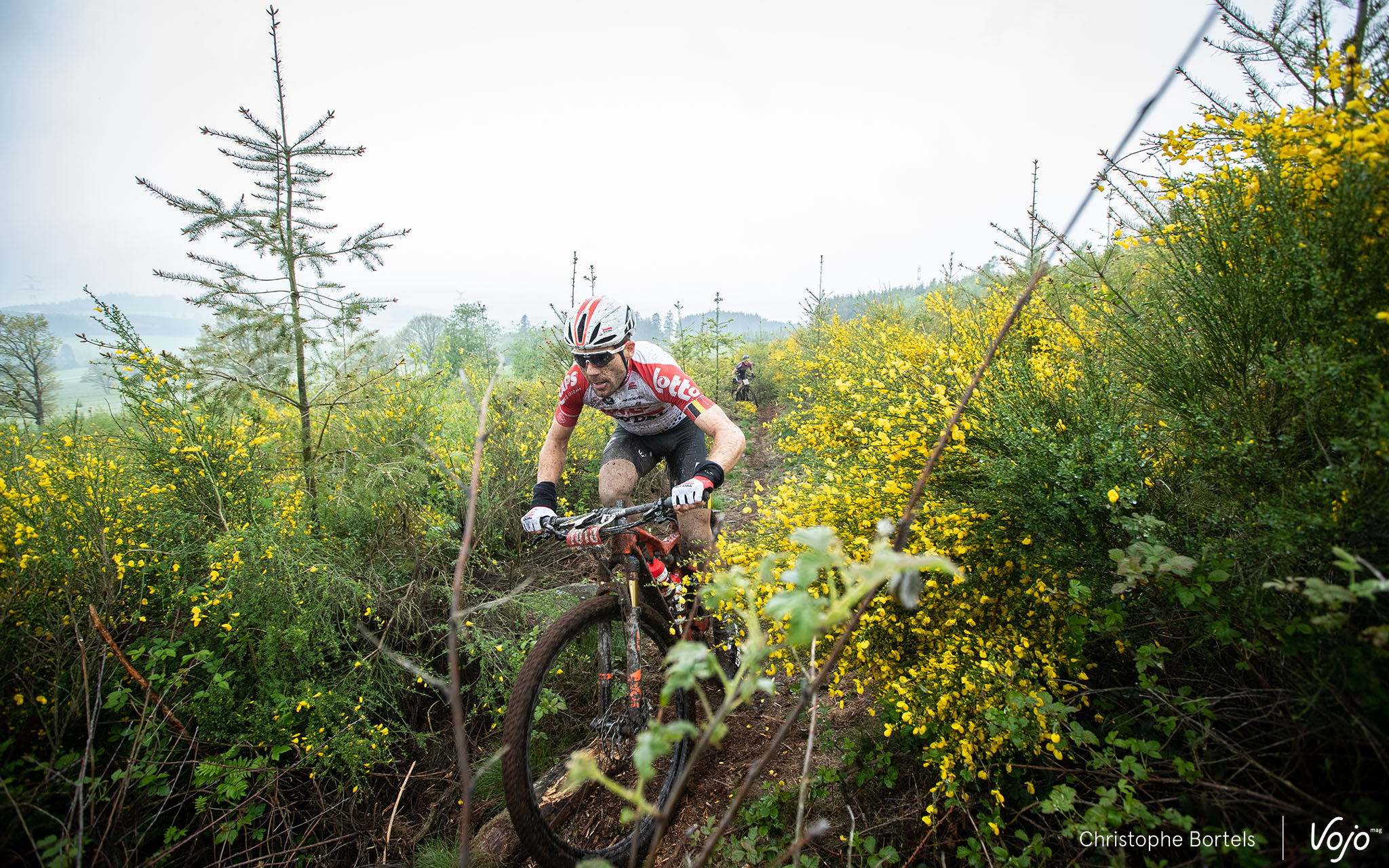 … et sur le coup de 8h30, c’est parti ! Présent pour une « petite » pige en VTT, le routeux Maxime Monfort de l’équipe Lotto-Soudal se distingue d’emblée et fait le holeshot.