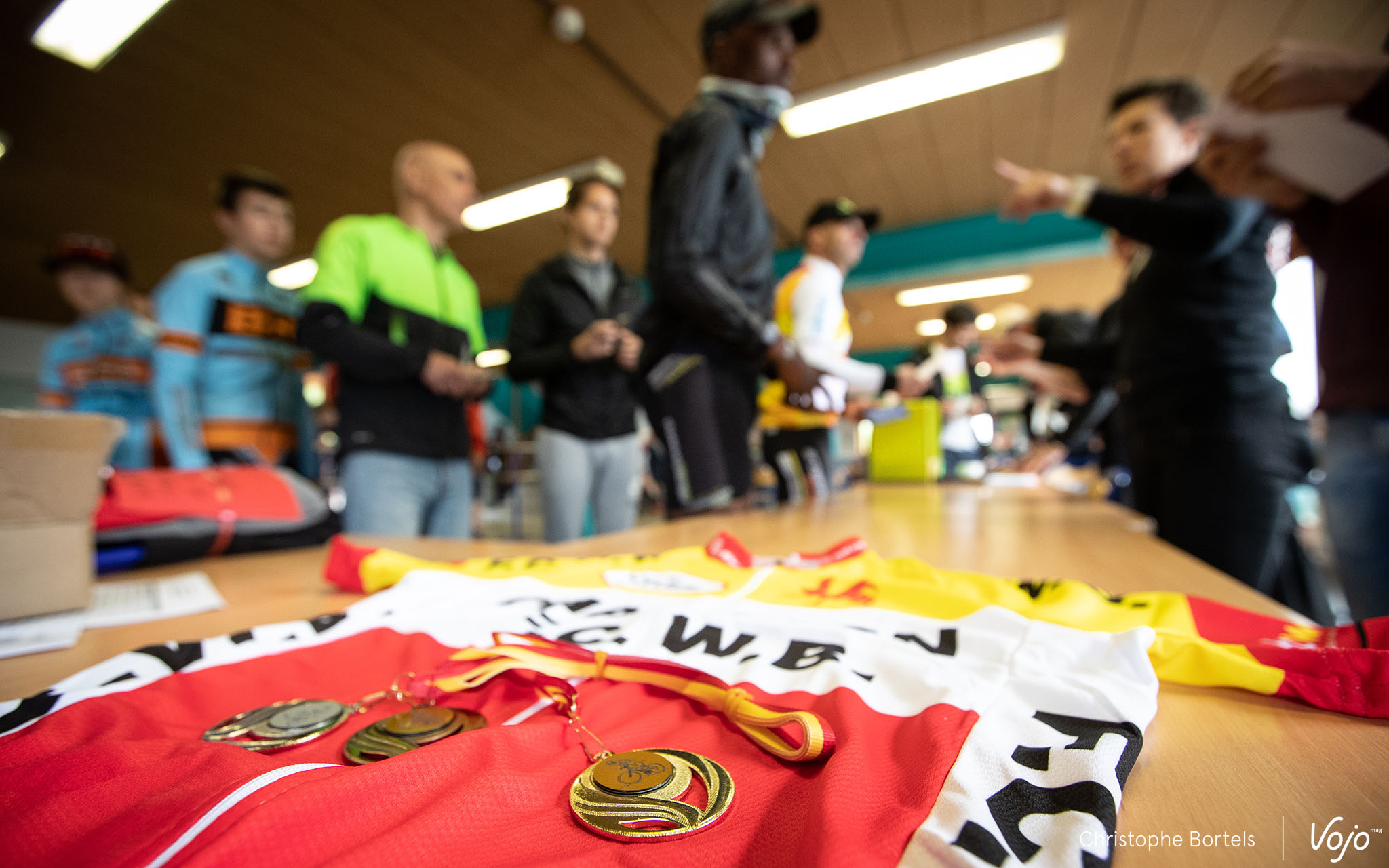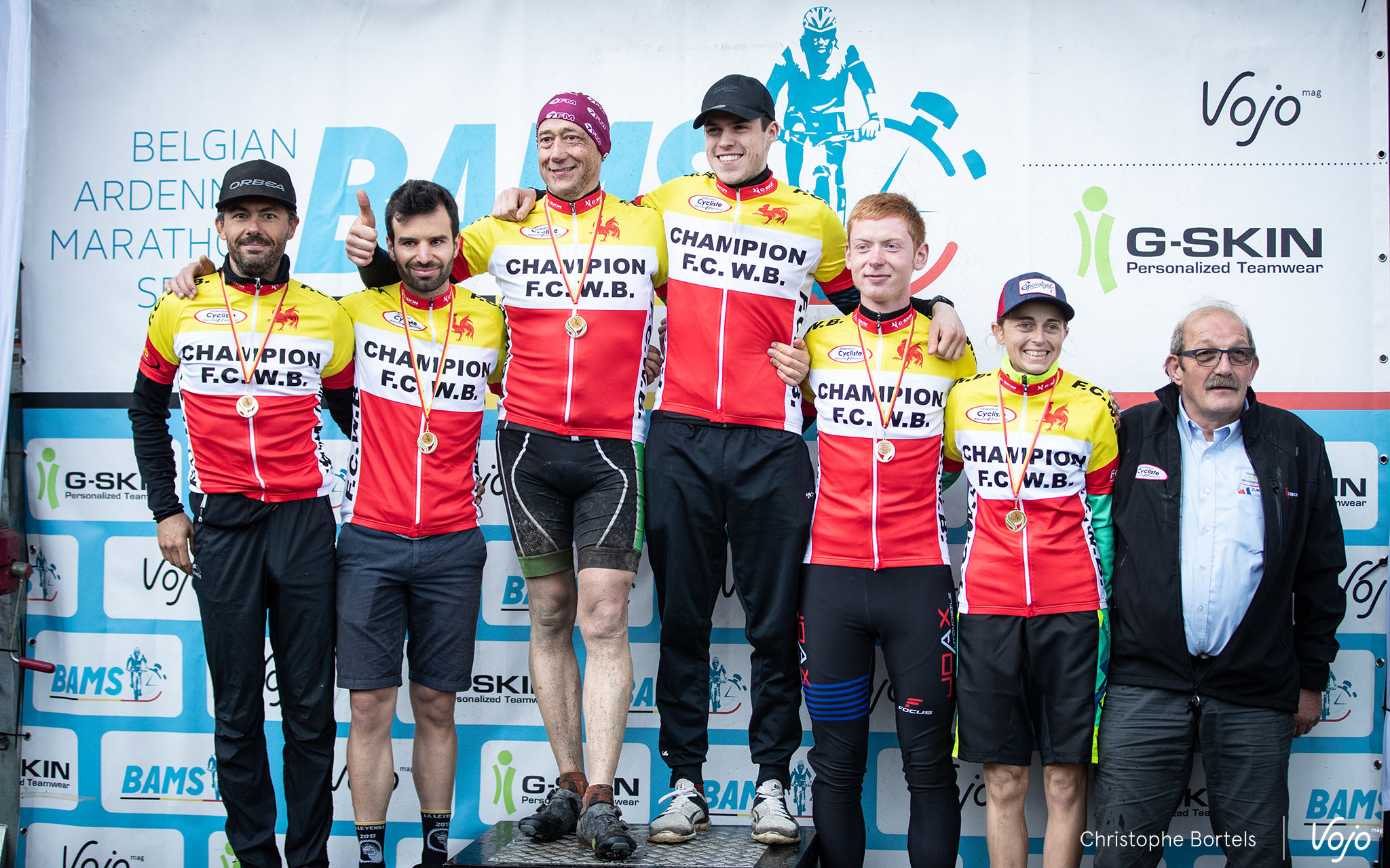 Les maillots de champion FCWB atterrissent quant à eux sur les épaules de (de gauche à droite) Frédéric Grifnée (Master 2), Julien Delaet (Master 1), Jean-Marie Alofs (Master 3), Kevin Nyssen (Elites), Adrien Forthomme (U23) et Bieke Machielsen (Dames) Grâce à son résultat, Maxime Monfort aurait dû décrocher le titre FCWB chez les Elites, mais il a demandé à être déclassé pour éviter, d’après la version officielle, tout conflit de maillot par rapport à son équipe.