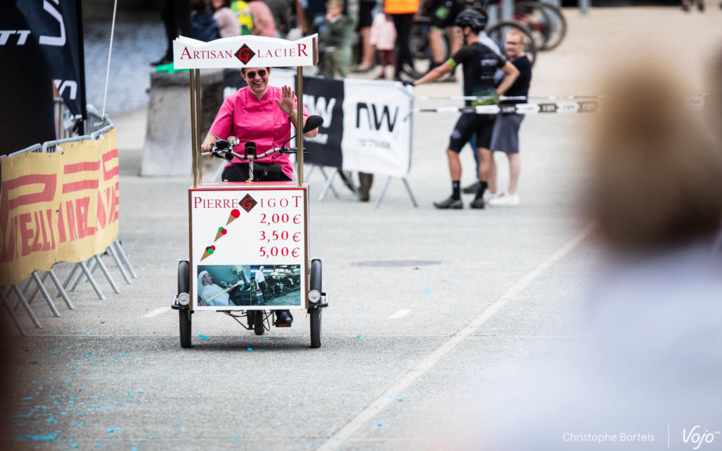 On assiste au passage du triporteur du glacier local… et à l’arrivée de Joyce Vanderbeken, victorieuse chez les Dames sur le 90 km et 30e au scratch.