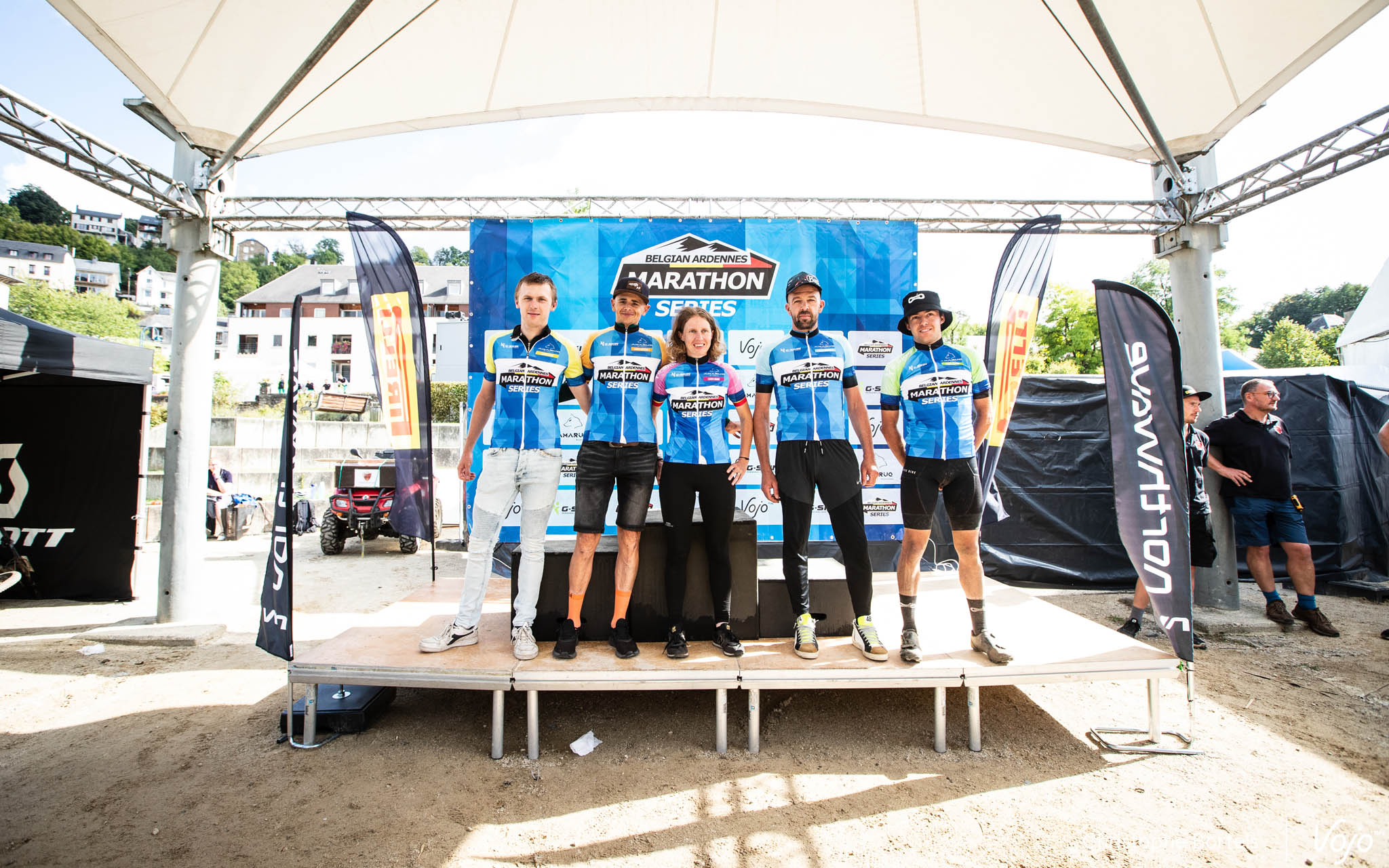 Les leaders du classement BAMS après la 6e des 7 manches de la saison : Owen Valcke (Elite) Joris Massaer (Master 1), Joyce Vanderbeken (Dames), Michel Meysman (Master 2) et Brice Dedeurwaerdere (Espoirs), sans oublier Gerry Vermeulen (Master 3), absent lors de la photo.