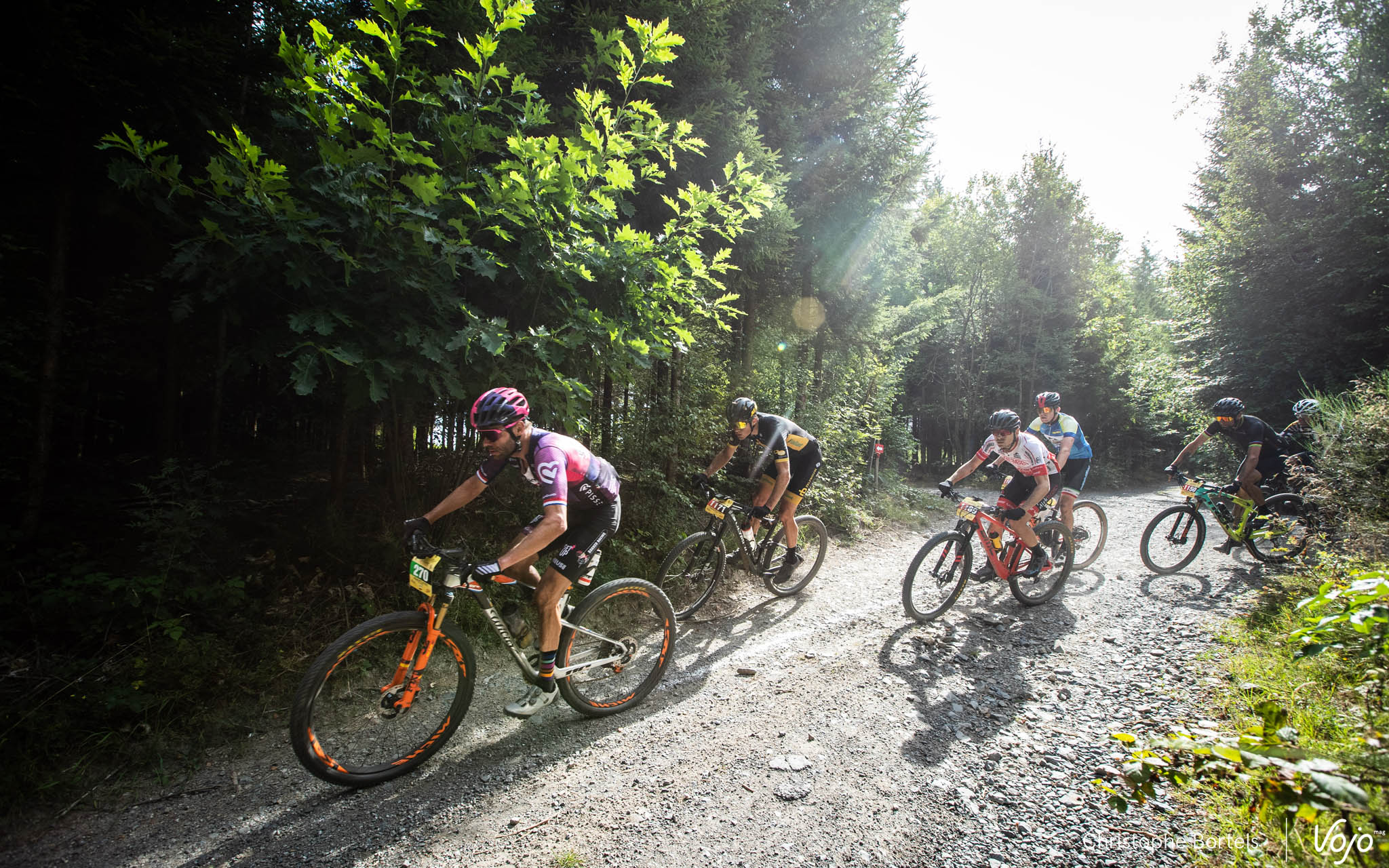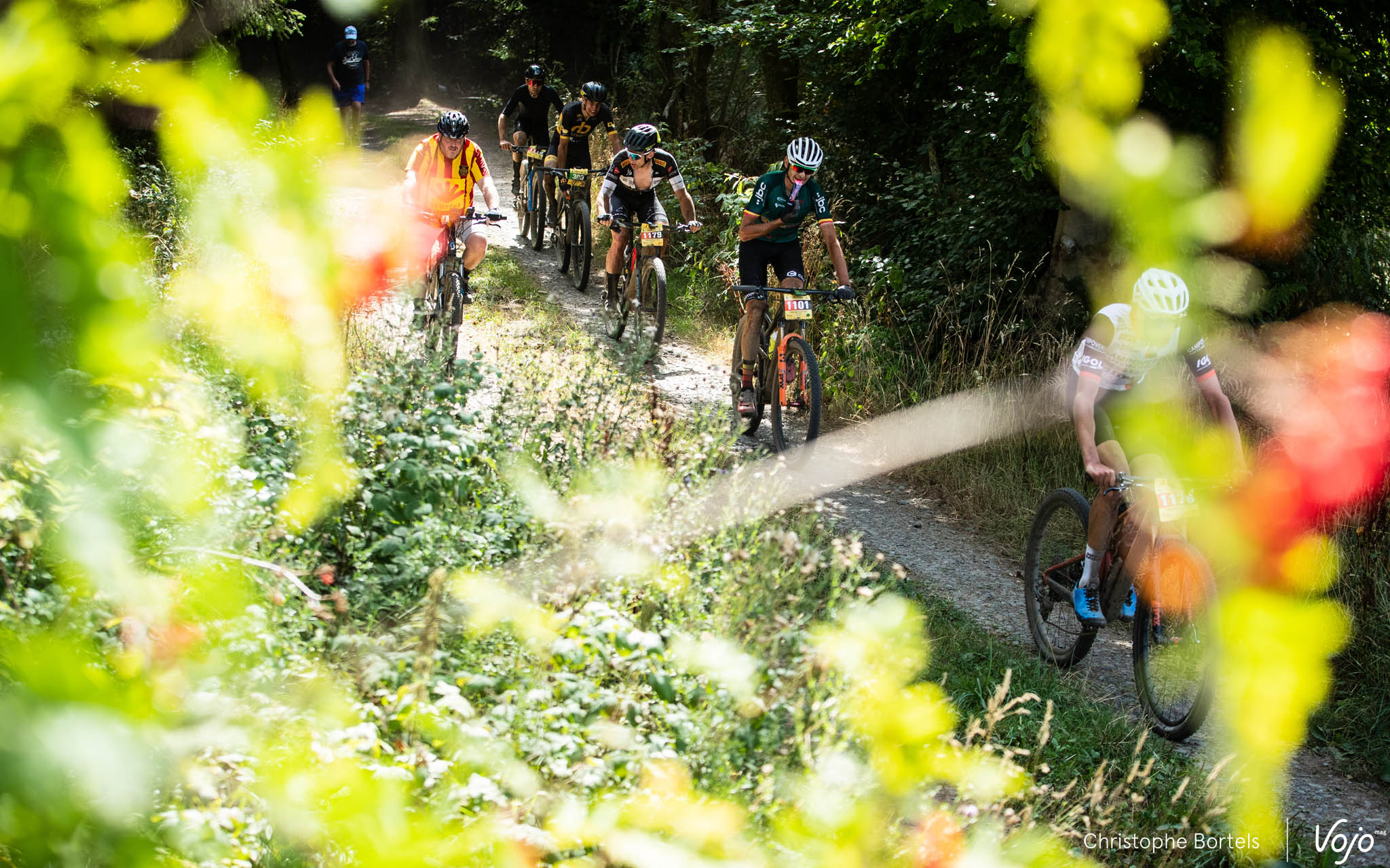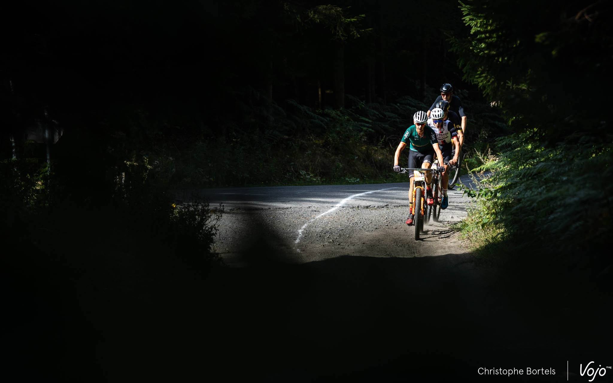 Kilomètre 73 : statu quo alors que les coureurs viennent de passer sur les hauteurs d’Houffalize et empruntent ce bien connu et fort sympathique singletrack.