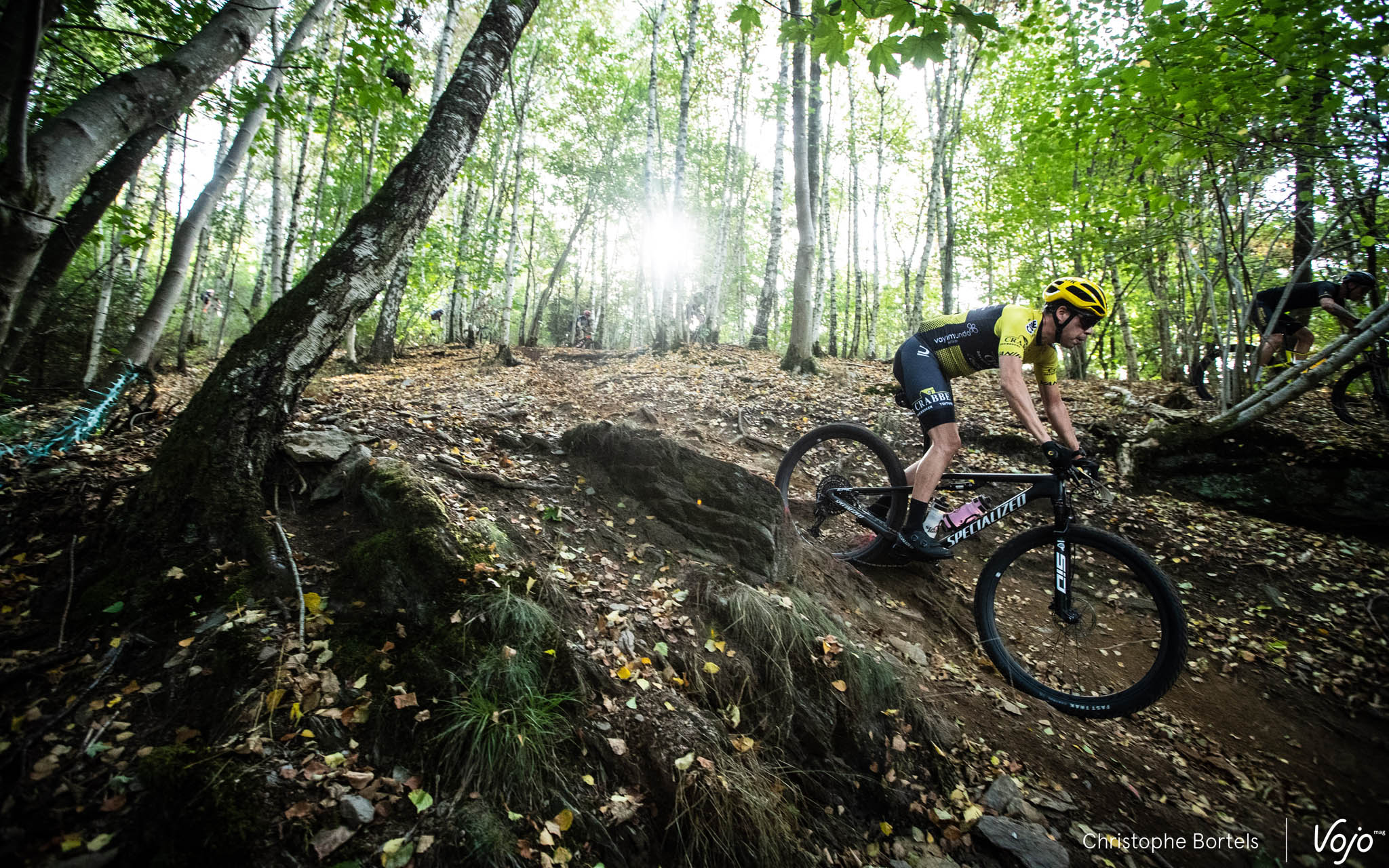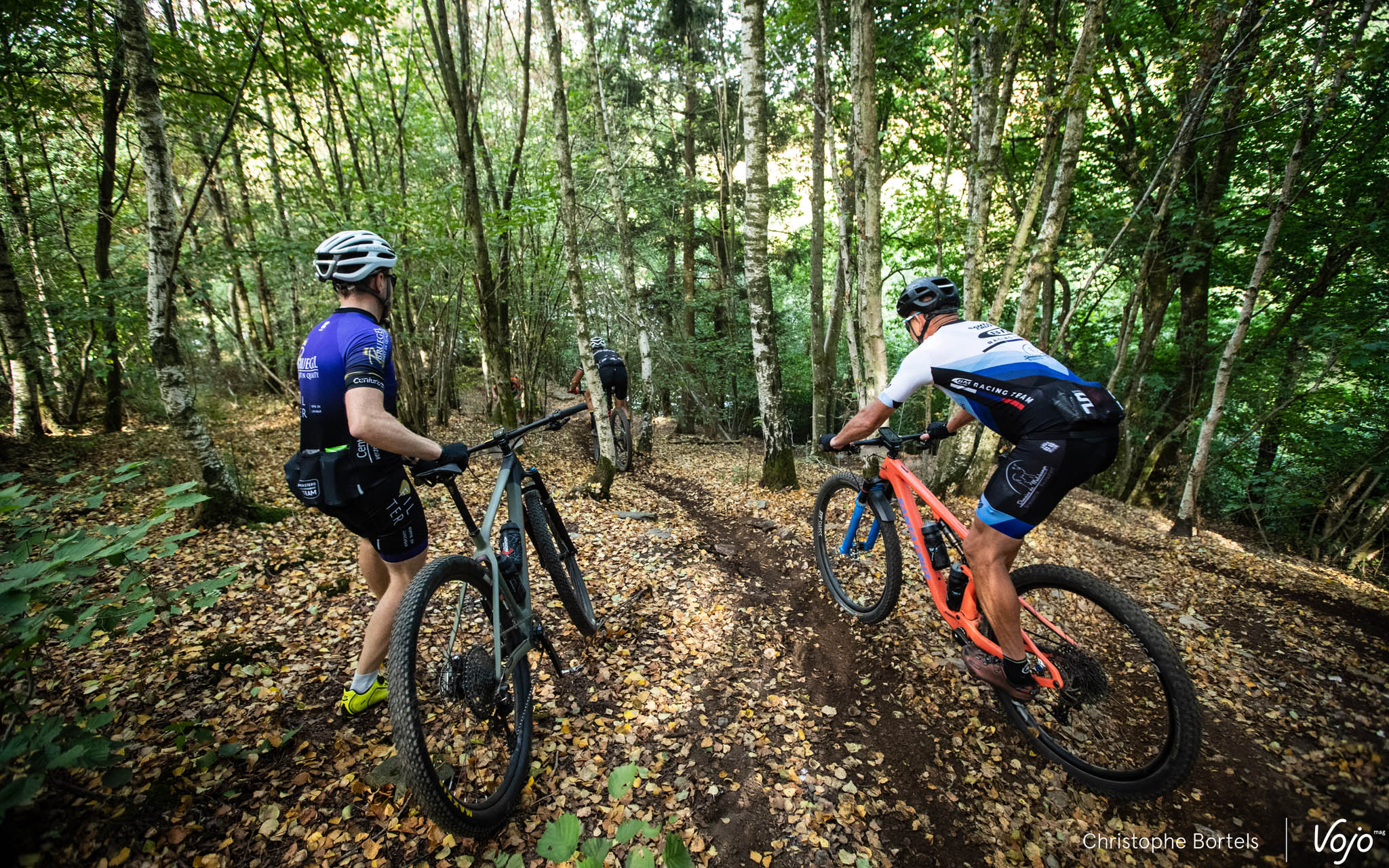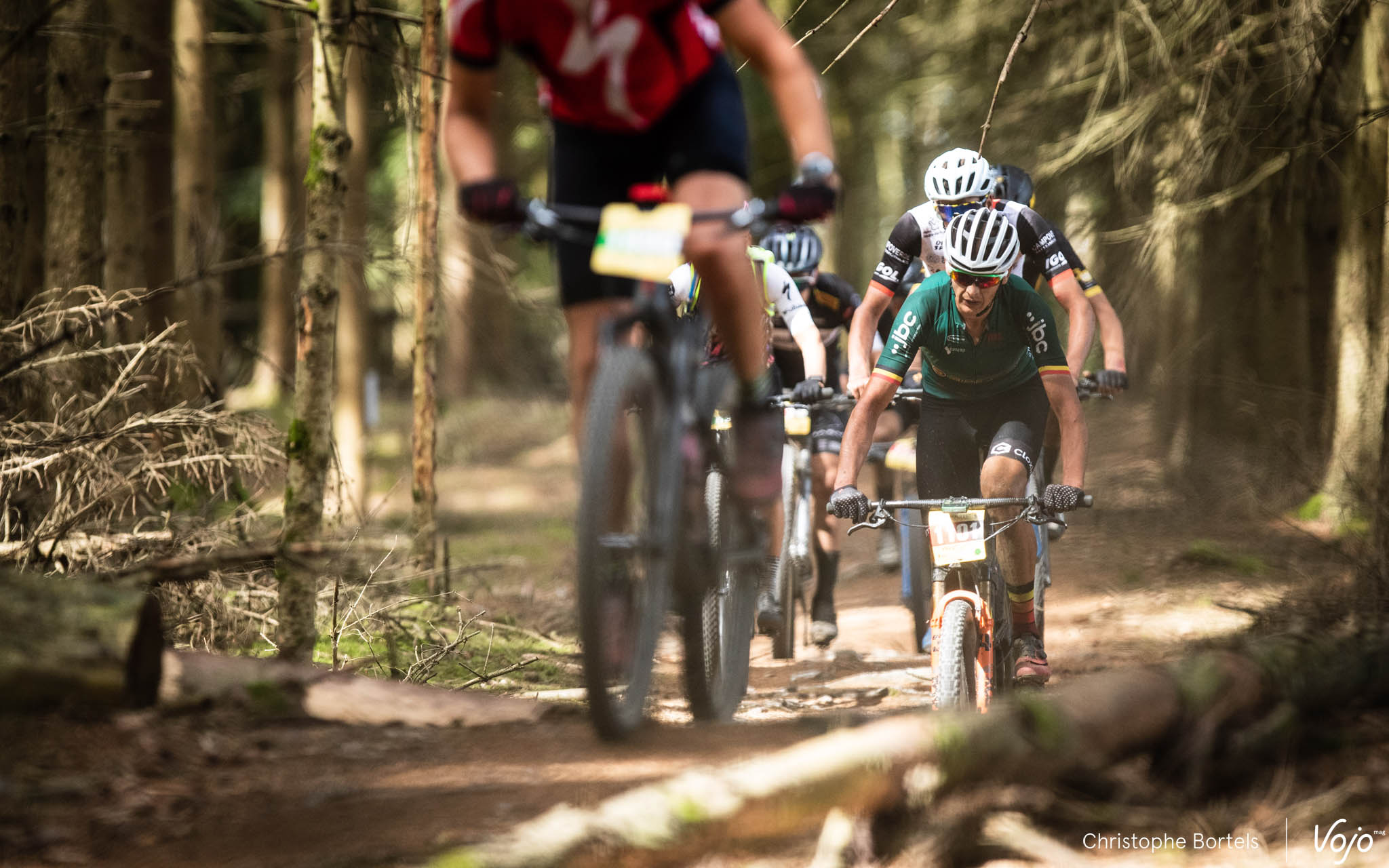 Kilomètre 73 : statu quo alors que les coureurs viennent de passer sur les hauteurs d’Houffalize et empruntent ce bien connu et fort sympathique singletrack.