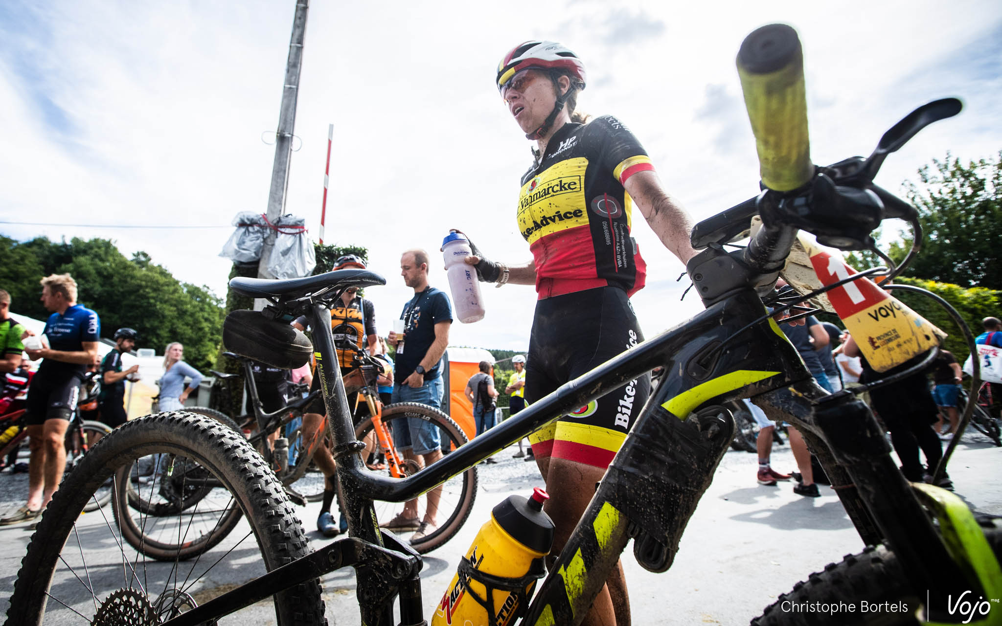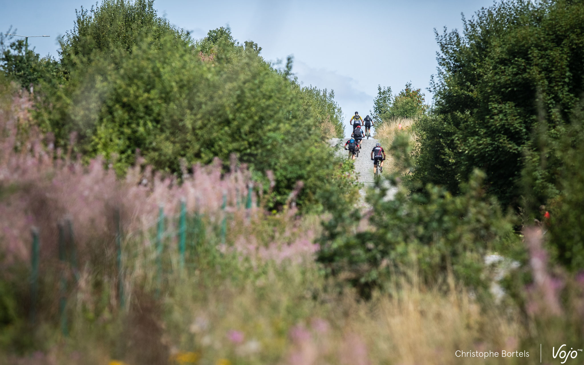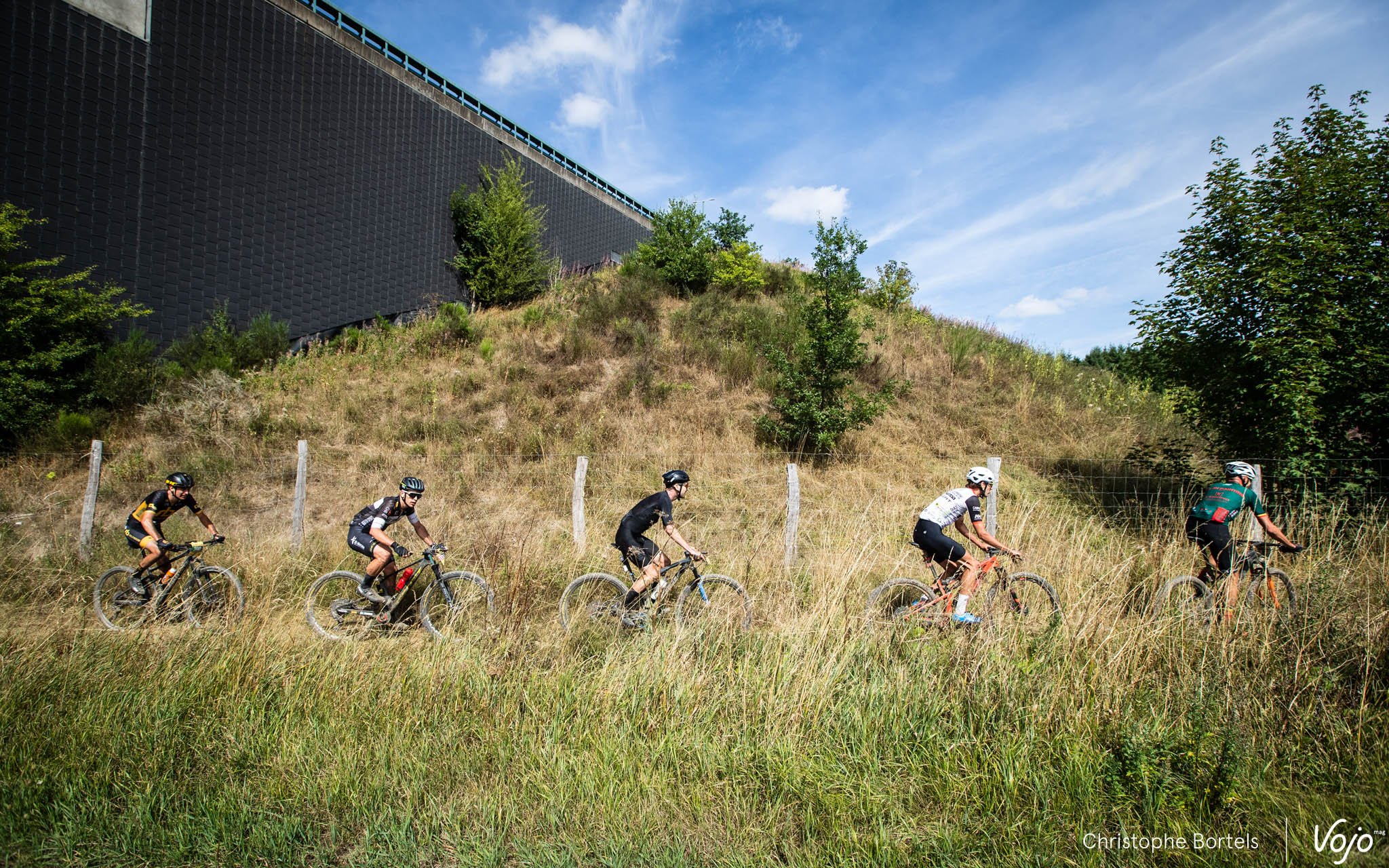 Kilomètre 55 : lors des dernières éditions, c’était une descente rapide et piégeuse. Cette fois, elle est empruntée dans l’autre sens, et c’est un tout autre défi ! Le trio de tête Massaer / Rombouts / Sprengers coince et doit poser pied à terre, ce qui permet à Maxime Dony de recoller… Laurent Evrard, légèrement distancé, fera de même un instant plus tard.