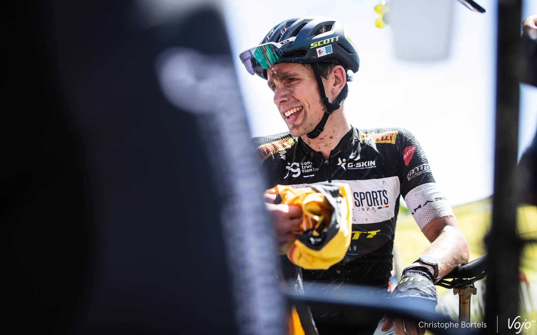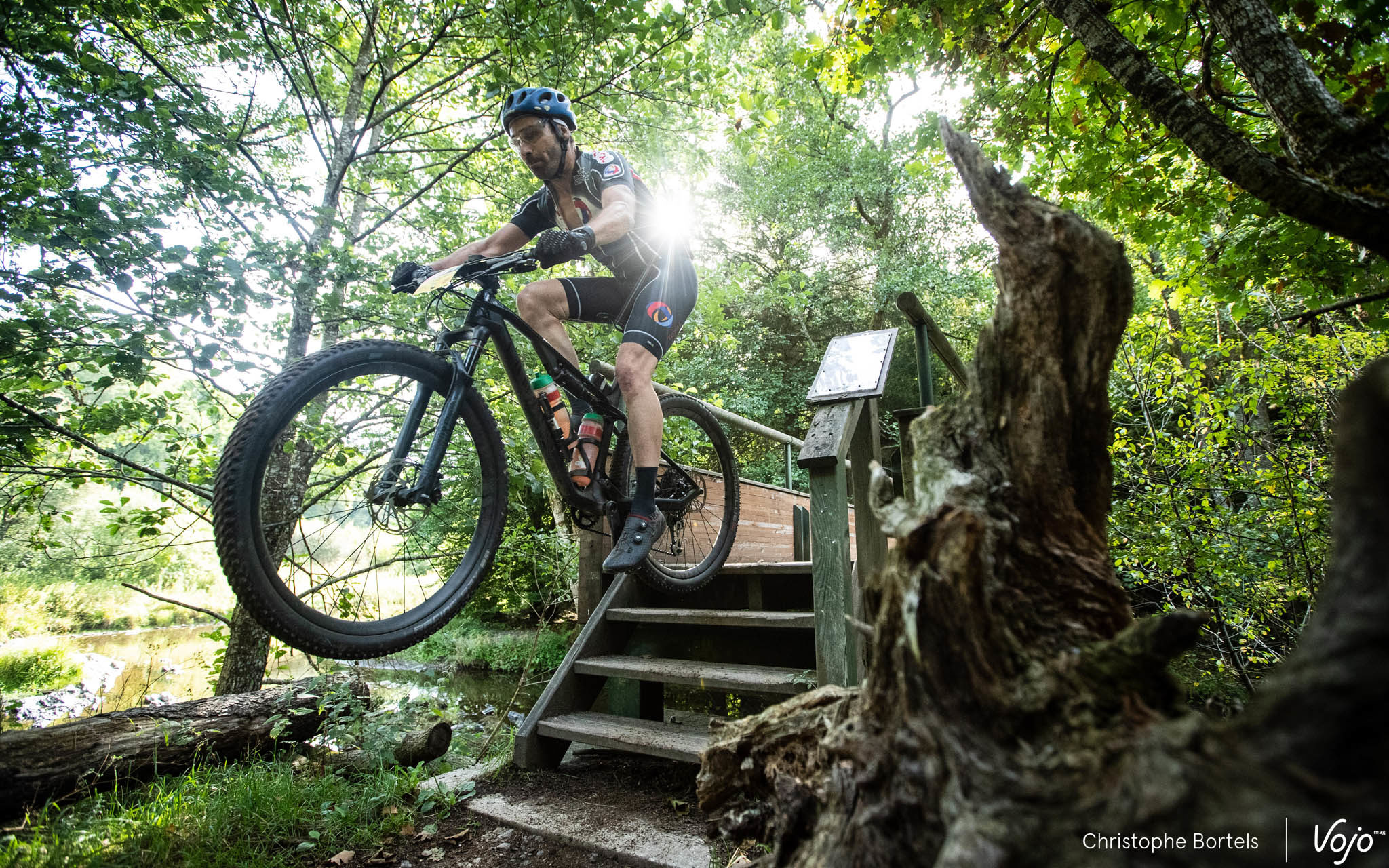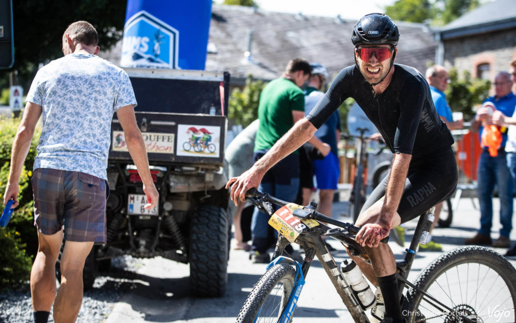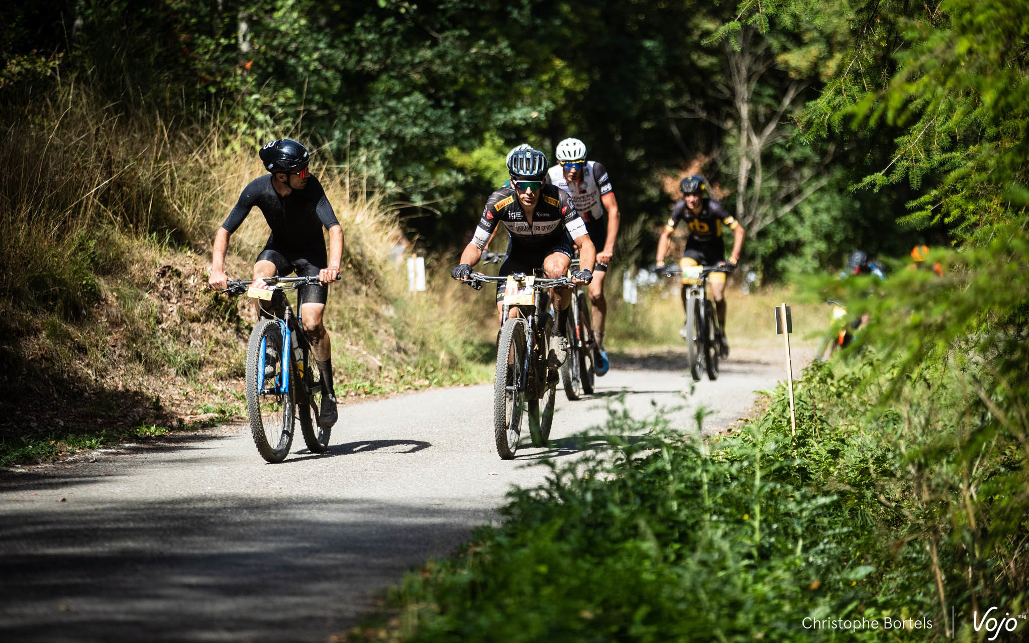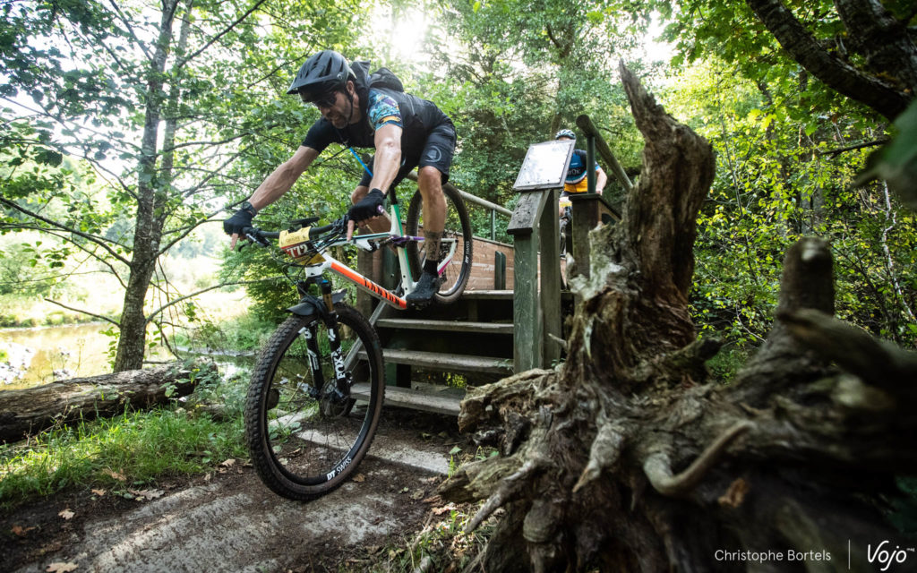 Kilomètre 55 : lors des dernières éditions, c’était une descente rapide et piégeuse. Cette fois, elle est empruntée dans l’autre sens, et c’est un tout autre défi ! Le trio de tête Massaer / Rombouts / Sprengers coince et doit poser pied à terre, ce qui permet à Maxime Dony de recoller… Laurent Evrard, légèrement distancé, fera de même un instant plus tard.