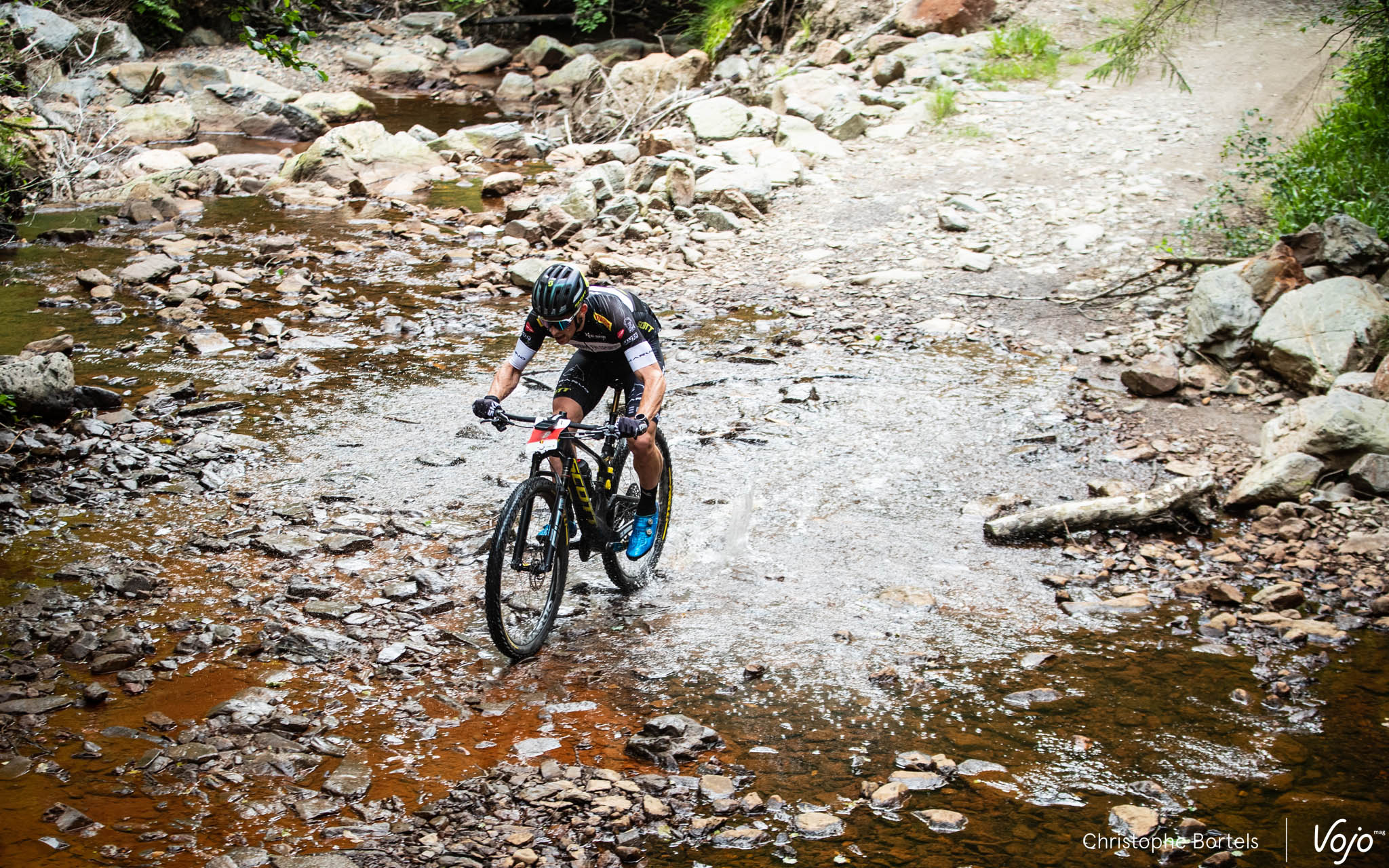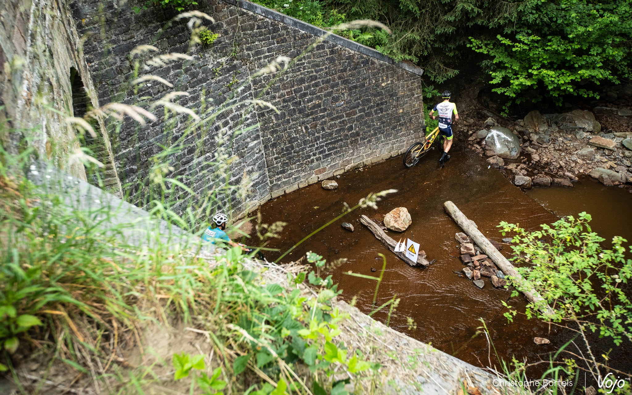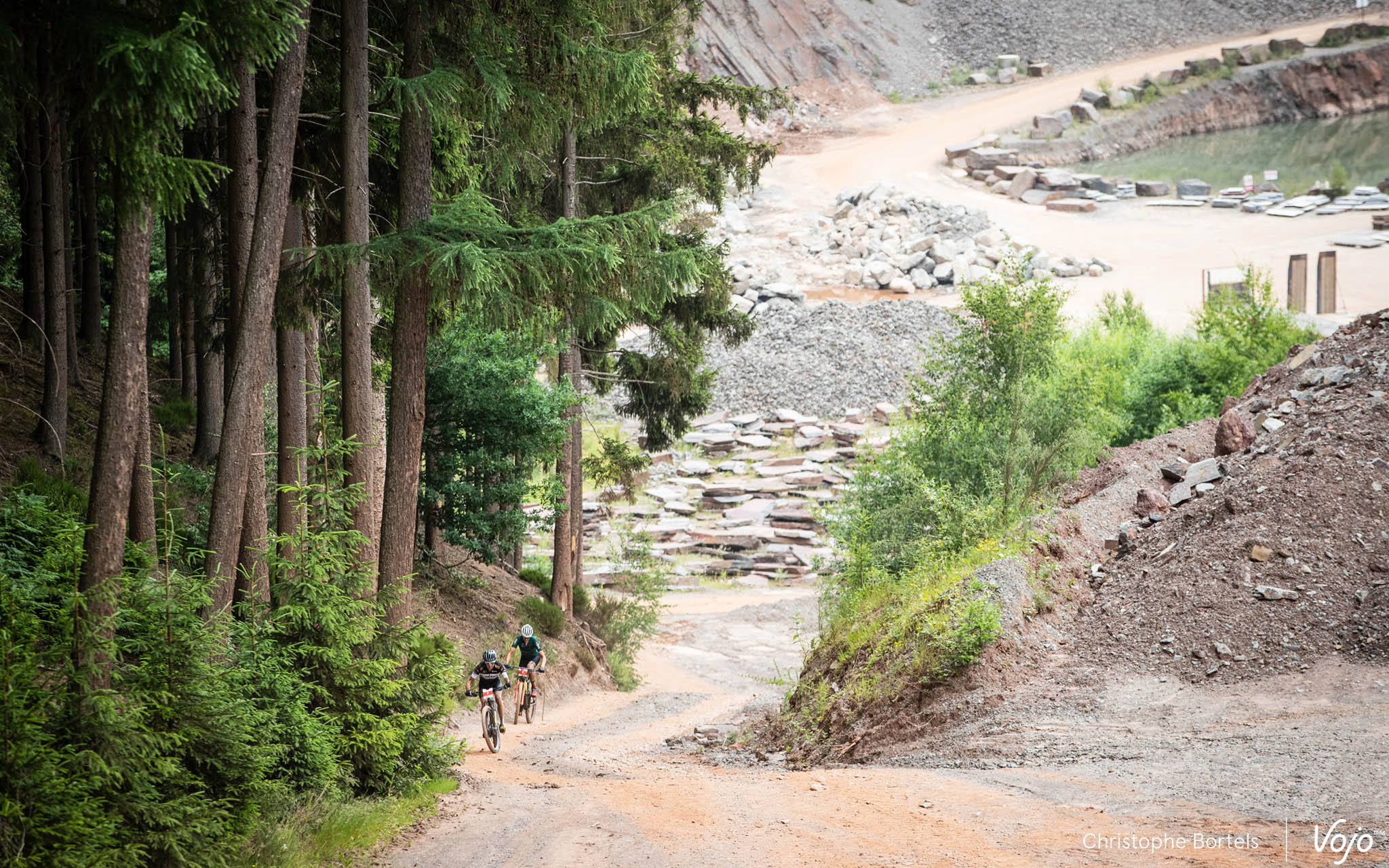 Quatre en tête au KM 61, plus que deux au KM 80 ! On les distingue à peine, mais oui, c’est bien Sébastien Carabin et Joris Massaer. Une quinzaine de mètres les séparent alors dans les forts pourcentages pour sortir de la carrière de la Warche. Juste avant, Massaer a chuté et Carabin, fair-play, s’est assuré qu’il allait bien et l’a attendu, le temps qu’il remette son guidon dans l’axe.
