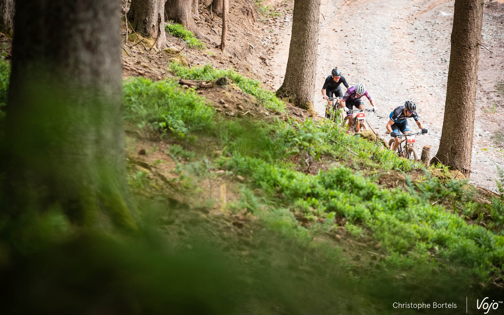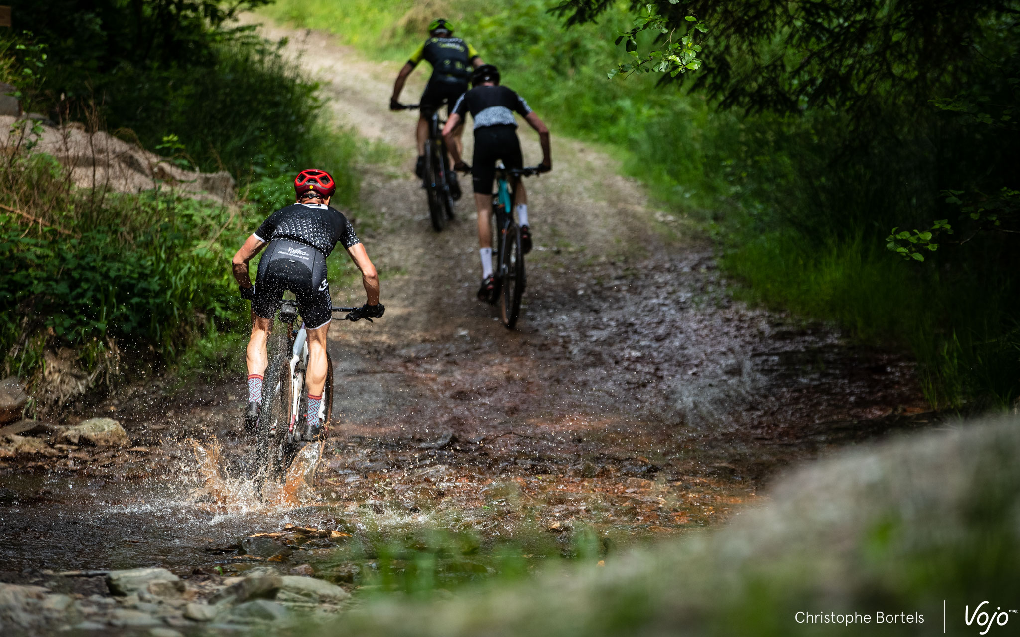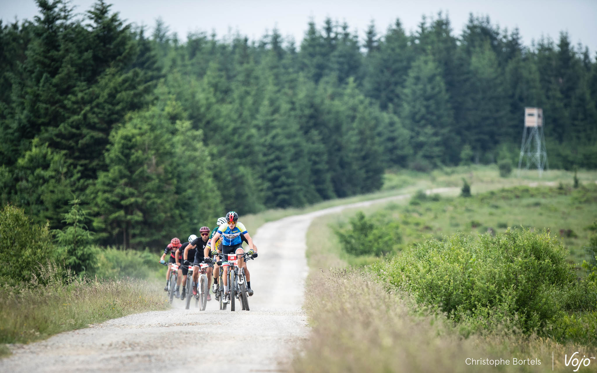 Après avoir placé une attaque dans la première montée, Simon Grégoire est victime d’une crevaison dans la descente rapide qui mène vers les Trôs Marets. Une petite cartouche et c’est reparti… mais il redémarre plus d’une minute et demie derrière le groupe Massaer.