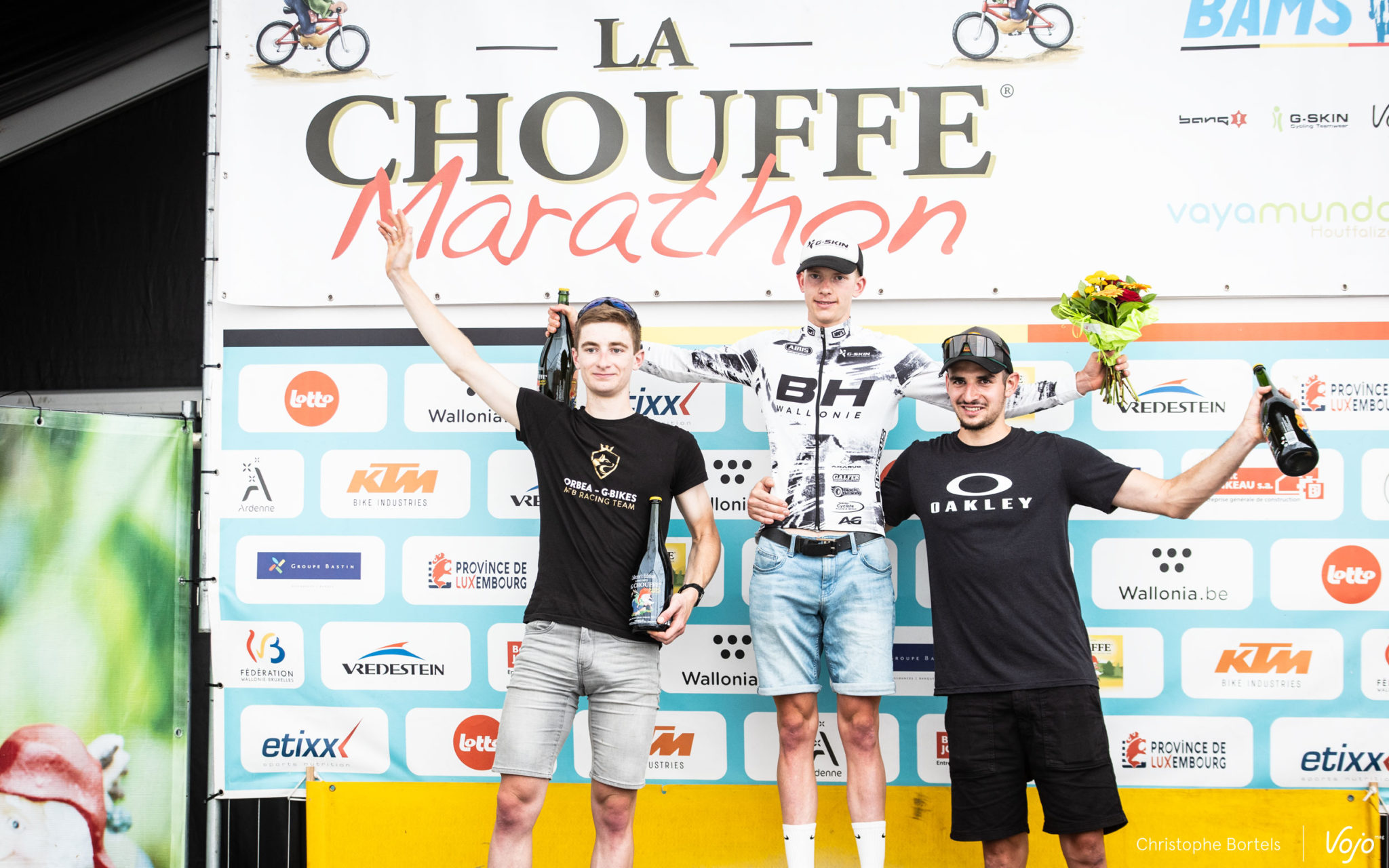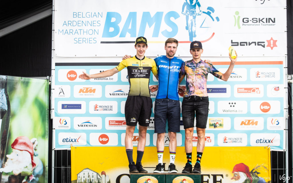 En haut, le podium scratch du 95 km : William Graff (2e), Kevin Panhuyzen (1er) et Joris Massaer (3e).