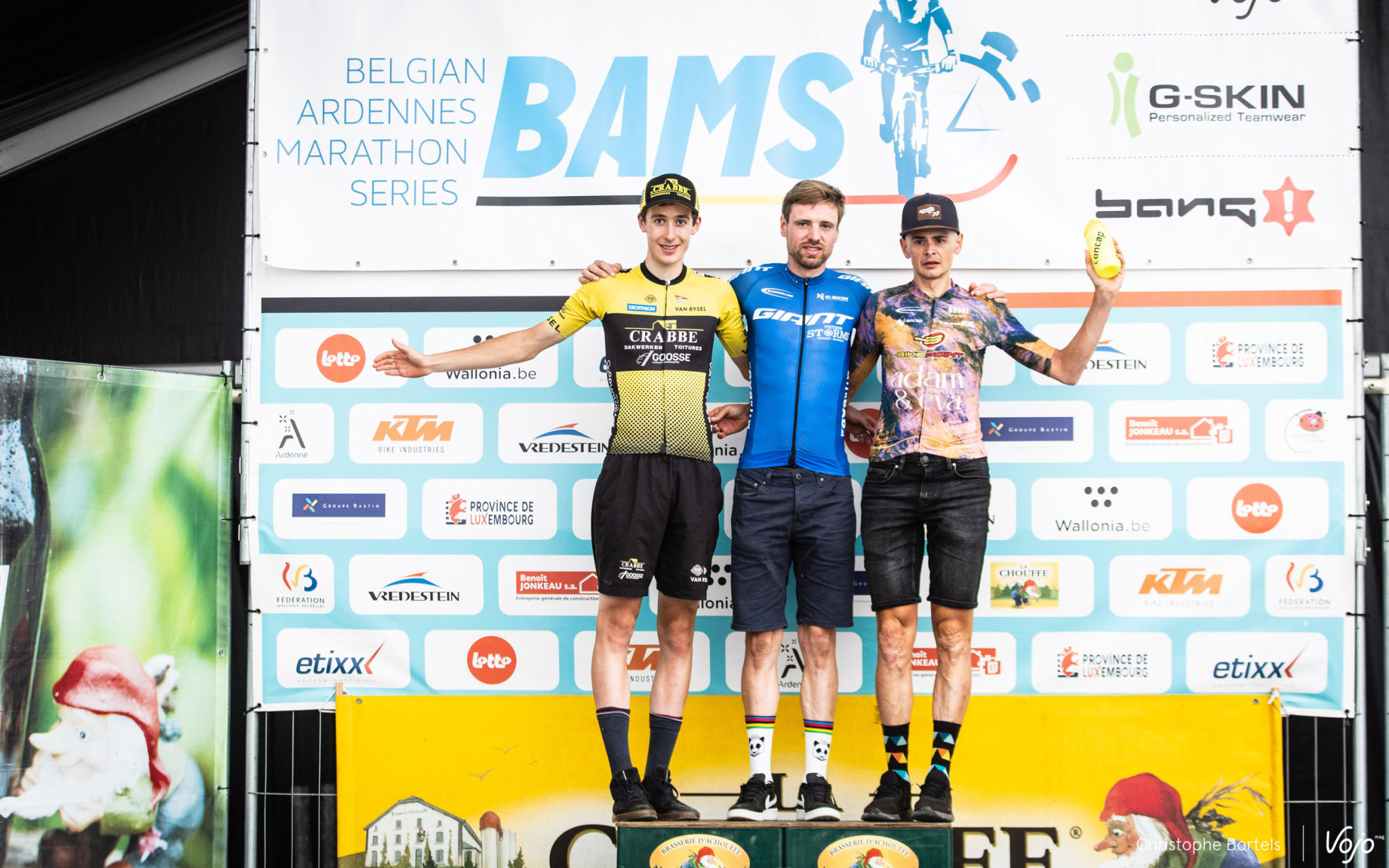 Les leaders BAMS après cinq des sept manches de la saison : Joris Massaer (Master 1), Kris Henderieckx (Master 2) Joyce Vanderbeken (Dames Master), Kimberly Peeters (Dames Elites), Rony Vandael (Master 3) et Robin Ferket (Espoirs). On notera l’absence pour ce podium de Thomas Sprengers, leader chez les Elites, qui n’a pas réalisé la course qu’il espérait et termine 28e, sans qu’on connaisse les raisons de cette contre-performance au moment d’écrire ces lignes.