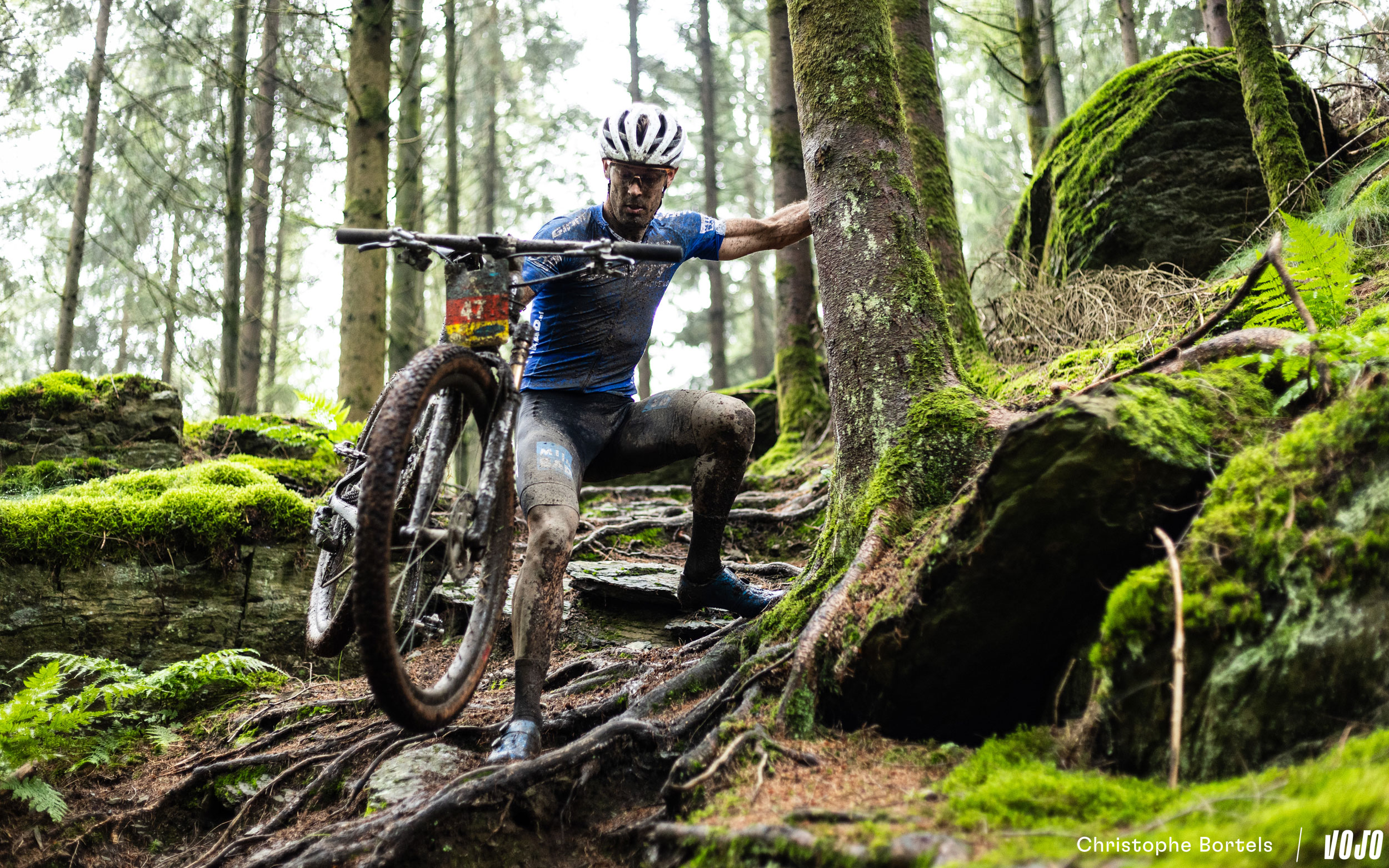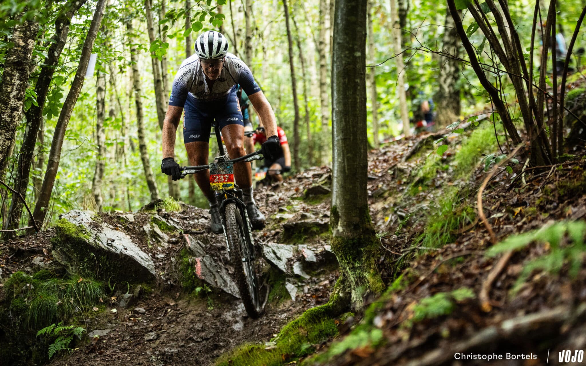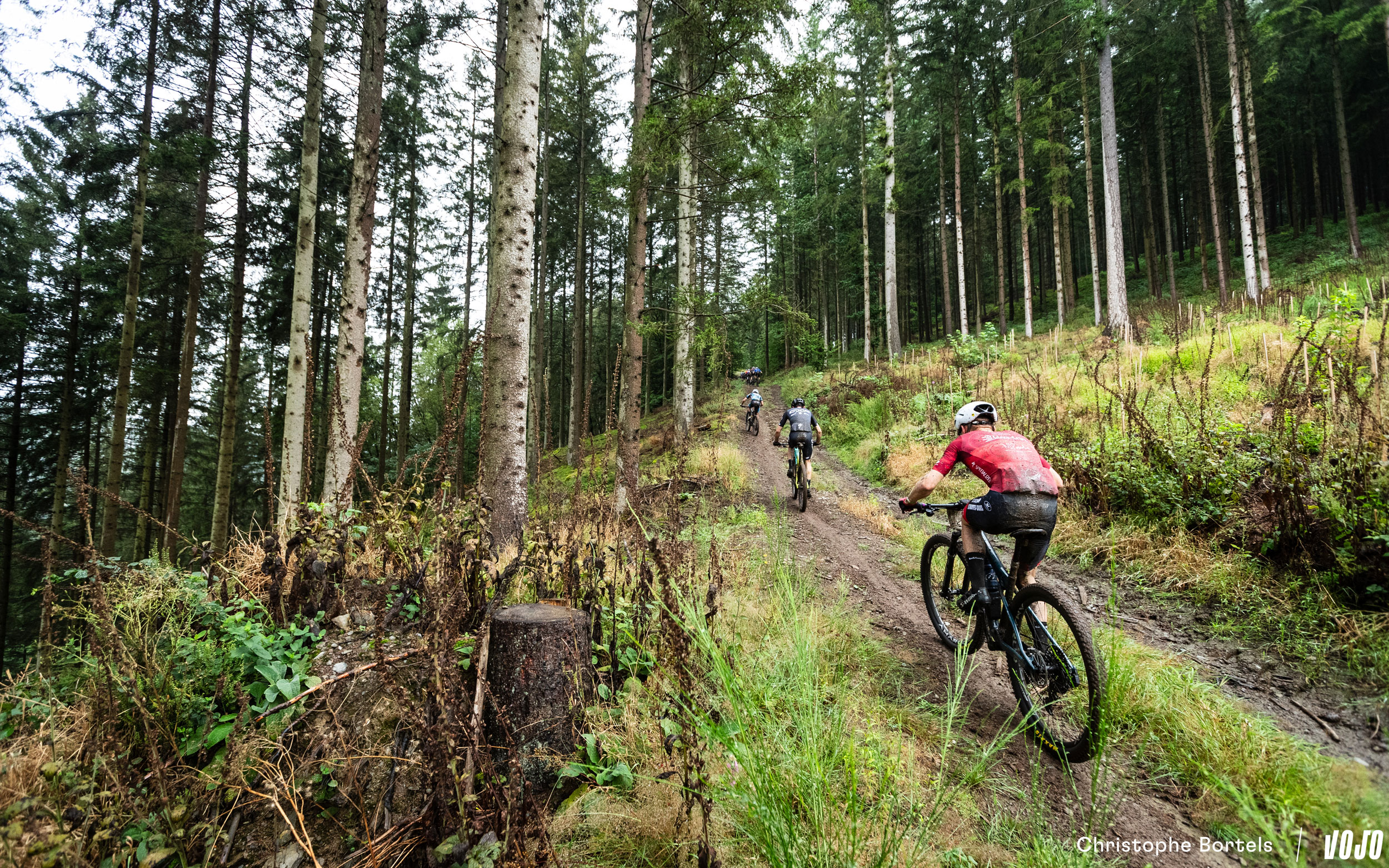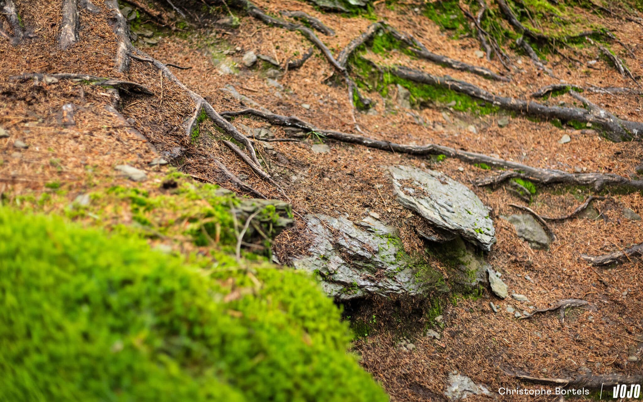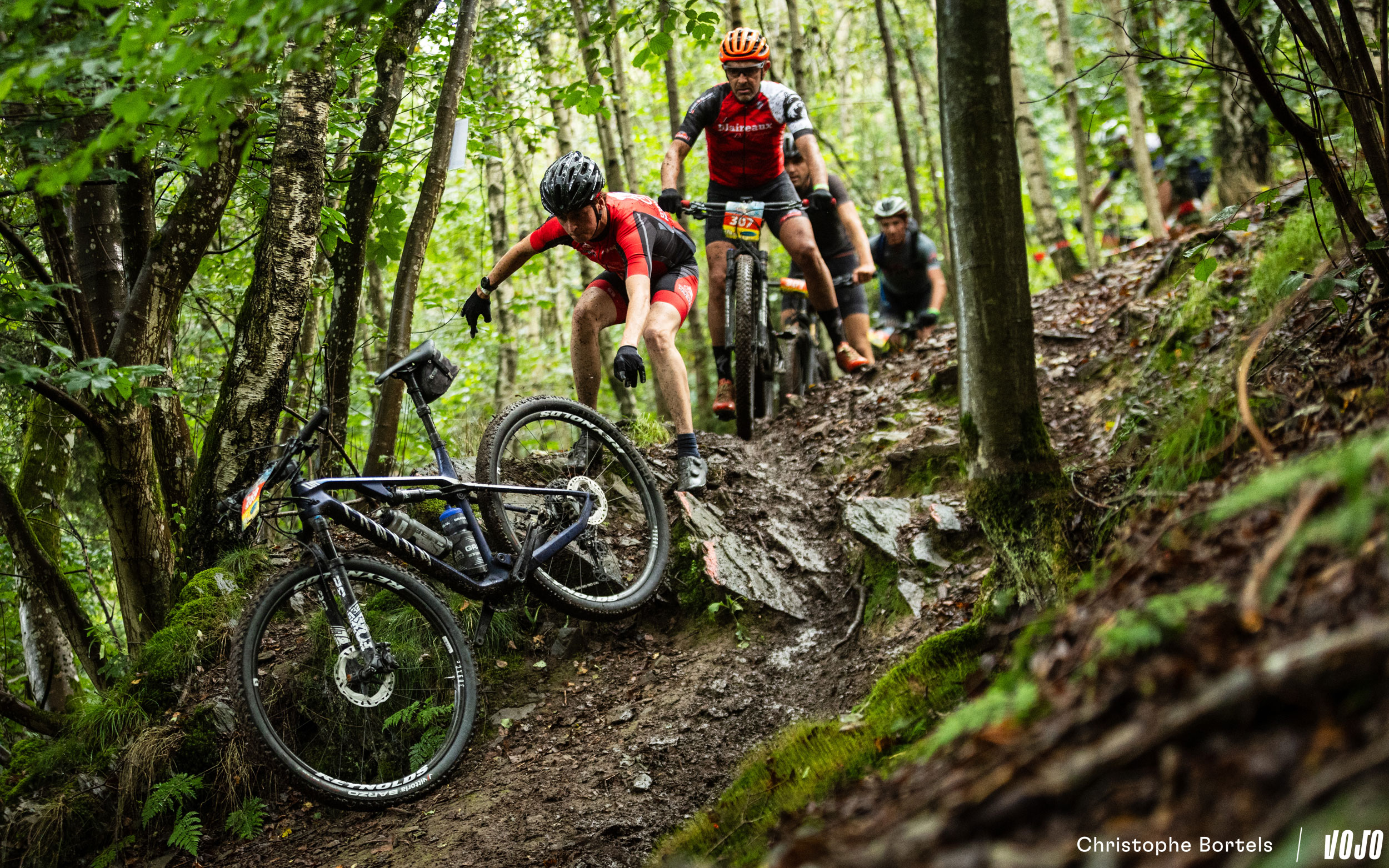 Au kilomètre 55, on retrouve cette impressionnante descente technique qui pourrait figurer sans problème dans une spéciale d’enduro. Les racines sont humides, ça promet du spectacle…