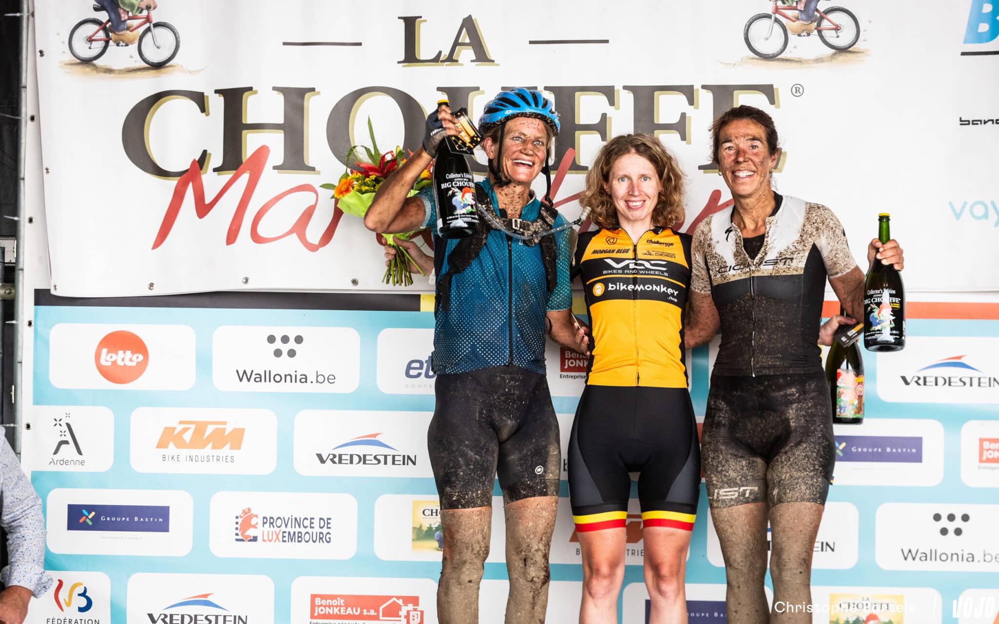 Les podiums scratch du 95 km : Cindy Volkerink (3e), Joyce Vanderbeken (1ère) et Karen Steurs (2e) chez les femmes, Milan Stiens (3e), Wout Janssen (1er) et Simon Grégoire (2e) chez les hommes.