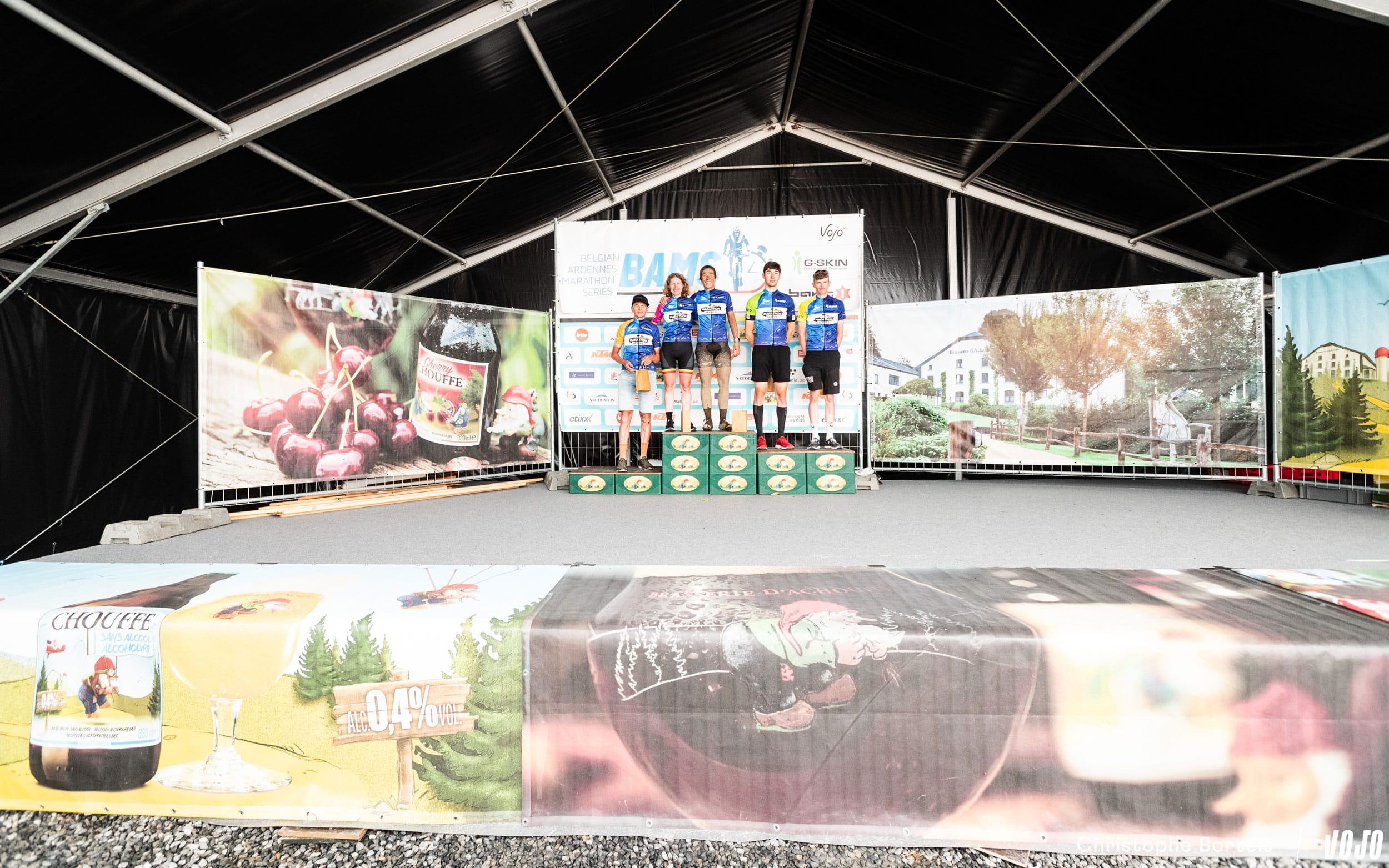 Les leaders du classement BAMS après 5 des 7 manches de la saison : Joris Massaer (Master 1), Joyce Vanderbeken (Femmes Elites), Karen Steurs (Femmes Master), Robin Ferket (Espoirs) et Simon Grégoire (Elites). Absents pour le podium, Ramses Bekkenk et Mario Vandenhouten dominent respectivement les classements Master 2 et Master 3.