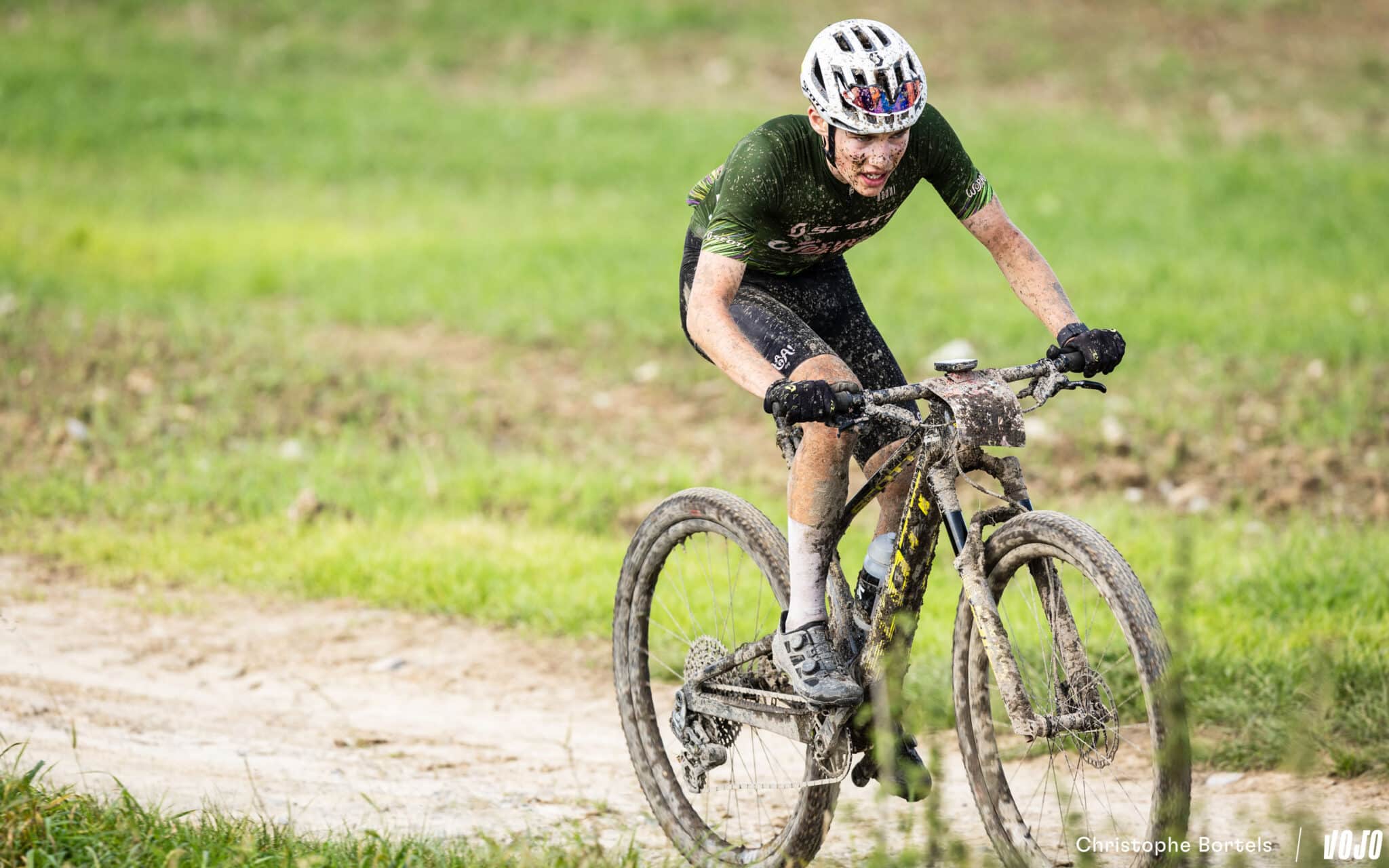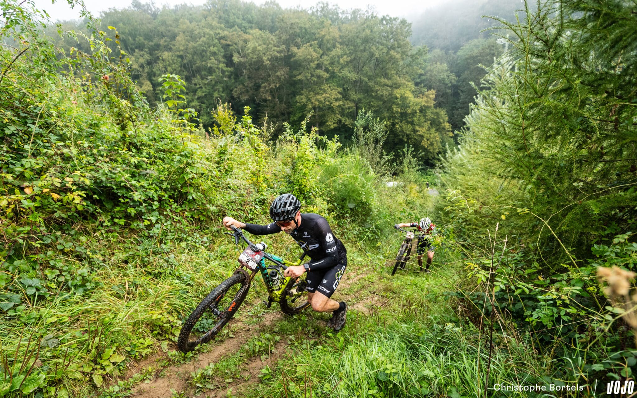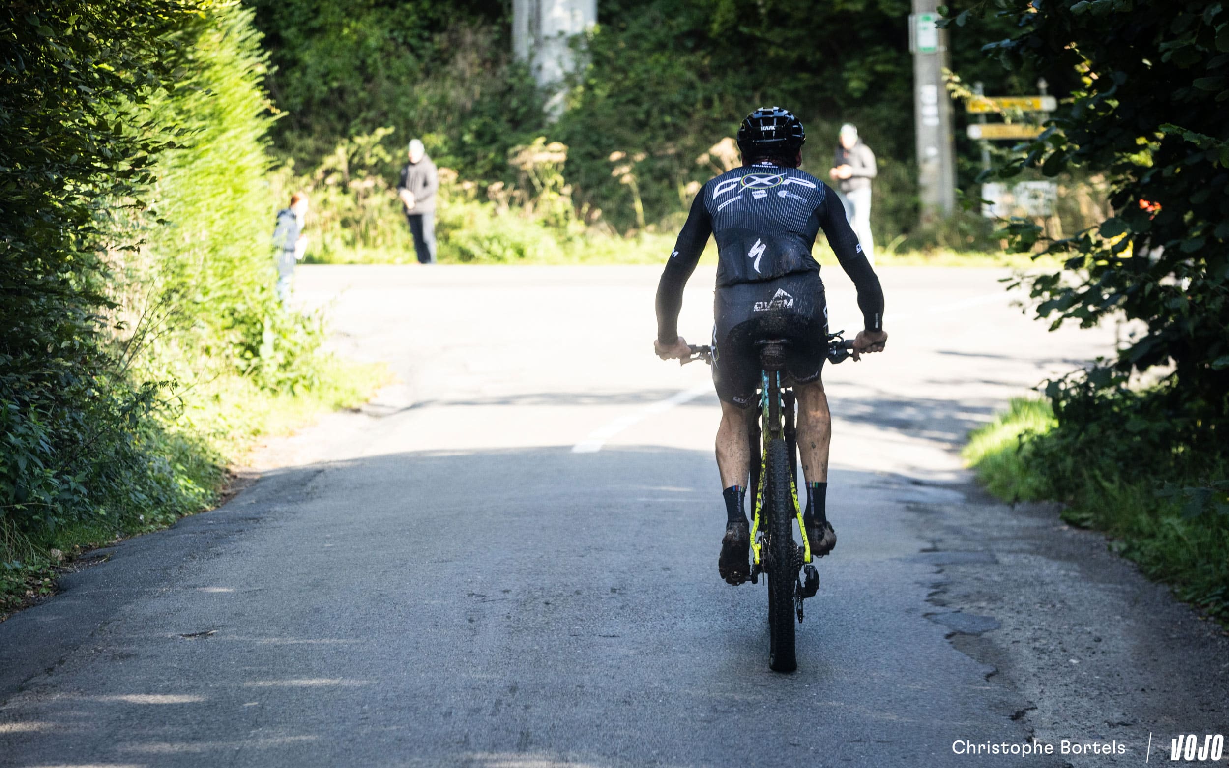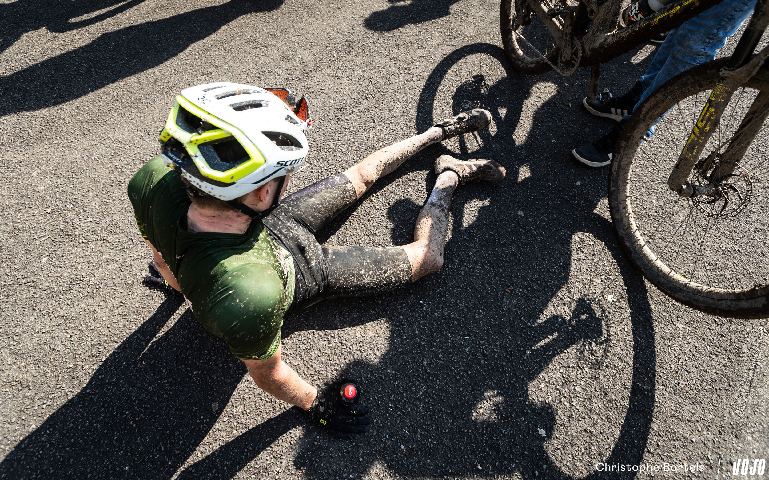 Cinq kilomètres après la montée impossible, Kryspin Pyrgies voit tous ses espoirs de revenir sur le groupe de tête ruinés par une crevaison du pneu arrière. Déception pour celui qui avait pris une très belle 2e place la semaine dernière sur le Grand Raid Godefroy.