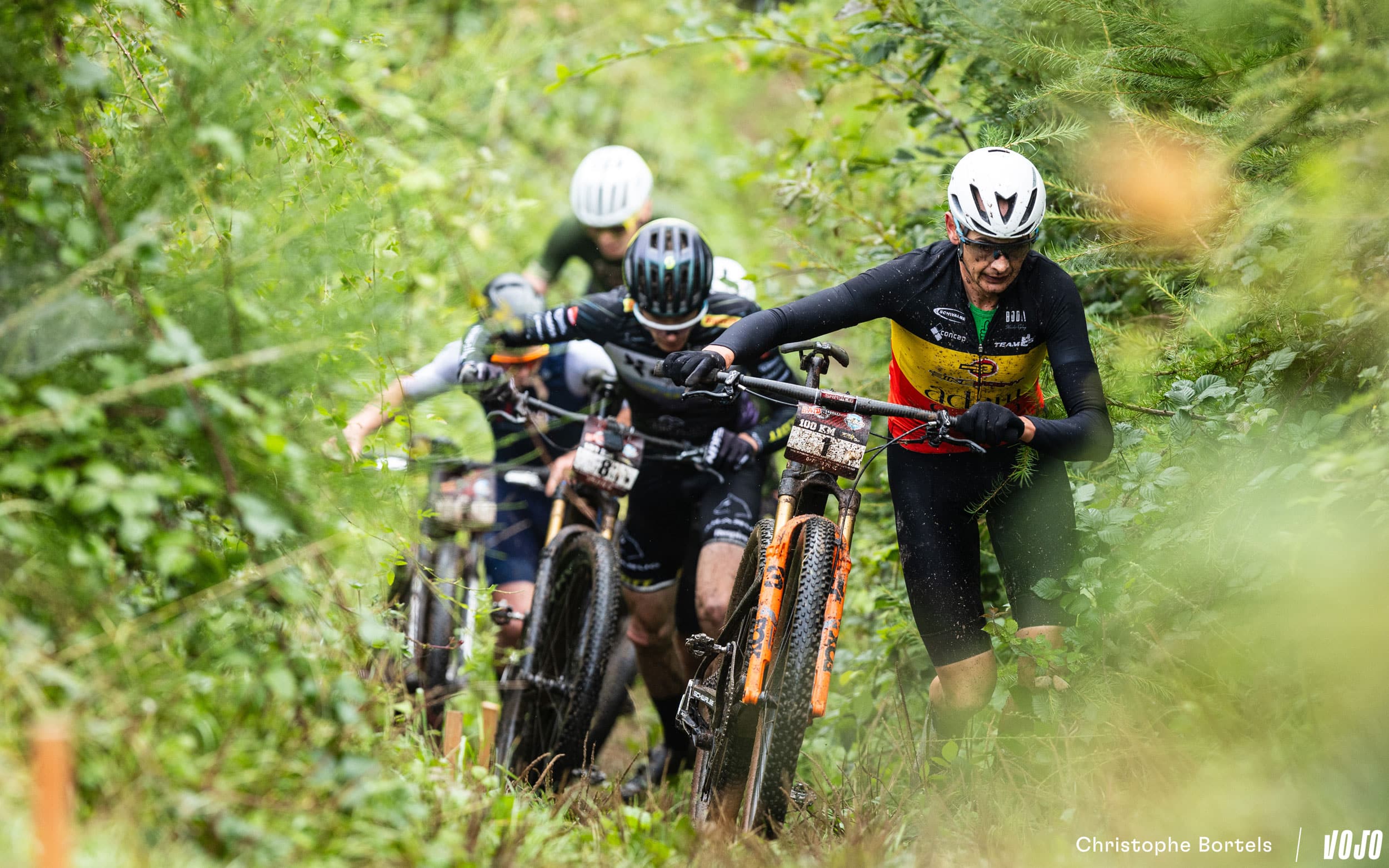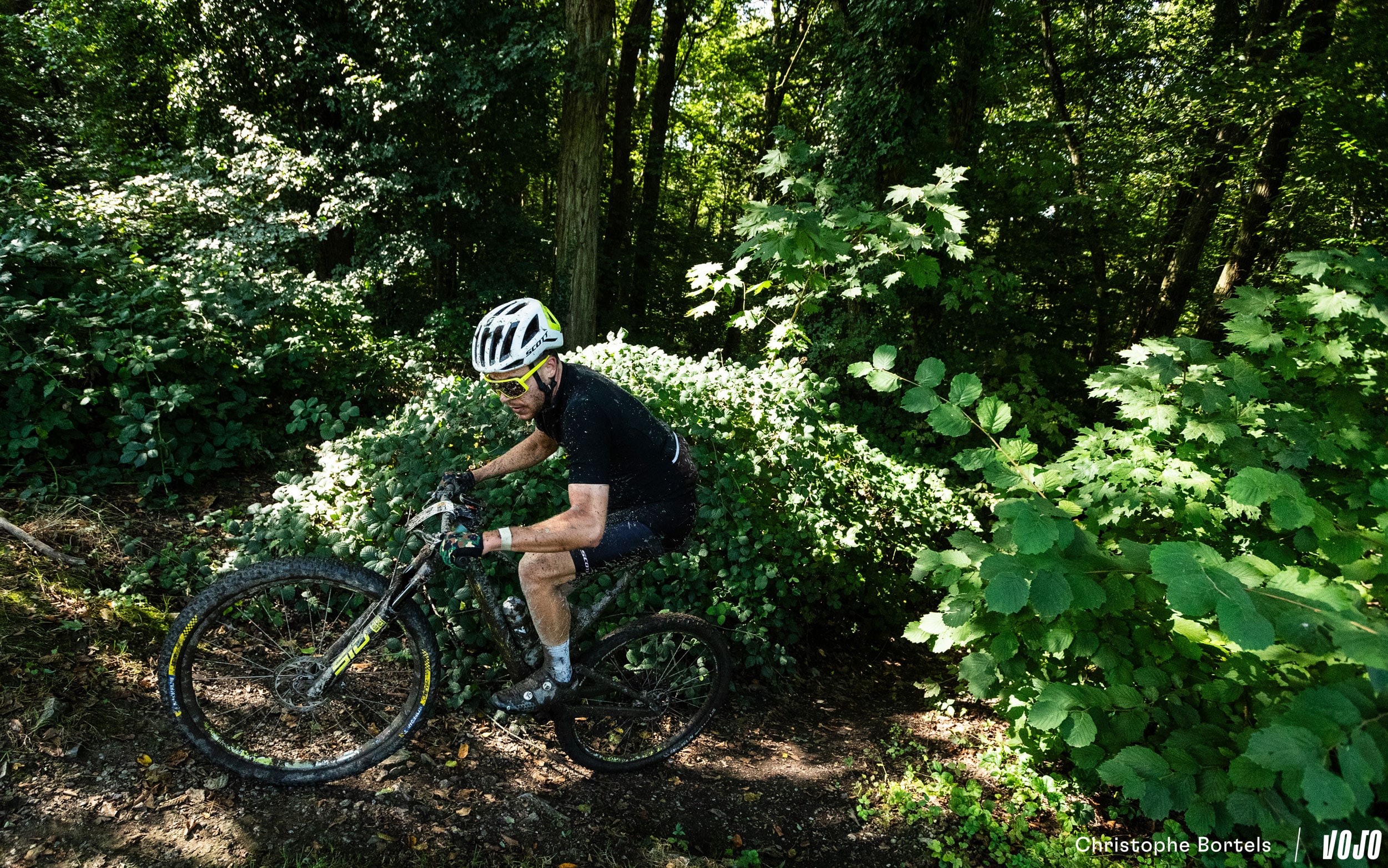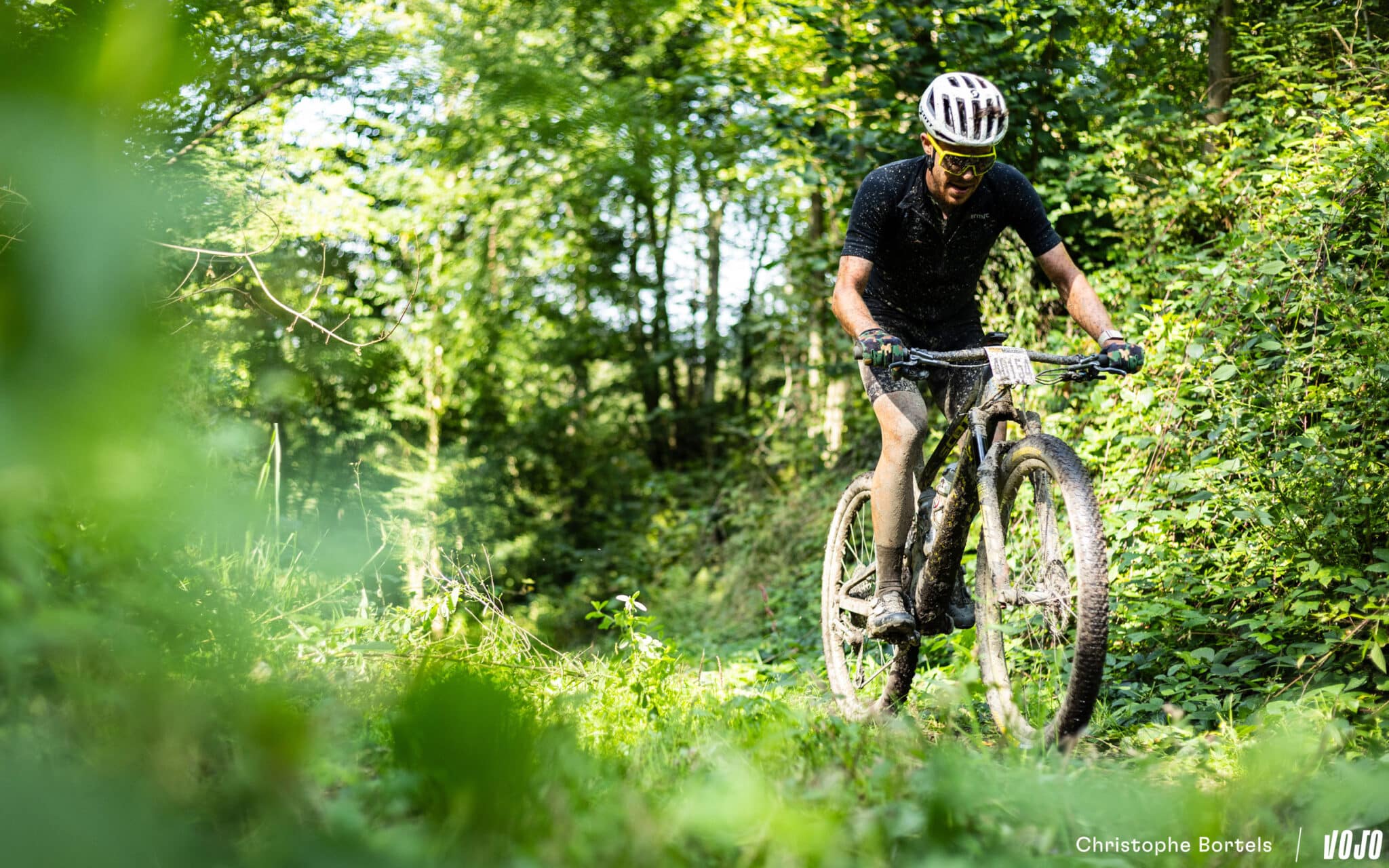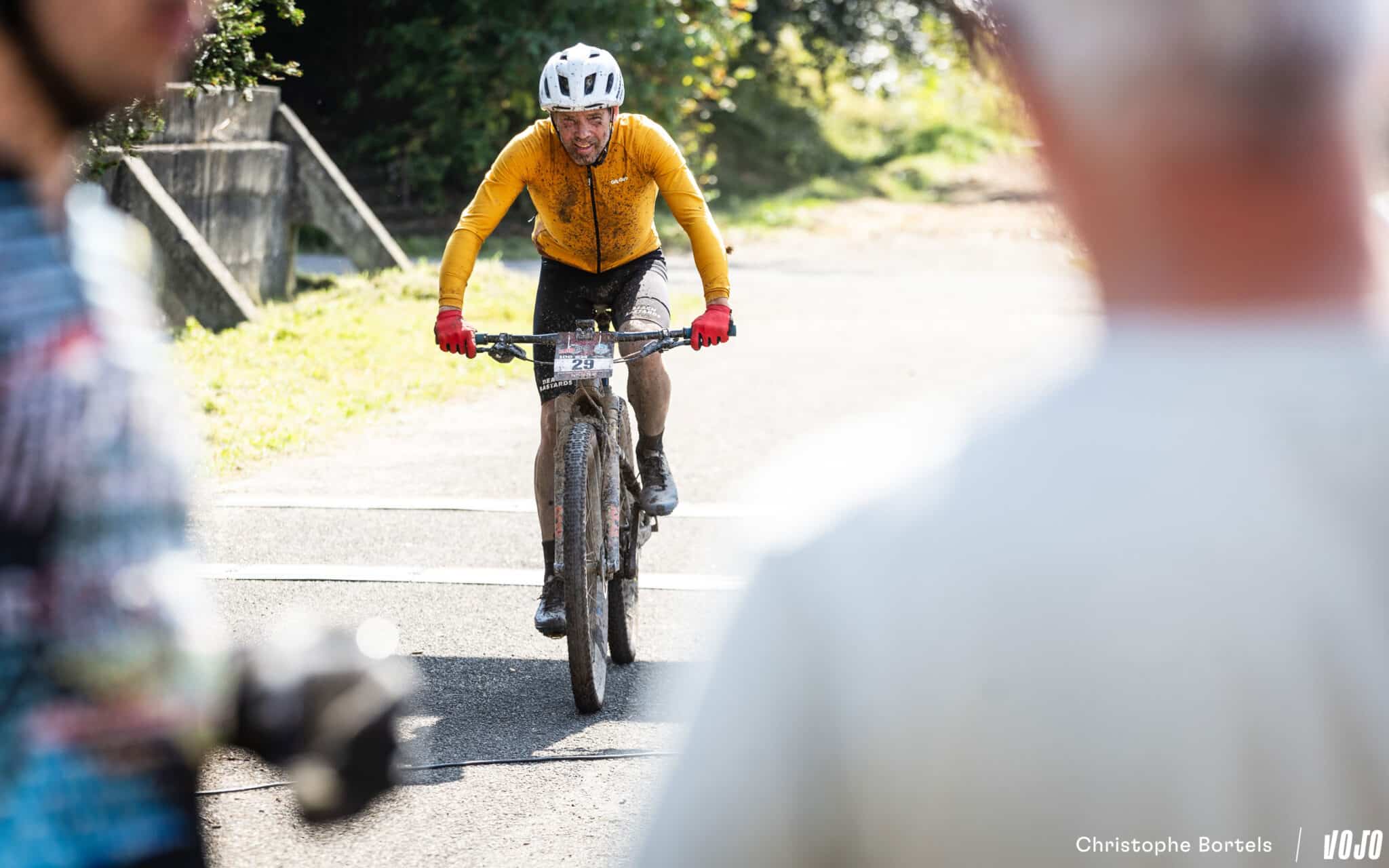 Cinq kilomètres après la montée impossible, Kryspin Pyrgies voit tous ses espoirs de revenir sur le groupe de tête ruinés par une crevaison du pneu arrière. Déception pour celui qui avait pris une très belle 2e place la semaine dernière sur le Grand Raid Godefroy.