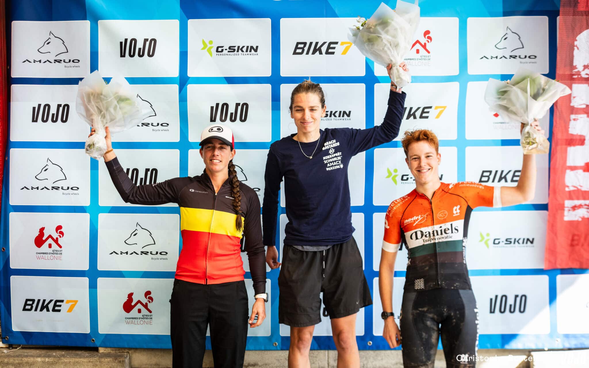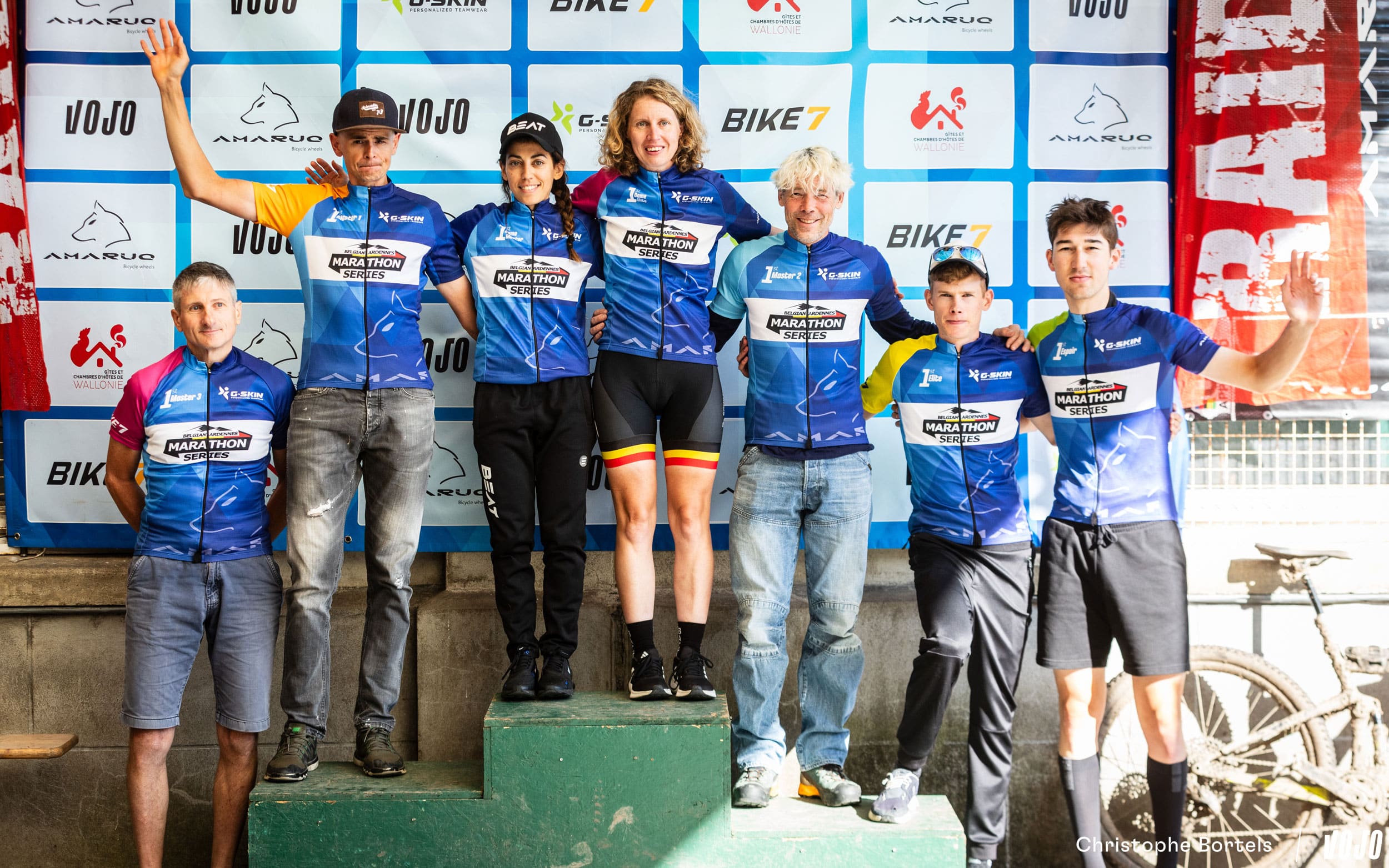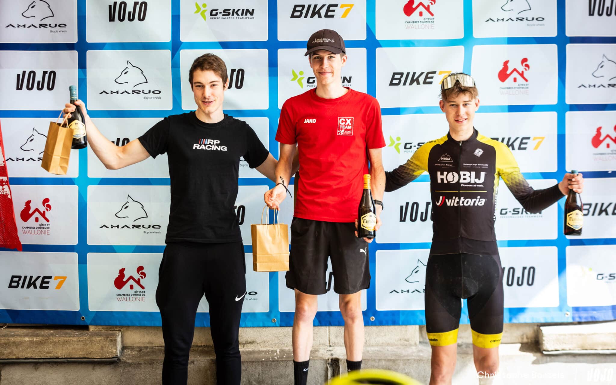 Les vainqueurs finaux, de gauche à droite : Luc Klopp (Master 3, devant Luc Koning et Rudi Moons), Joris Massaer (Master 1, devant Kryspin Pyrgies et Willem de Beyter), Danae Stroubouli (Dames Master, devant Karen Steurs et Sara Michielsens), Joyce Vanderbeken (Dames Elites, devant Puck Pinxt et Ruth Vermeiren), Ramses Bekkenk (Master 2, devant Ivan Scevenels et Arne Broekmans), Simon Grégoire (Elite, devant Arthur Courtois et Tim de Schuyter) et Robin Ferket (U23, devant Alexy Delongueville et Jonas Mertens).
