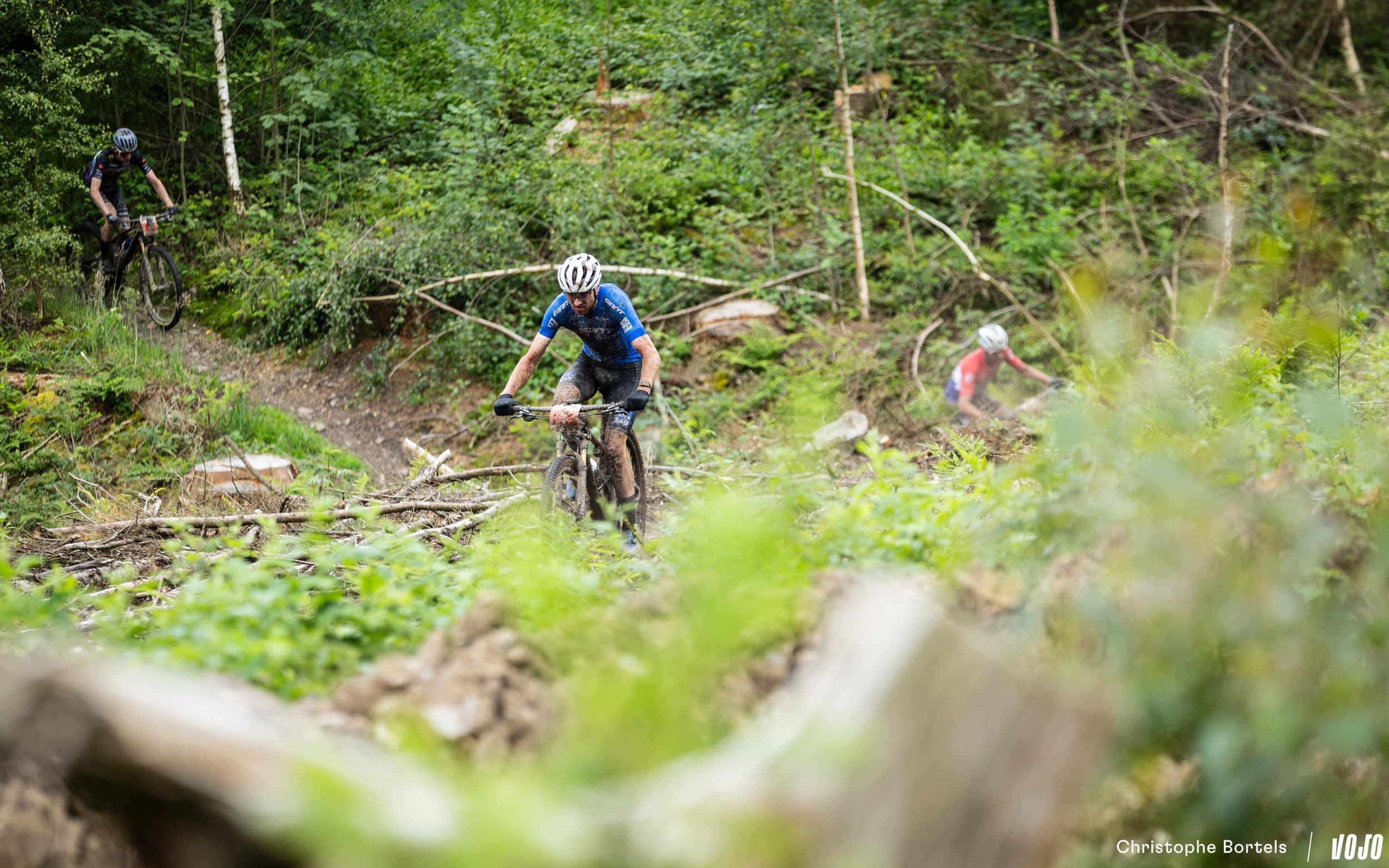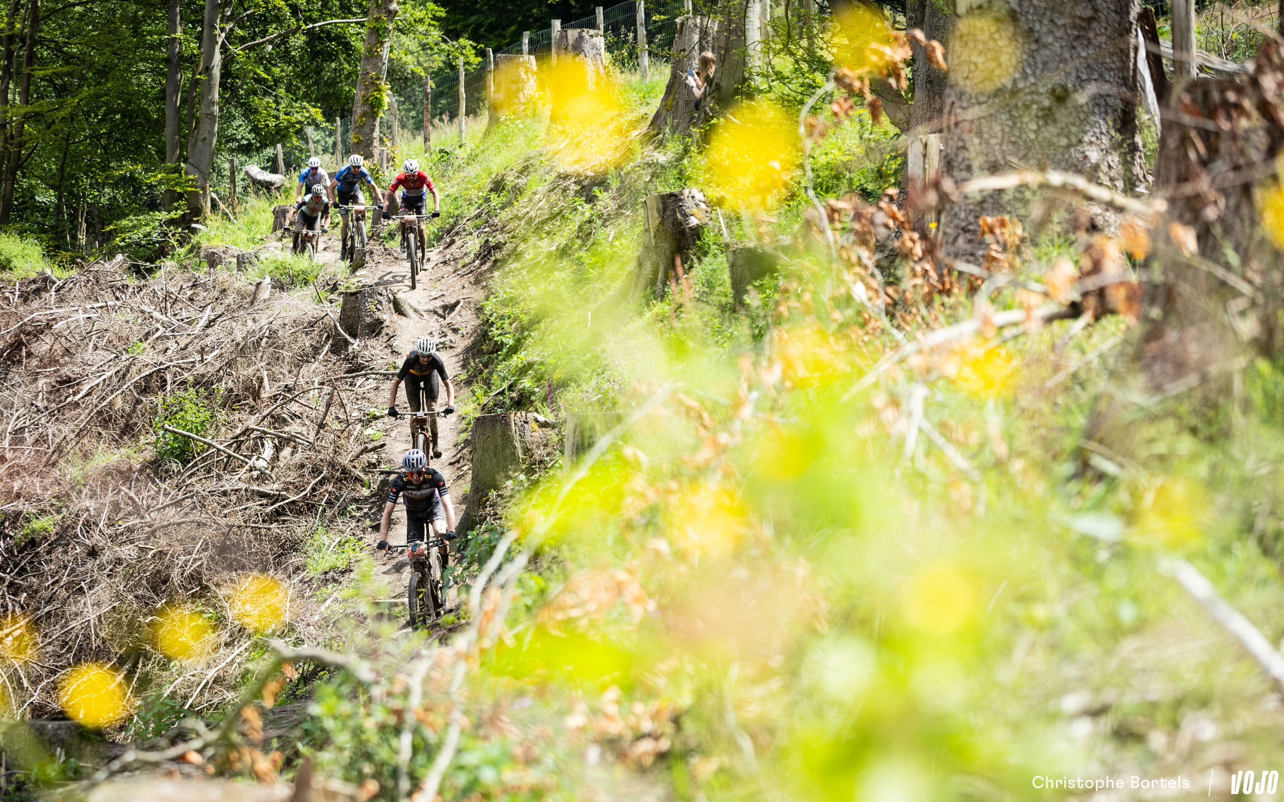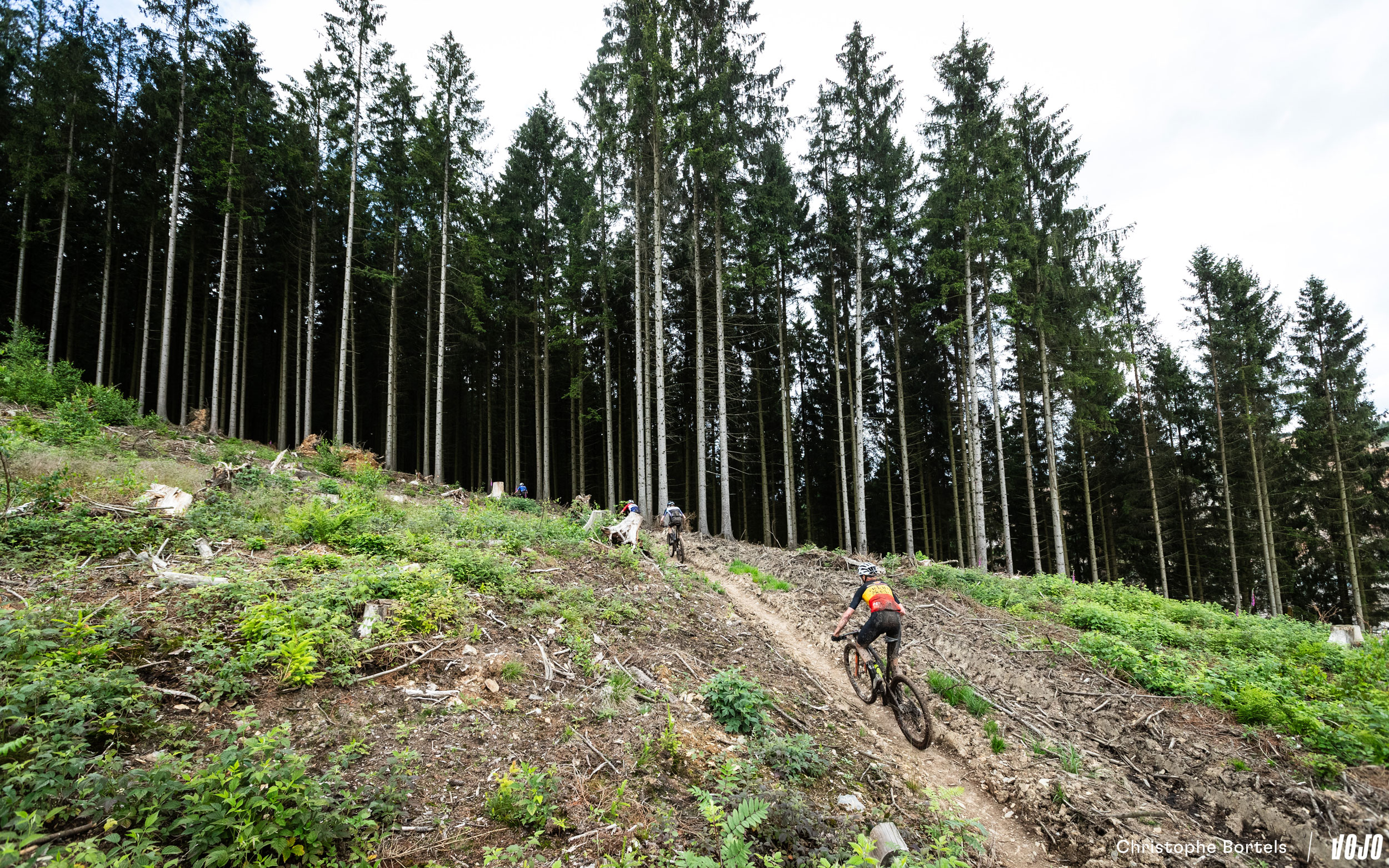 Décroché du groupe de tête, Bas Peters vient tout de même à bout de cette portion bien raide et bourrée de racines. Il faut dire qu’à l’occasion de la coupe à blanc, le sentier a été modifié, et qu’il est encore plus technique qu’avant…