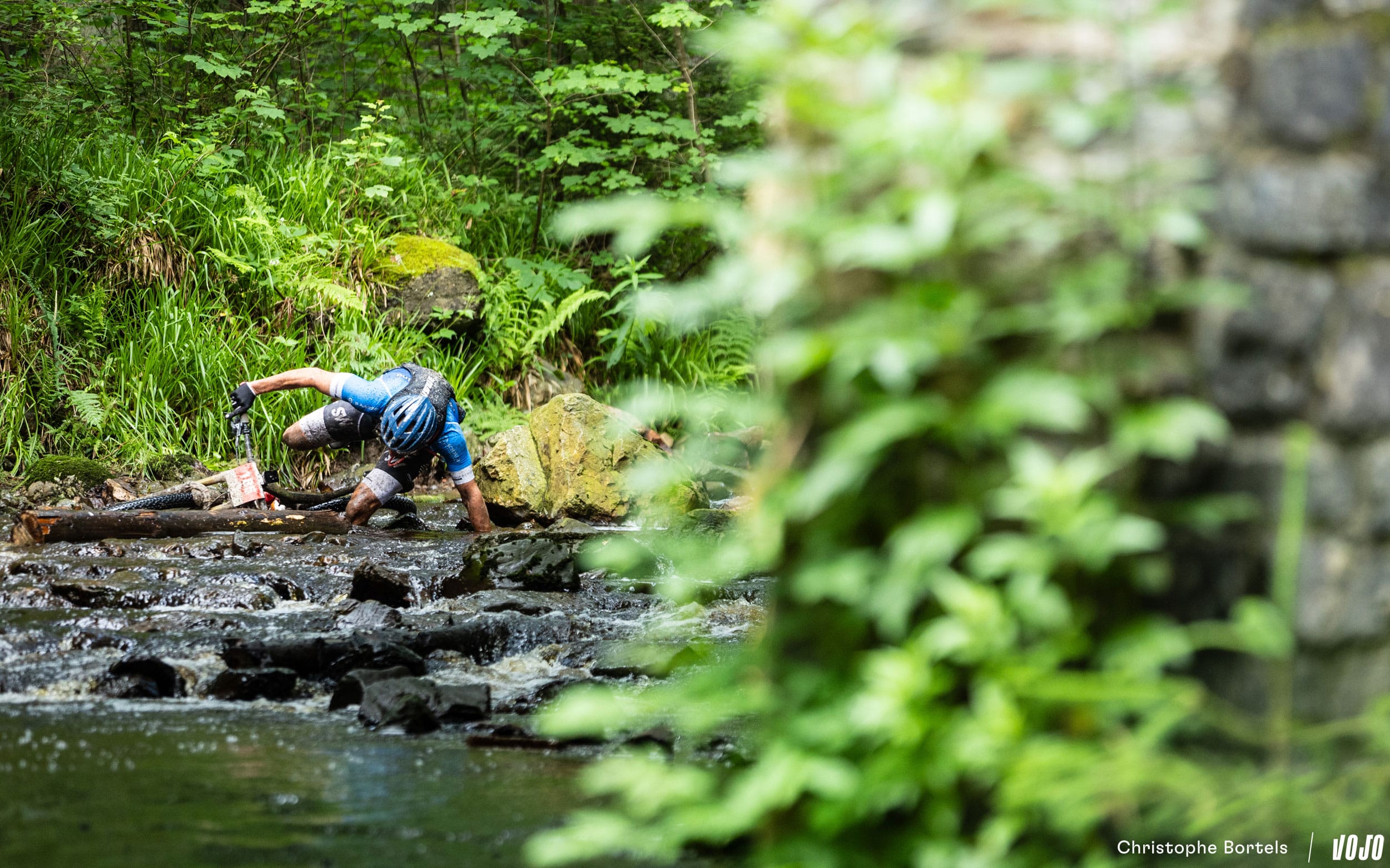 Nous revoilà dans la vallée du Trôs Marets, mais dans l’autre sens cette fois. Déjà piégeuse en temps normal, cette traversée de rivière l’est encore plus cette année, alors les organisateurs ont pris soin d’orienter les concurrents vers un petit couloir de pierres improvisé sur la droite pour éviter le milieu du cours d’eau plus profond et moins lisse.