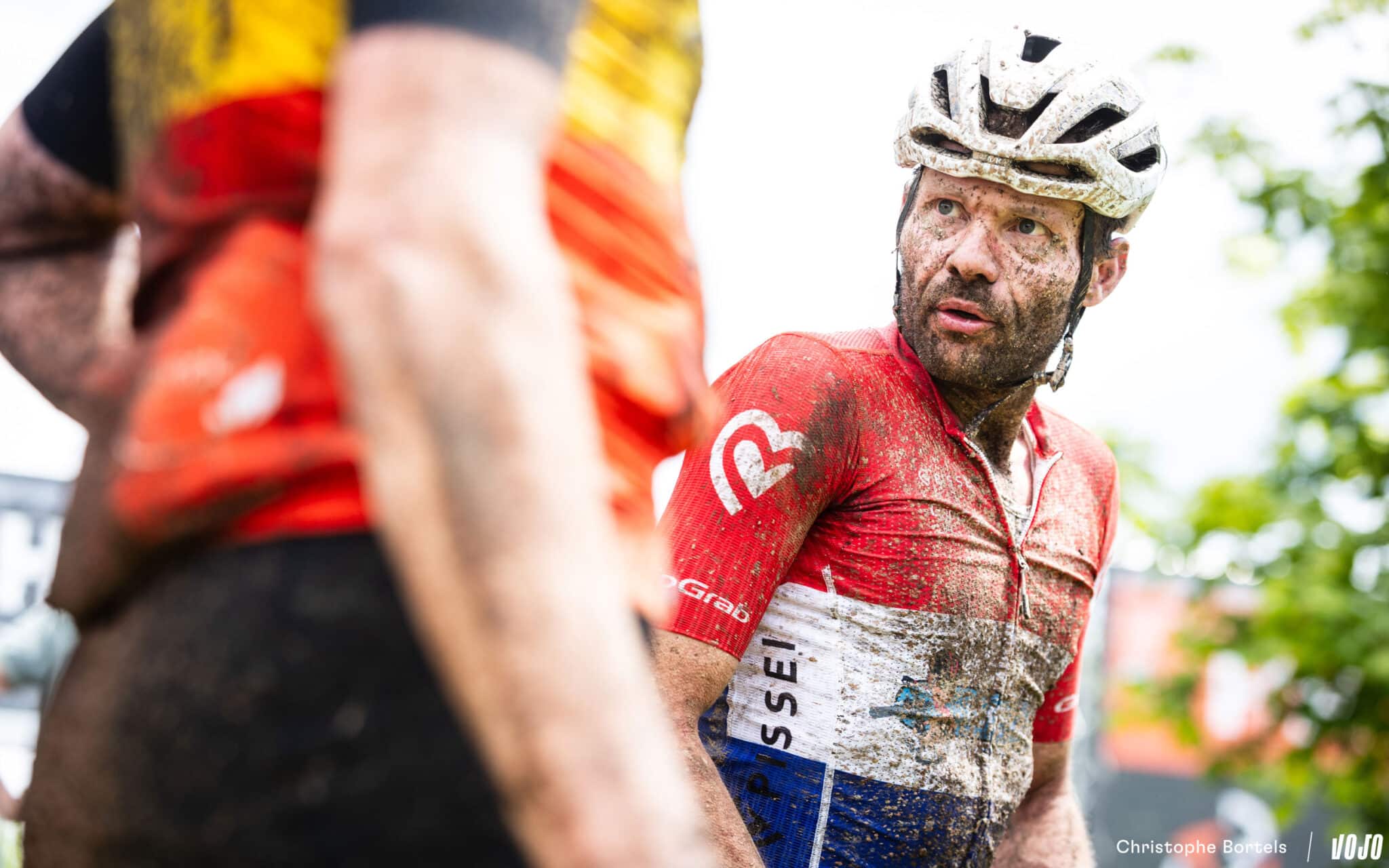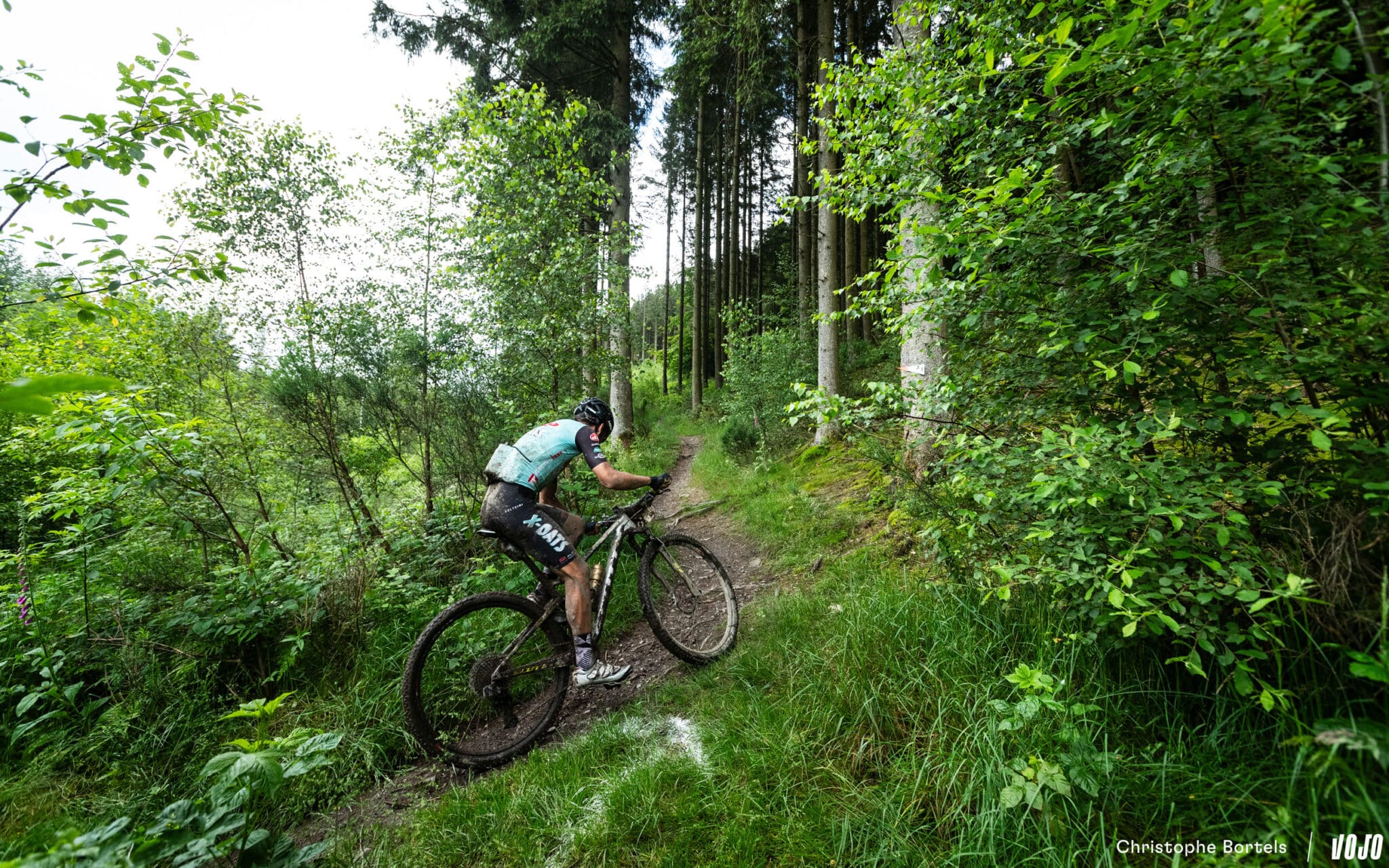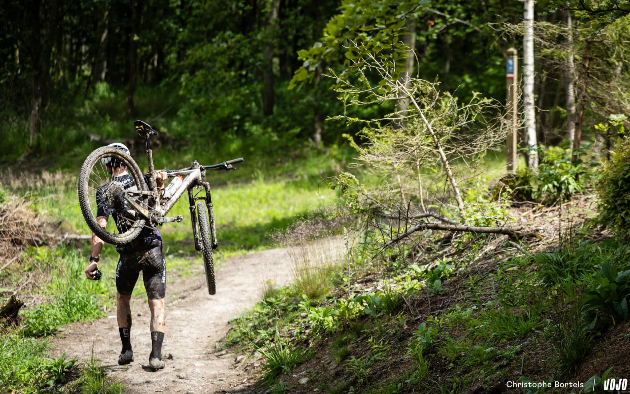 Décroché du groupe de tête, Bas Peters vient tout de même à bout de cette portion bien raide et bourrée de racines. Il faut dire qu’à l’occasion de la coupe à blanc, le sentier a été modifié, et qu’il est encore plus technique qu’avant…