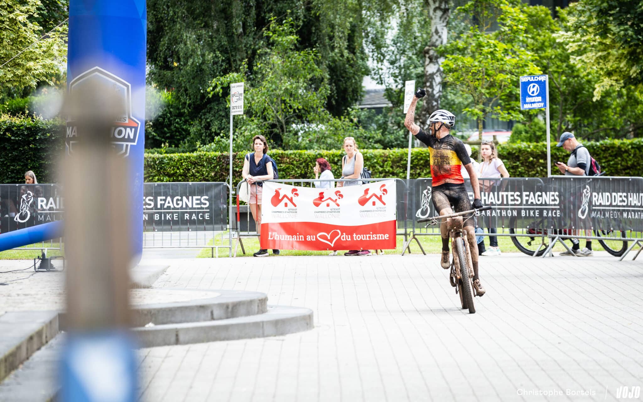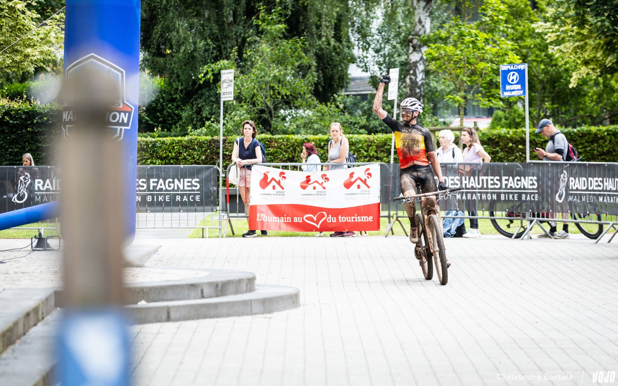 … et Joris franchit la ligne en premier ! Parti avec Erwin Bakker dans l’avant-dernière montée à quelques kilomètres de l’arrivée, il est ensuite parvenu à distancer le Néerlandais et a ainsi évité une arrivée au sprint, ce qui lui avait coûté la victoire il y a un mois à l’Ardennes Trophy. Il boucle ce Raid des Hautes Fagnes en 5h14 à une moyenne de 21,5 km/h. Pour l’anecdote, c’est le quatrième vainqueur différent en quatre manches sur ce BAMS 2024.