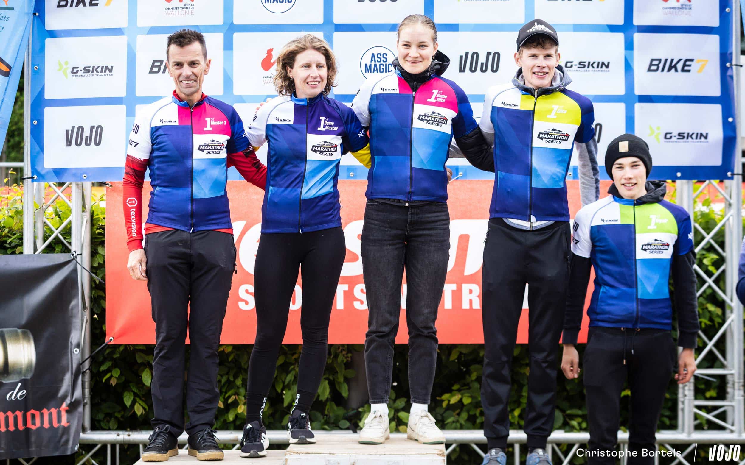 Les leaders du classement BAMS après deux des cinq manches de la saison : John Soenen (Master 3), Joyce Vanderbeken (Femmes Master), Julia Grégoire (Femmes Elite), Simon Grégoire (Elite) et Milan Stiens (U23). Bas Peters est leader chez les Master 2 et Thomas Sprengers mène en Master 1.