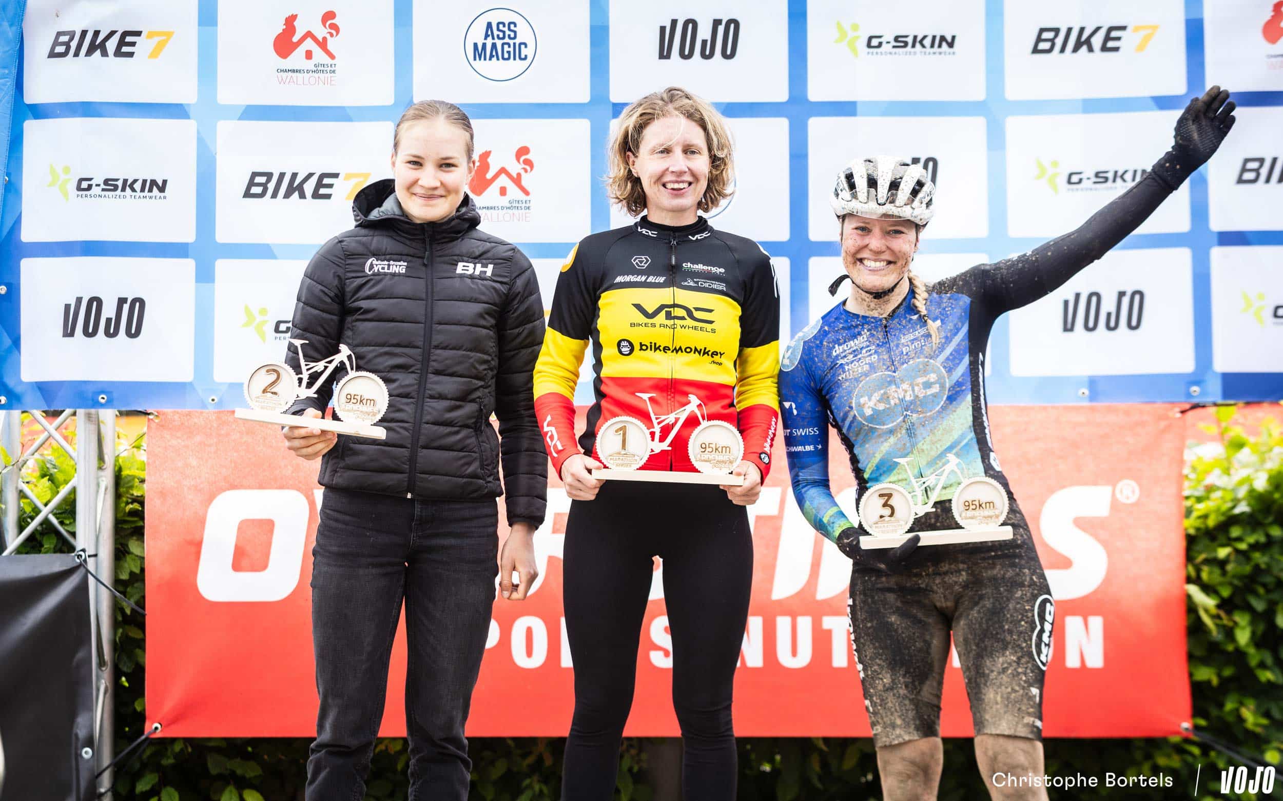 Comme prévu, ça a été disputé chez les femmes ! Julia Grégoire est parvenue plusieurs fois à distancer Joyce Vanderbeken dans les descente piégeuses, mais Joyce est parvenue à recoller… puis à accélérer en fin de course pour distancer Julia et la reléguer à 2 minutes sur la ligne d’arrivée.