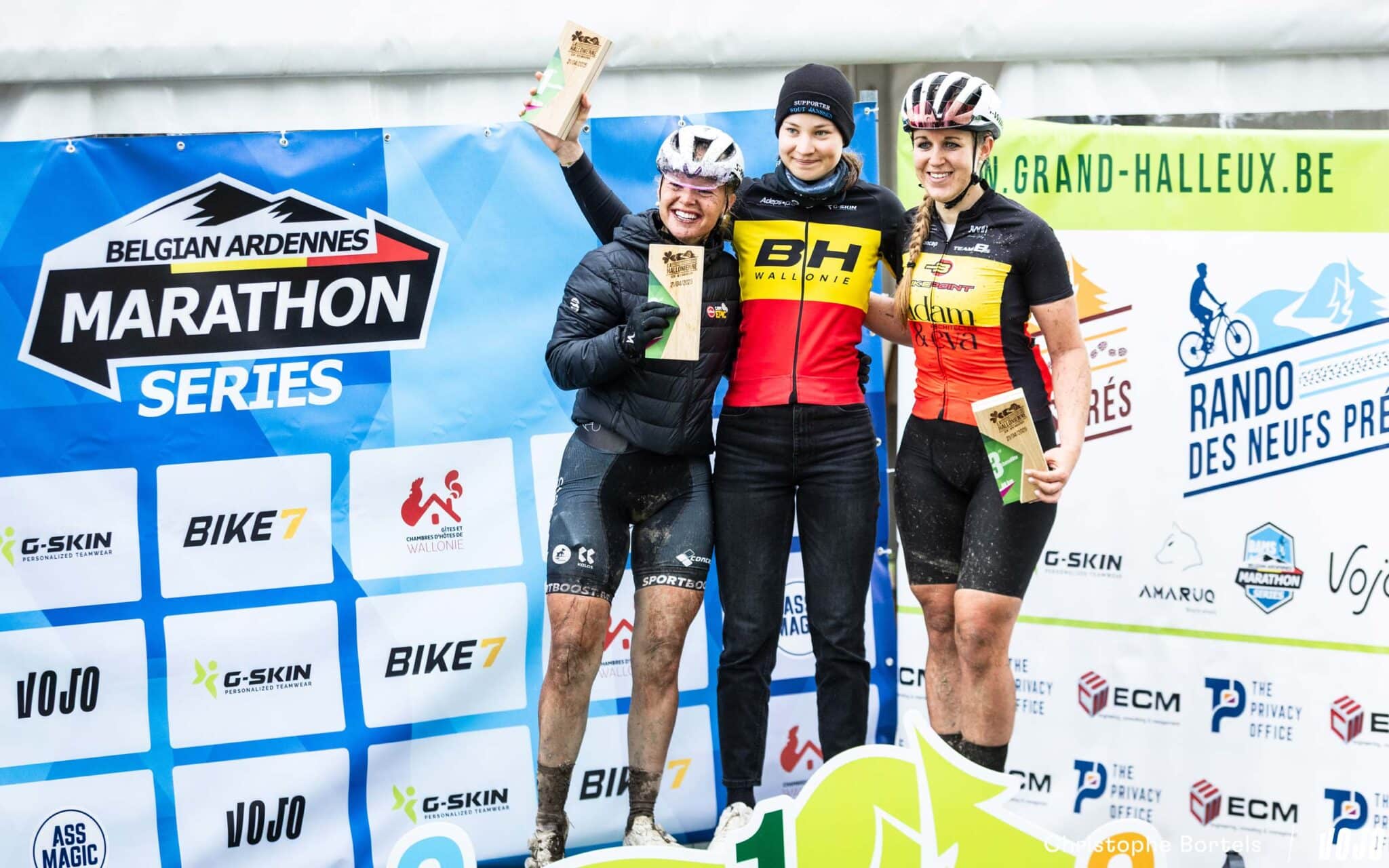 Les podiums des catégories femmes : Julia Grégoire devant Emma Van Der Stockt et Kimberly Peeters chez les femmes Elites, et Joyce Vanderbeken devant Cindy Volkerink et Daphny van den Brand (absente pour le podium) chez les femmes Master.