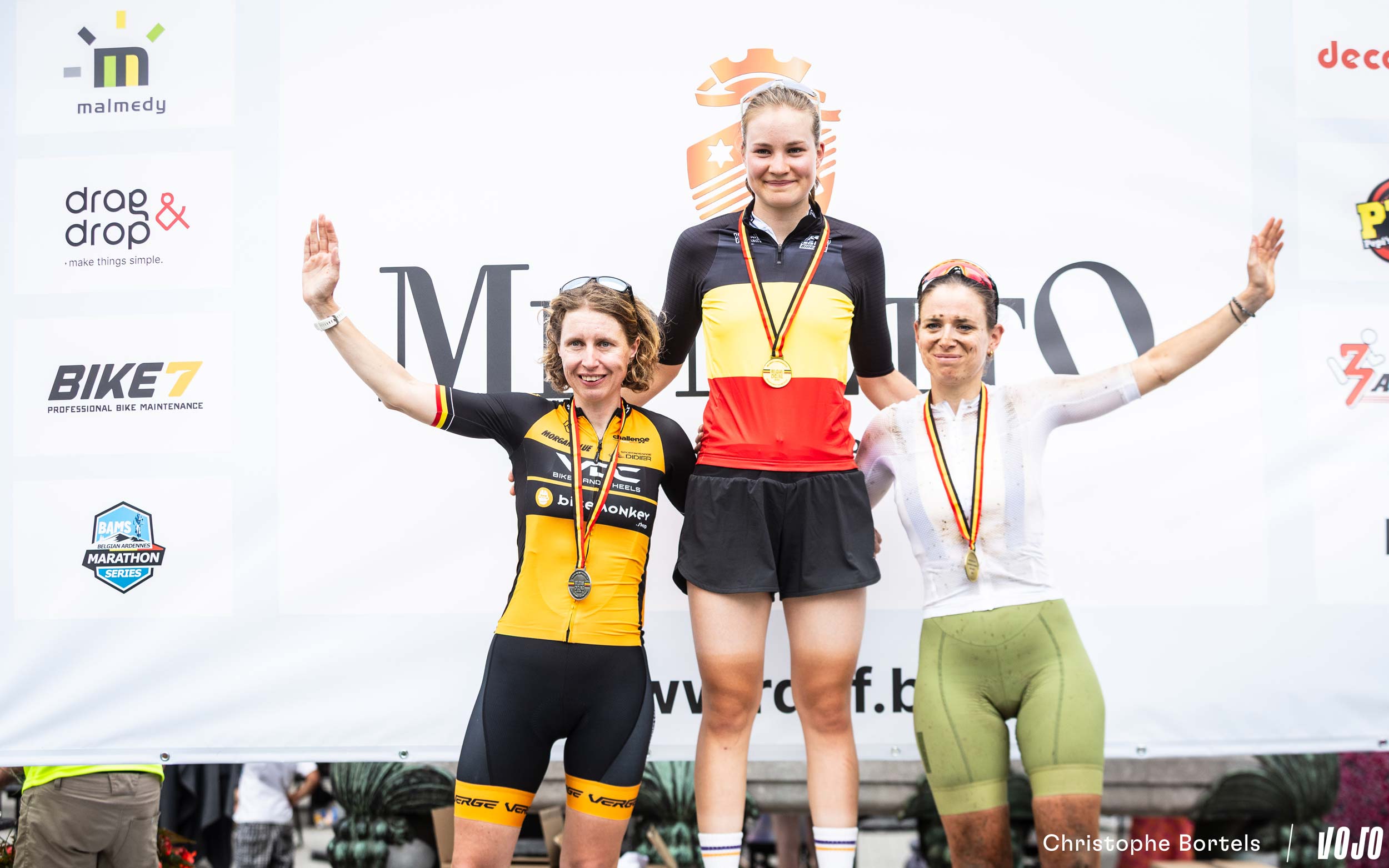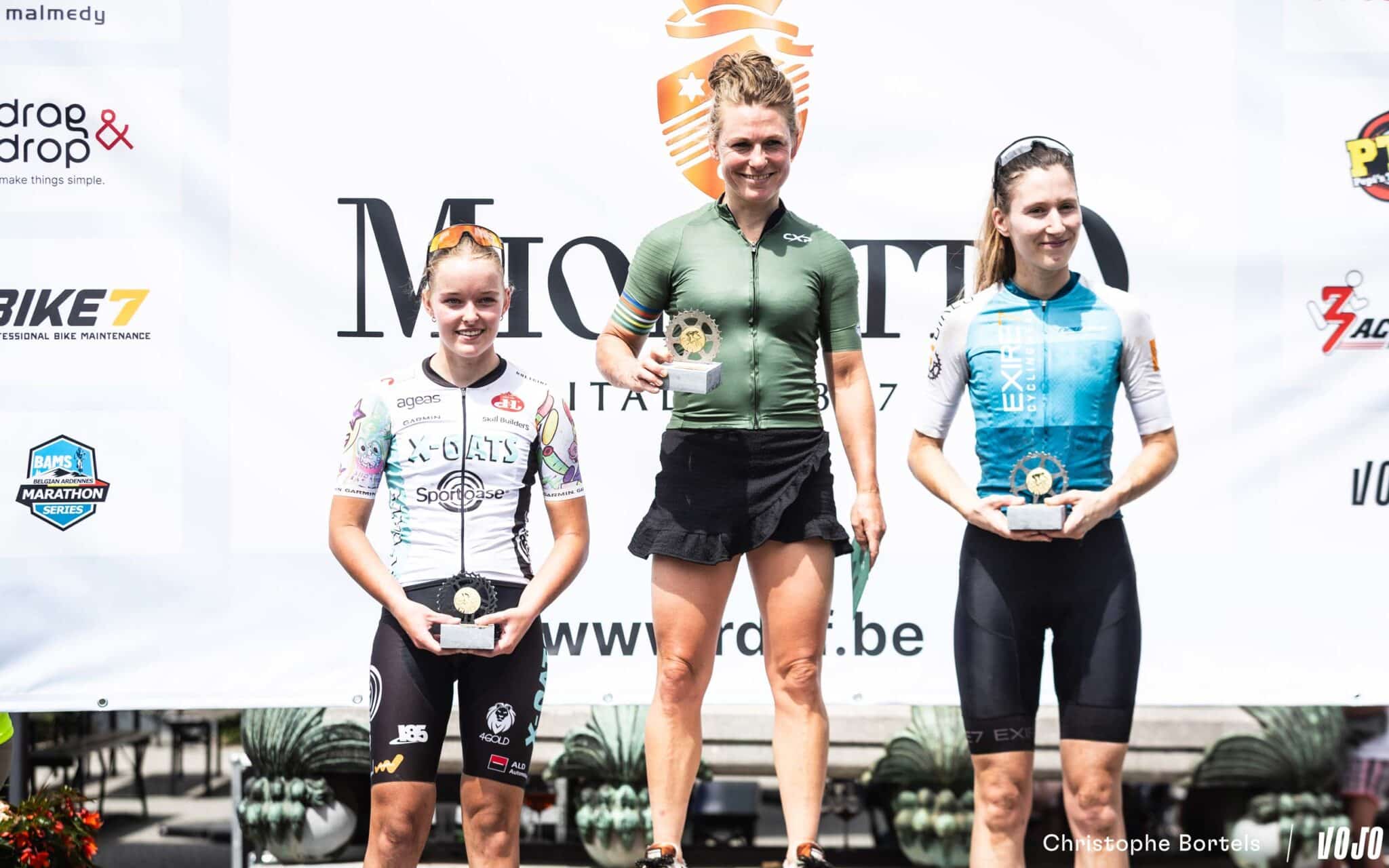 Le podium Femmes Elites des championnats de Belgique : Julia Grégoire avec Joyce Vanderbeken et Margot Bourguignon.