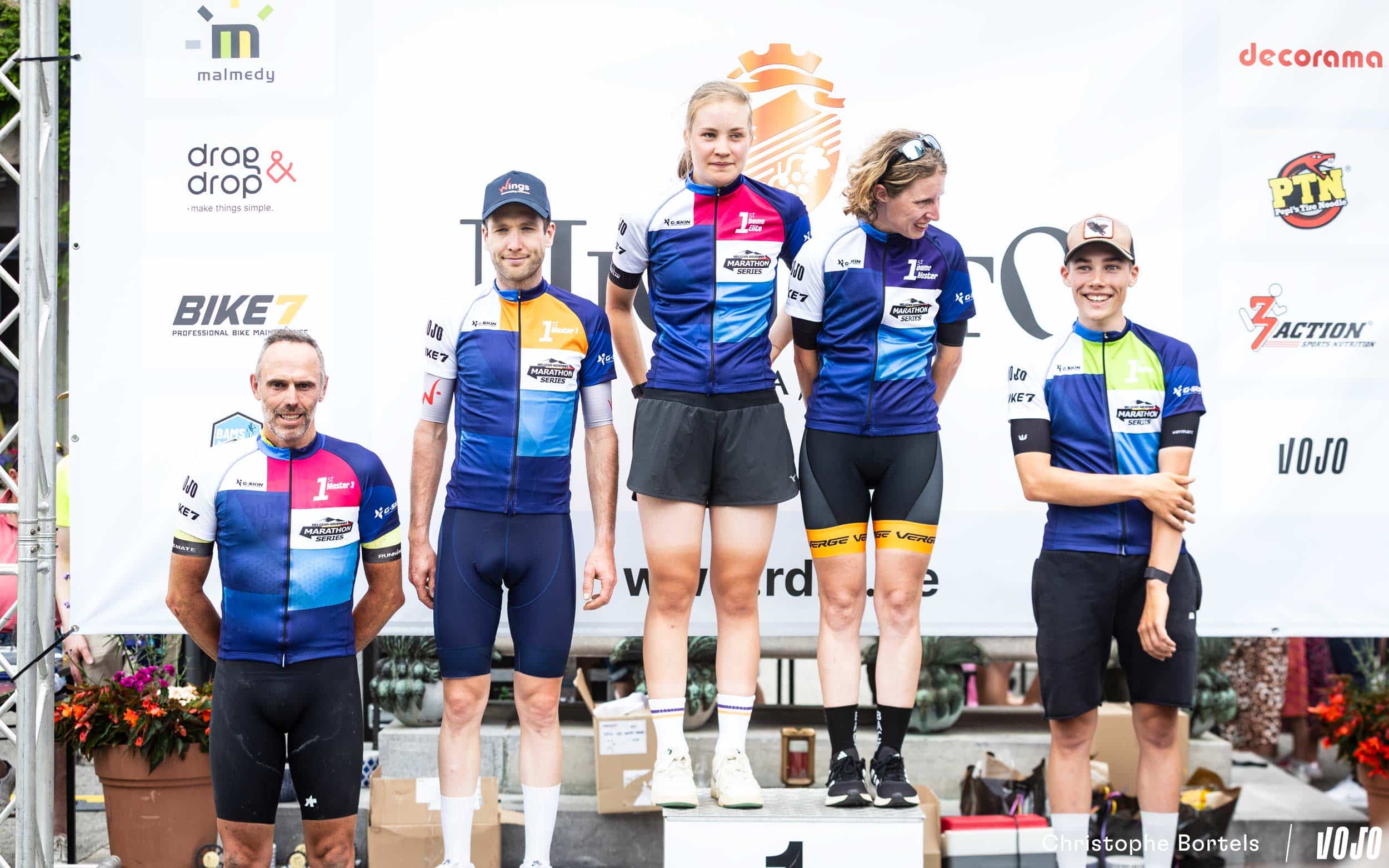 Avec tout ça, on en oublierait presque qu’il s’agissait aussi d’une manche du BAMS ! Les leaders après trois des cinq manches de la saison : Mario Vandenhoute (Master 3), Thomas Sprengers (Master 1), Julia Grégoire (Femmes Elites), Joyce Vanderbeken (Femmes Master) et Milan Stiens (U23). Simon Grégoire et Bas Peters (absents pour la photo) dominent quant à eux les classements Elite et Master 2.