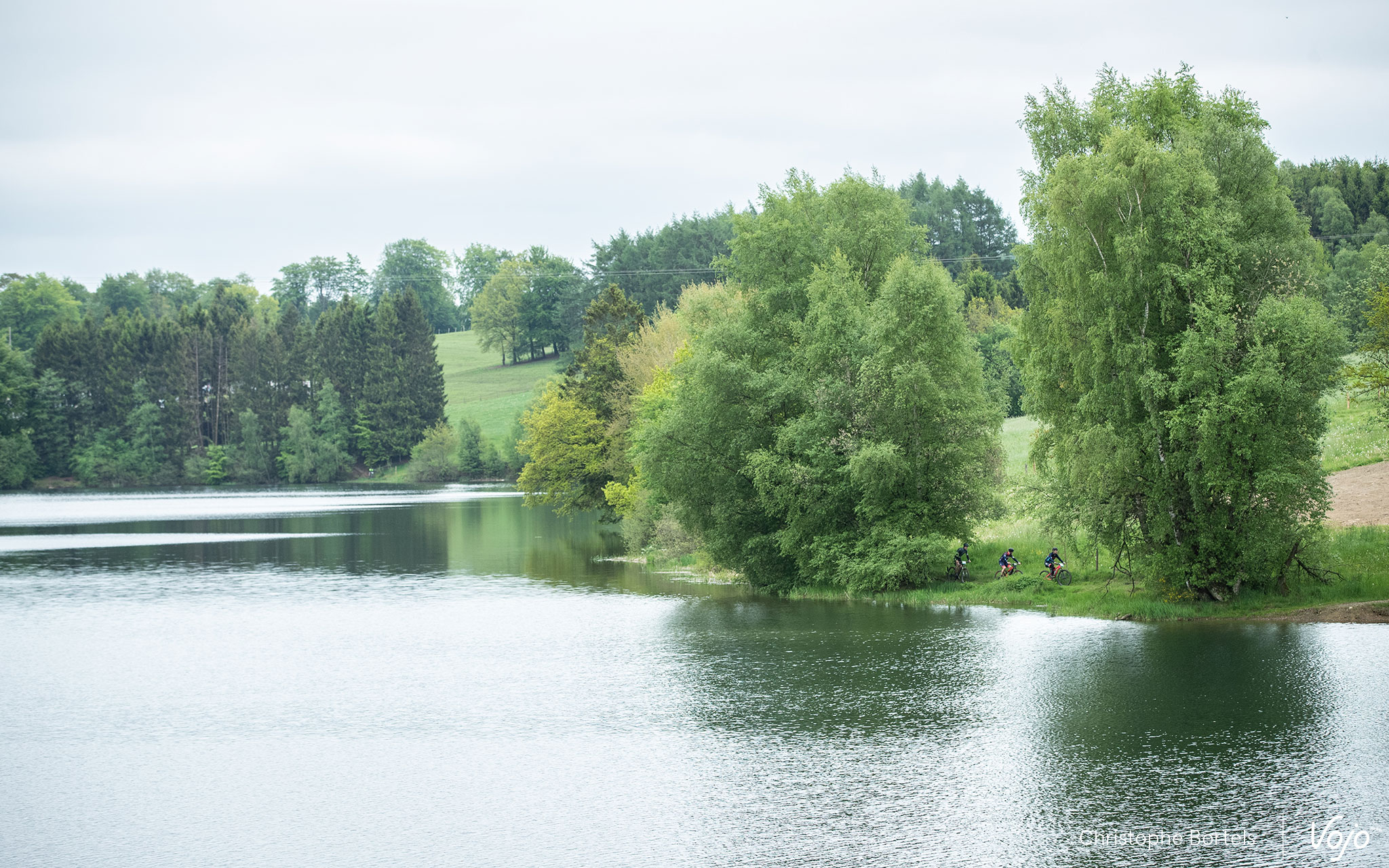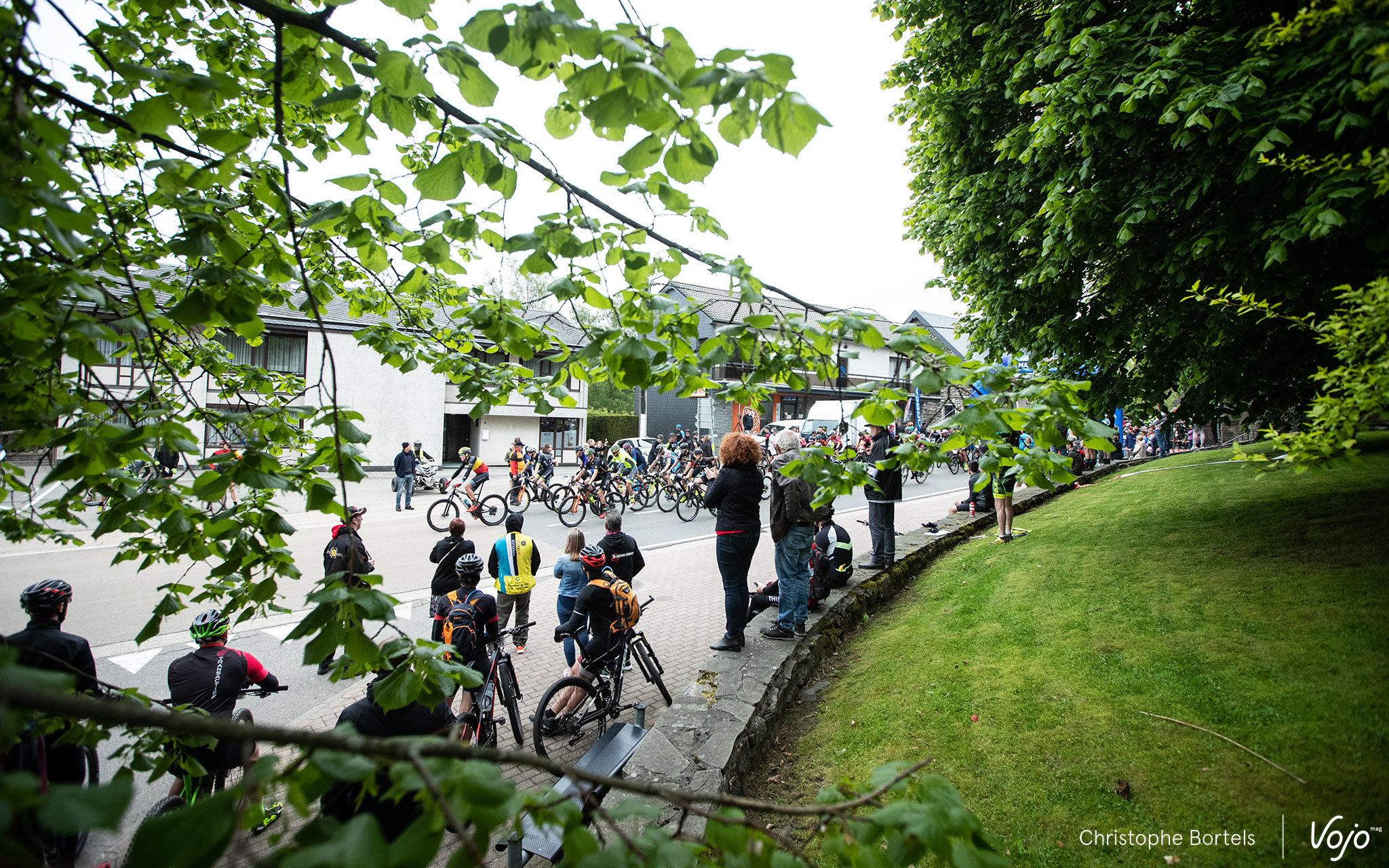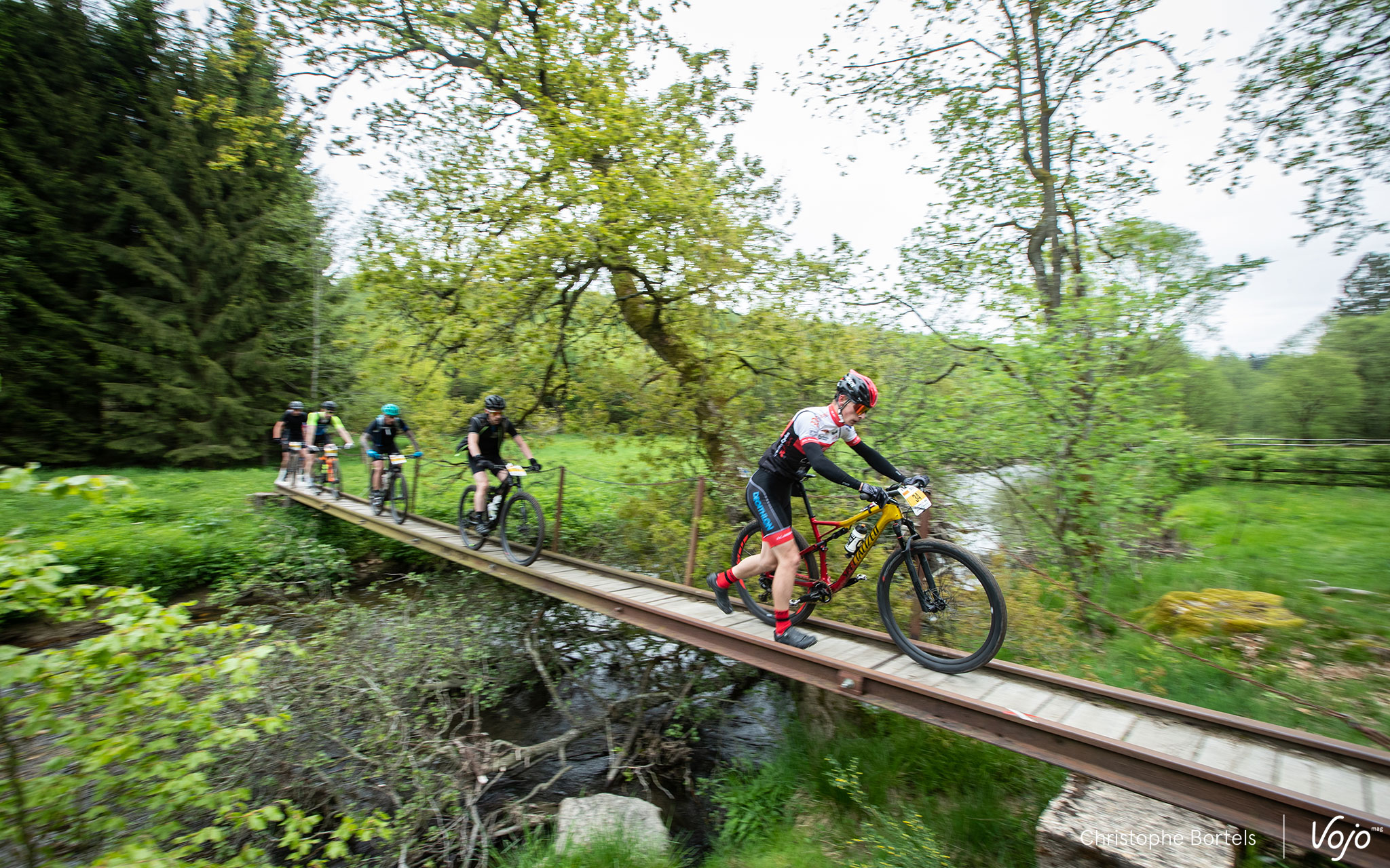 Après un départ roulant, on retrouve les coureurs sur ce petit pont étroit au coeur d’une nature magnifique. Si une majorité ne se pose pas de question et y va franchement sur le vélo, d’autres préfèrent passer à pied. Certains goûteront même à la fraîcheur de la rivière…