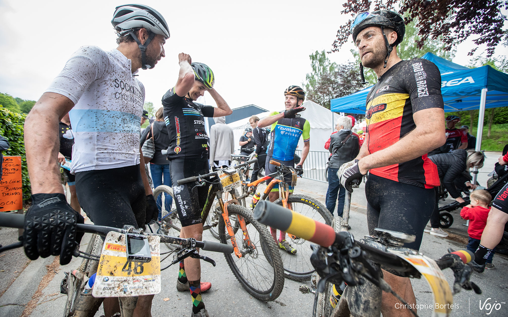 Au départ, on retrouve pas mal de têtes connues, parmi lesquelles Kevin van Hoovels (à gauche en blanc), Joris Massaer (au centre) et Wietse Bosmans (à droite), qui arbore enfin son maillot de champion de Belgique Elite.
