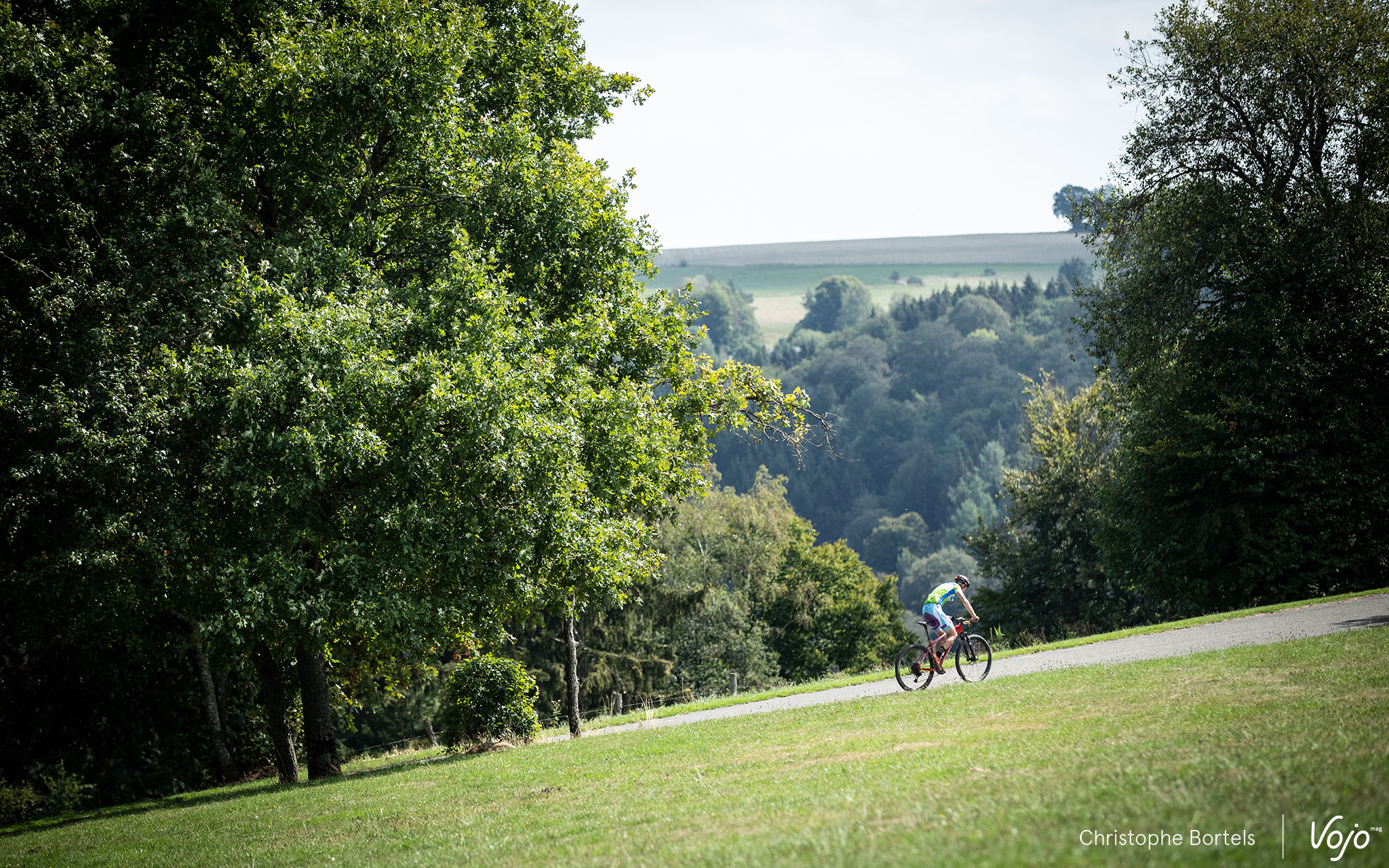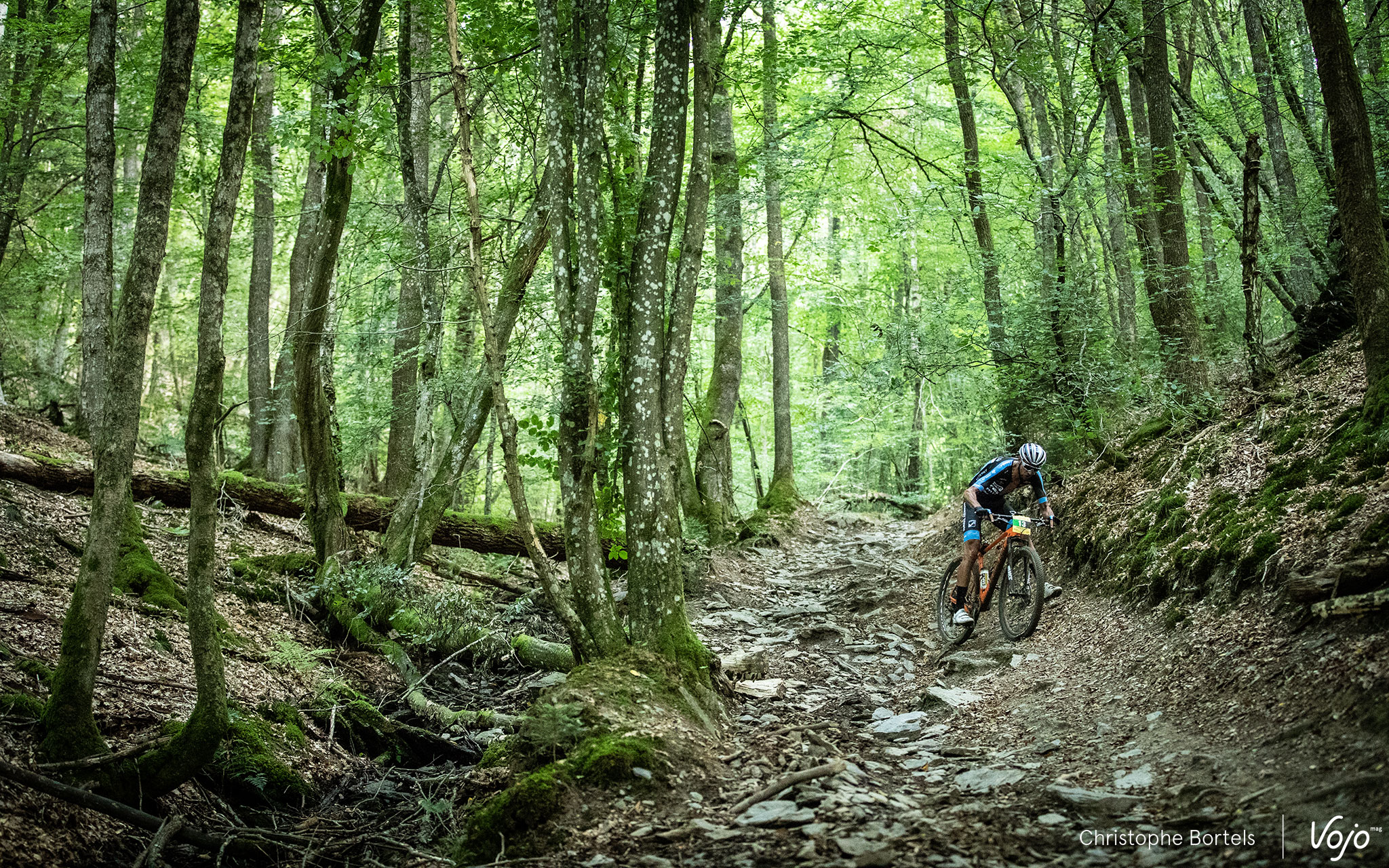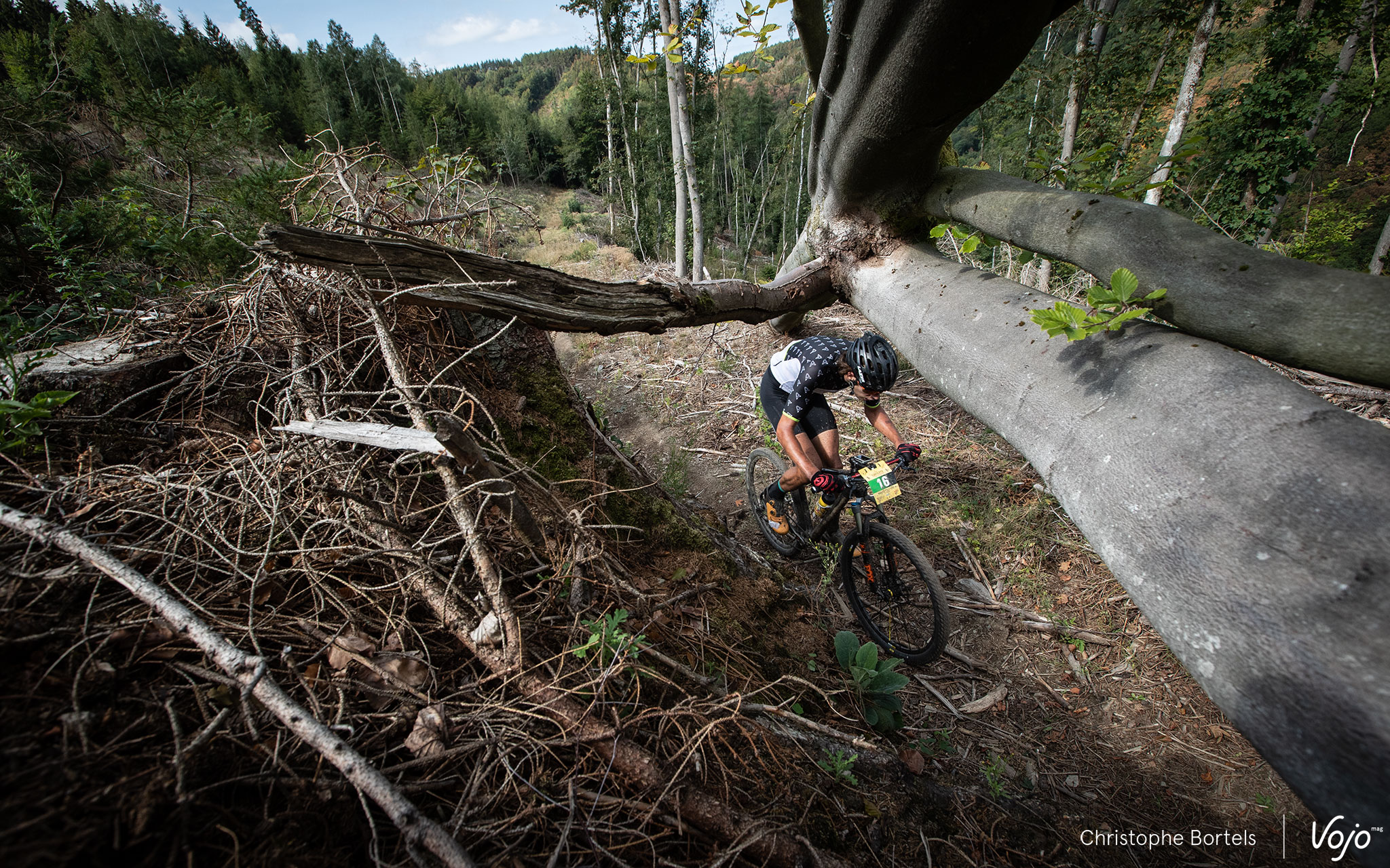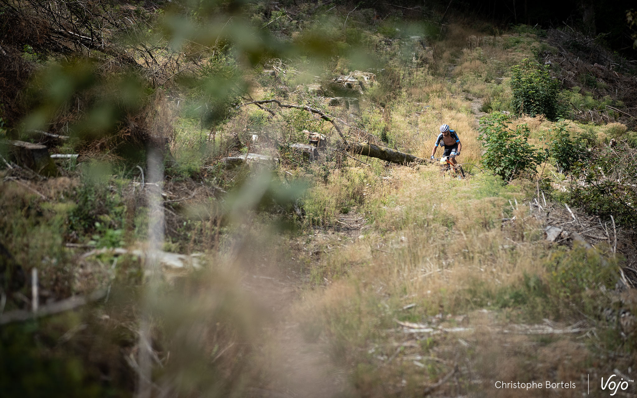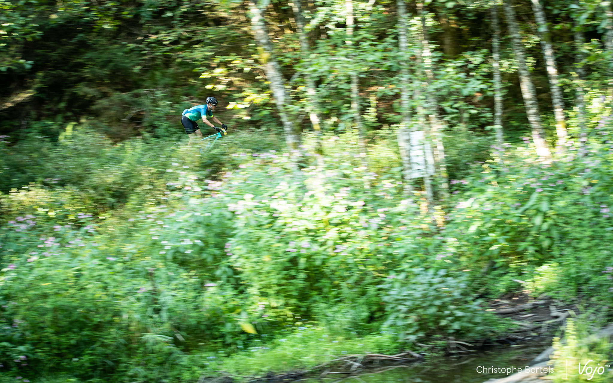 Un peu plus loin, on se pose brièvement dans cette superbe descente technique particulièrement délicate à négocier, même pour un prétendant au podium comme Jasper Ockeloen.